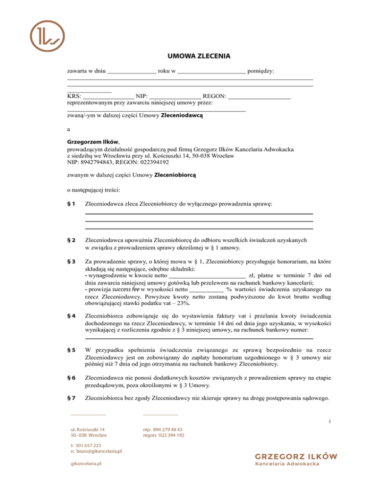 ! UMOWA ZLECENIA zawarta w dniu roku w pomiędzy: KRS: NIP: REGON: reprezentowanym przy zawarciu niniejszej umowy przez: zwaną/-ym w dalszej części Umowy Zleceniodawcą ! ! a Grzegorzem Ilków, prowadzącym działalność gospodarczą pod firmą Grzegorz Ilków Kancelaria Adwokacka z siedzibą we Wrocławiu przy ul. Kościuszki 14, 50-038 Wrocław NIP: 8942794843, REGON: 022394192 ! ! ! zwanym w dalszej części Umowy Zleceniobiorcą o następującej treści: §1 Zleceniodawca zleca Zleceniobiorcy do wyłącznego prowadzenia sprawę: ! ! §2 Zleceniodawca upoważnia Zleceniobiorcę do odbioru wszelkich świadczeń uzyskanych w związku z prowadzeniem sprawy określonej w § 1 umowy. §3 Za prowadzenie sprawy, o której mowa w § 1, Zleceniobiorcy przysługuje honorarium, na które składają się następujące, odrębne składniki: - wynagrodzenie w kwocie netto zł, płatne w terminie 7 dni od dnia zawarcia niniejszej umowy gotówką lub przelewem na rachunek bankowy kancelarii; - prowizja success fee w wysokości netto % wartości świadczenia uzyskanego na rzecz Zleceniodawcy. Powyższe kwoty netto zostaną podwyższone do kwot brutto według obowiązującej stawki podatku vat – 23%. §4 ! §5 ! ! ! Zleceniobiorca zobowiązuje się do wystawienia faktury vat i przelania kwoty świadczenia dochodzonego na rzecz Zleceniodawcy, w terminie 14 dni od dnia jego uzyskania, w wysokości wynikającej z rozliczenia zgodnie z § 3 niniejszej umowy, na rachunek bankowy numer: W przypadku spełnienia świadczenia związanego ze sprawą bezpośrednio na rzecz Zleceniodawcy jest on zobowiązany do zapłaty honorarium uzgodnionego w § 3 umowy nie później niż 7 dnia od jego otrzymania na rachunek bankowy Zleceniobiorcy. §6 Zleceniodawca nie ponosi dodatkowych kosztów związanych z prowadzeniem sprawy na etapie przedsądowym, poza określonymi w § 3 Umowy. §7 Zleceniobiorca bez zgody Zleceniodawcy nie skieruje sprawy na drogę postępowania sądowego. )1 ! ! ! §8 §9 ! W przypadku skierowania sprawy na drogę postępowania sądowego, Zleceniodawca zobowiązany jest pokryć wszelkie koszty procesu, w tym w szczególności: koszt opłaty sądowej od pozwu (5% wartości roszczenia) i opłaty skarbowej od pełnomocnictwa (17 zł), koszty zaliczek na poczet opinii biegłych sądowych (w wysokości ustalonej przez sąd), koszty dojazdu pełnomocnika do sądu poza miejscem siedziby kancelarii (ustalonych według przepisów o kosztach podróży służbowych na terenie kraju) lub koszty pełnomocnika substytucyjnego. Zasądzone koszty zastępstwa procesowego przypadają w całości na rzecz Zleceniobiorcy i stanowią jego wynagrodzenie. § 10 Zleceniodawca zobowiązuje się do nie podejmowania bez konsultacji ze Zleceniobiorcą żadnych czynności dotyczących zleconej sprawy. Zleceniobiorca nie zawrze ugody w sprawie bez zgody Zleceniodawcy. § 11 W sprawach Cywilnego. nieuregulowanych niniejszą umową zastosowanie mają przepisy Kodeksu ! ! ! ! ! § 12 Wszelkie zmiany dotyczące postanowień umowy wymagają formy pisemnej pod rygorem nieważności. § 13 Umowę spisano w 2 jednobrzmiących egzemplarzach, po jednym dla każdej ze Stron. ! ! ! ! ! ! ! ! ! ! ! ! Zleceniodawca Zleceniobiorca )2
