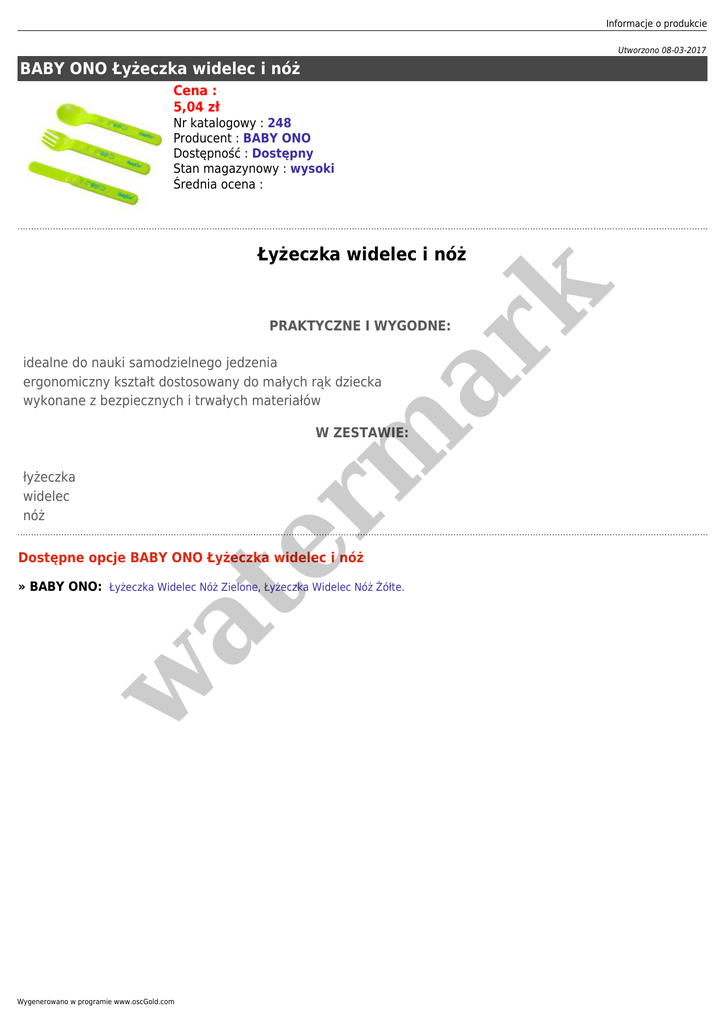 Informacje o produkcie Utworzono 08-03-2017 BABY ONO Łyżeczka widelec i nóż Cena : 5,04 zł Nr katalogowy : 248 Producent : BABY ONO Dostępność : Dostępny Stan magazynowy : wysoki Średnia ocena : er m ar k Łyżeczka widelec i nóż PRAKTYCZNE I WYGODNE: idealne do nauki samodzielnego jedzenia ergonomiczny kształt dostosowany do małych rąk dziecka wykonane z bezpiecznych i trwałych materiałów W ZESTAWIE: łyżeczka widelec nóż Dostępne opcje BABY ONO Łyżeczka widelec i nóż w at » BABY ONO: Łyżeczka Widelec Nóż Zielone, Łyżeczka Widelec Nóż Żółte. Wygenerowano w programie www.oscGold.com