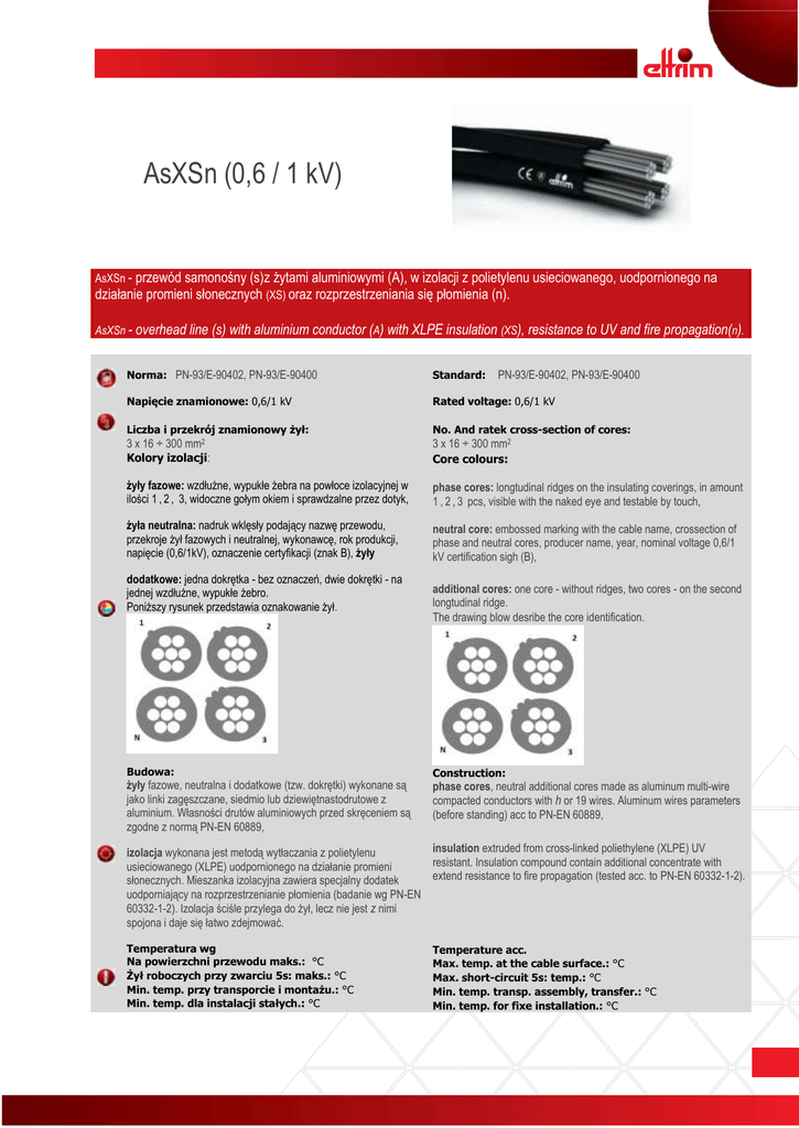 AsXSn (0,6 / 1 kV) AsXSn - przewód samonośny (s)z żytami aluminiowymi (A), w izolacji z polietylenu usieciowanego, uodpornionego na działanie promieni słonecznych (XS) oraz rozprzestrzeniania się płomienia (n). AsXSn - overhead line (s) with aluminium conductor (A) with XLPE insulation (XS), resistance to UV and fire propagation(n). Norma: PN-93/E-90402, PN-93/E-90400 Standard: Napięcie znamionowe: 0,6/1 kV Rated voltage: 0,6/1 kV Liczba i przekrój znamionowy żył: No. And ratek cross-section of cores: 3 x 16 ÷ 300 mm2 3 x 16 ÷ 300 mm2 Kolory izolacji: Core colours: żyły fazowe: wzdłużne, wypukłe żebra na powłoce izolacyjnej w ilości 1 , 2 , 3, widoczne gołym okiem i sprawdzalne przez dotyk, phase cores: longtudinal ridges on the insulating coverings, in amount 1 , 2 , 3 pcs, visible with the naked eye and testable by touch, żyła neutralna: nadruk wklęsły podający nazwę przewodu, przekroje żył fazowych i neutralnej, wykonawcę, rok produkcji, napięcie (0,6/1kV), oznaczenie certyfikacji (znak B), żyły neutral core: embossed marking with the cable name, crossection of phase and neutral cores, producer name, year, nominal voltage 0,6/1 kV certification sigh (B), dodatkowe: jedna dokrętka - bez oznaczeń, dwie dokrętki - na jednej wzdłużne, wypukłe żebro. Poniższy rysunek przedstawia oznakowanie żył. Budowa: żyły fazowe, neutralna i dodatkowe (tzw. dokrętki) wykonane są jako linki zagęszczane, siedmio lub dziewiętnastodrutowe z aluminium. Własności drutów aluminiowych przed skręceniem są zgodne z normą PN-EN 60889, PN-93/E-90402, PN-93/E-90400 additional cores: one core - without ridges, two cores - on the second longtudinal ridge. The drawing blow desribe the core identification. Construction: phase cores, neutral additional cores made as aluminum multi-wire compacted conductors with h or 19 wires. Aluminum wires parameters (before standing) acc to PN-EN 60889, insulation extruded from cross-linked poliethylene (XLPE) UV izolacja wykonana jest metodą wytłaczania z polietylenu resistant. Insulation compound contain additional concentrate with usieciowanego (XLPE) uodpornionego na działanie promieni extend resistance to fire propagation (tested acc. to PN-EN 60332-1-2). słonecznych. Mieszanka izolacyjna zawiera specjalny dodatek uodporniający na rozprzestrzenianie płomienia (badanie wg PN-EN 60332-1-2). Izolacja ściśle przylega do żył, lecz nie jest z nimi spojona i daje się łatwo zdejmować. Temperatura wg Na powierzchni przewodu maks.: °C Żył roboczych przy zwarciu 5s: maks.: °C Min. temp. przy transporcie i montażu.: °C Min. temp. dla instalacji stałych.: °C Temperature acc. Max. temp. at the cable surface.: °C Max. short-circuit 5s: temp.: °C Min. temp. transp. assembly, transfer.: °C Min. temp. for fixe installation.: °C Opakowanie: Bębny drewniane (wielkość bębnów oraz długości odcinków należy uzgodnić przy zamówieniu). Packing: Wooden drums (size of the drum and cable lenghts should be agreed during ordering). _________________________________ Producent zastrzega możliwość zmian bez informowania klienta Dane techniczne/Technical data – AsXSn (0,6 / 1 kV) Typowymiar Przybliżona średnica wiązki Przybliżony ciężar Obliczeniowa minimalna siła zrywająca wiązki Crossection Outer diamener approx Weight approx :. Calculated min. core breaking force mm Kg/km kN 1 x 25 8,7 98 4,0 1 x 35 9,8 130 5,6 1 x 50 11,6 183 8,0 1 x 70 13,0 242 11,2 2 x 16 14,2 142 5,0 2 x 25 17,4 211 7,8 2 x 35 19,6 263 11,0 4 x 16 17,2 270 9,8 4 x 25 21,0 401 15,4 4 x 35 23,7 529 21,5 4 x 50 28,0 744 30,7 4 x 70 31,5 980 43,0 4 x 95 36,0 1319 58,4 4 x 120 39,7 1625 73,7 4 x 35 + 25 4 x 50 + 25 4 x 70 + 25 4 x 95 + 25 4 x 120 + 25 4 x 35 + 35 4 x 50 + 35 4 x 70 + 35 4 x 95 + 35 4 x 120 + 35 4 x 50 + 2 x 25 4 x 70 + 2 x 25 4 x 95 + 2 x 25 4 x 120 + 2 x 25 4 x 50 + 2 x 35 4 x 70 + 2 x 35 4 x 95 + 2 x 35 4 x 120 + 2 x 35 25,0 29,0 33,5 38,0 41,0 25,5 29,5 34,0 38,5 41,5 30,0 34,0 39,0 42,0 31,0 34,0 39,5 43,0 634 848 1085 1424 1730 660 874 1111 1450 1756 954 1191 1529 1835 1006 1243 1582 1887 21,5 30,7 43,0 58,4 73,7 21,5 30,7 43,0 58,4 73,7 30,7 43,0 58,4 73,7 30,7 43,0 58,4 73,7 Informacje zawarte w tej karcie katalogowej włącznie z danymi zawartymi w tabelach oraz szkicami / rysunkami zostały podane w dobrej wierze i w przeświadczeniu o ich poprawności w czasie publikacji. Jednakże informacje te nie stanowią zarówno gwarancji ani tez podstawy do ponoszenia odpowiedzialności prawnej przez Z.P.P.E Eltrim Sp. z o.o. Ponadto Z.P.P.E Eltrim Sp. z o.o rezerwuje prawo do wprowadzenia zmian w dokumencie w każdej chwili. Ogólne warunki sprzedaży dostępne są na stronie www.eltrim.com.pl. Information contained in this catalogues card including data sheets and drafts were placed in good will and in belief that they were correct in the time of publishing. But this information is not the warranty or basis to law responsibility. Z.P.P.E Eltrim Sp. z.o.o. reserve the right to change data in this document at any time. General conditions of sale are available on our website www.eltrim.com.pl.