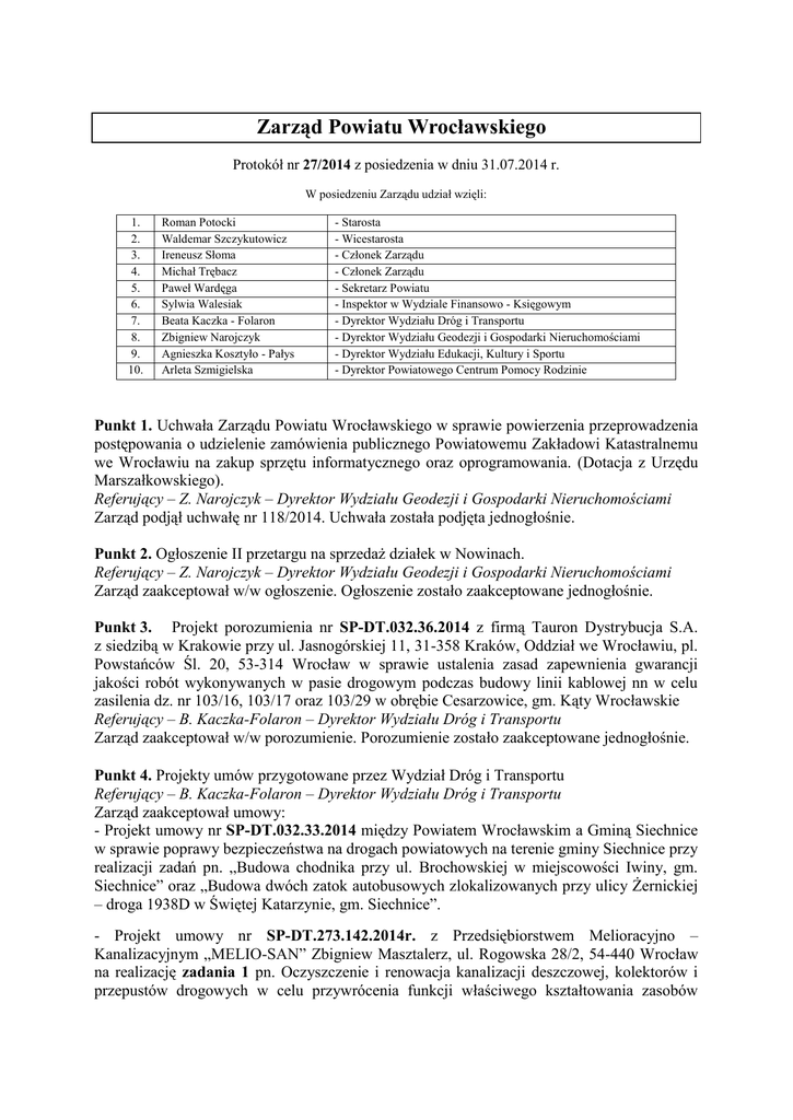 Zarząd Powiatu Wrocławskiego Protokół nr 27/2014 z posiedzenia w dniu 31.07.2014 r. W posiedzeniu Zarządu udział wzięli: 1. 2. 3. 4. 5. 6. 7. 8. 9. 10. Roman Potocki Waldemar Szczykutowicz Ireneusz Słoma Michał Trębacz Paweł Wardęga Sylwia Walesiak Beata Kaczka - Folaron Zbigniew Narojczyk Agnieszka Kosztyło - Pałys Arleta Szmigielska - Starosta - Wicestarosta - Członek Zarządu - Członek Zarządu - Sekretarz Powiatu - Inspektor w Wydziale Finansowo - Księgowym - Dyrektor Wydziału Dróg i Transportu - Dyrektor Wydziału Geodezji i Gospodarki Nieruchomościami - Dyrektor Wydziału Edukacji, Kultury i Sportu - Dyrektor Powiatowego Centrum Pomocy Rodzinie Punkt 1. Uchwała Zarządu Powiatu Wrocławskiego w sprawie powierzenia przeprowadzenia postępowania o udzielenie zamówienia publicznego Powiatowemu Zakładowi Katastralnemu we Wrocławiu na zakup sprzętu informatycznego oraz oprogramowania. (Dotacja z Urzędu Marszałkowskiego). Referujący – Z. Narojczyk – Dyrektor Wydziału Geodezji i Gospodarki Nieruchomościami Zarząd podjął uchwałę nr 118/2014. Uchwała została podjęta jednogłośnie. Punkt 2. Ogłoszenie II przetargu na sprzedaż działek w Nowinach. Referujący – Z. Narojczyk – Dyrektor Wydziału Geodezji i Gospodarki Nieruchomościami Zarząd zaakceptował w/w ogłoszenie. Ogłoszenie zostało zaakceptowane jednogłośnie. Punkt 3. Projekt porozumienia nr SP-DT.032.36.2014 z firmą Tauron Dystrybucja S.A. z siedzibą w Krakowie przy ul. Jasnogórskiej 11, 31-358 Kraków, Oddział we Wrocławiu, pl. Powstańców Śl. 20, 53-314 Wrocław w sprawie ustalenia zasad zapewnienia gwarancji jakości robót wykonywanych w pasie drogowym podczas budowy linii kablowej nn w celu zasilenia dz. nr 103/16, 103/17 oraz 103/29 w obrębie Cesarzowice, gm. Kąty Wrocławskie Referujący – B. Kaczka-Folaron – Dyrektor Wydziału Dróg i Transportu Zarząd zaakceptował w/w porozumienie. Porozumienie zostało zaakceptowane jednogłośnie. Punkt 4. Projekty umów przygotowane przez Wydział Dróg i Transportu Referujący – B. Kaczka-Folaron – Dyrektor Wydziału Dróg i Transportu Zarząd zaakceptował umowy: - Projekt umowy nr SP-DT.032.33.2014 między Powiatem Wrocławskim a Gminą Siechnice w sprawie poprawy bezpieczeństwa na drogach powiatowych na terenie gminy Siechnice przy realizacji zadań pn. „Budowa chodnika przy ul. Brochowskiej w miejscowości Iwiny, gm. Siechnice” oraz „Budowa dwóch zatok autobusowych zlokalizowanych przy ulicy Żernickiej – droga 1938D w Świętej Katarzynie, gm. Siechnice”. - Projekt umowy nr SP-DT.273.142.2014r. z Przedsiębiorstwem Melioracyjno – Kanalizacyjnym „MELIO-SAN” Zbigniew Masztalerz, ul. Rogowska 28/2, 54-440 Wrocław na realizację zadania 1 pn. Oczyszczenie i renowacja kanalizacji deszczowej, kolektorów i przepustów drogowych w celu przywrócenia funkcji właściwego kształtowania zasobów wodnych oraz ochrony przed zanieczyszczeniami, na terenie Obwodu Drogowego w Sulimowie” - Projekt umowy nr SP-DT.273.143.2014r. z Przedsiębiorstwem Melioracyjno – Kanalizacyjnym „MELIO-SAN” Zbigniew Masztalerz, ul. Rogowska 28/2, 54-440 Wrocław na realizację zadania 2 pn. Oczyszczenie i renowacja kanalizacji deszczowej, kolektorów i przepustów drogowych w celu przywrócenia funkcji właściwego kształtowania zasobów wodnych oraz ochrony przed zanieczyszczeniami, na terenie Obwodu Drogowego w Mirosławicach”. Umowy zostały zaakceptowane jednogłośnie. Punkt 5. Wniosek Komisji Przetargowej powołanej uchwałą nr 98/2014 Zarządu Powiatu Wrocławskiego z dnia 2 lipca 2014 r. w sprawie zwiększenia kosztów niezbędnych do udzielenia zamówienia publicznego w trybie przetargu nieograniczonego oraz w sprawie udzielenia zamówienia publicznego – na postępowanie przetargowe o nazwie: „Wykonanie jednostronnego chodnika wraz z opracowaniem koncepcji kompleksowej przebudowy drogi powiatowej nr 1971D (ul. Tyniecka) w miejscowości Domasław oraz wykonanie dokumentacji projektowej w podziale na 3 zadania”. Referujący – B. Kaczka-Folaron – Dyrektor Wydziału Dróg i Transportu Zarząd zaakceptował w/w wniosek. Wniosek został zaakceptowany jednogłośnie. Punkt 6. Wniosek Komisji Przetargowej powołanej uchwałą nr 99/2014 Zarządu Powiatu Wrocławskiego z dnia 2 lipca 2014 r. w sprawie zwiększenia kosztów niezbędnych do udzielenia zamówienia publicznego w trybie przetargu nieograniczonego oraz w sprawie udzielenia zamówienia publicznego – na postępowanie przetargowe o nazwie: „Przebudowa odcinka drogi powiatowej nr 1967D w miejscowości Jordanów Śląski, w systemie zaprojektuj i wybuduj”. Referujący – B. Kaczka-Folaron – Dyrektor Wydziału Dróg i Transportu Zarząd zaakceptował w/w wniosek. Wniosek został zaakceptowany jednogłośnie. Punkt 7. Projekt uchwały Zarządu Powiatu Wrocławskiego w sprawie powołania komisji przetargowej do przeprowadzenia postępowania o udzielenie zamówienia publicznego – Wykonanie remontów cząstkowych masą mineralno – asfaltową na gorąco na terenie gmin Długołęka i Czernica”. Referujący – B. Kaczka-Folaron – Dyrektor Wydziału Dróg i Transportu Zarząd podjął uchwałę nr 119/2014. Uchwała została zaakceptowana jednogłośnie. Punkt 8. Wniosek Dyrektora Powiatowego Zespołu Szkół Nr 1 w Krzyżowicach o wyrażenie zgody na dokonanie wydatków z wyodrębnionego rachunku dochodów i wydatków PZS Nr 1 na zakup usług remontowych pomieszczeń znajdujących się przy kuchni PZS Nr 1 oraz zakup artykułów żywnościowych. Referujący – A. Kosztyło - Pałys – Dyrektor Wydziału Edukacji, Kultury i Sportu Zarząd jednogłośnie zaakceptował dokonanie wydatków z wyodrębnionego rachunku dochodów i wydatków PZS Nr 1 na zakup usług remontowych pomieszczeń znajdujących się przy kuchni PZS1. Wniosek dotyczący zakupu artykułów żywnościowych zostanie rozpatrzony na kolejnym posiedzeniu Zarządu po zapozna