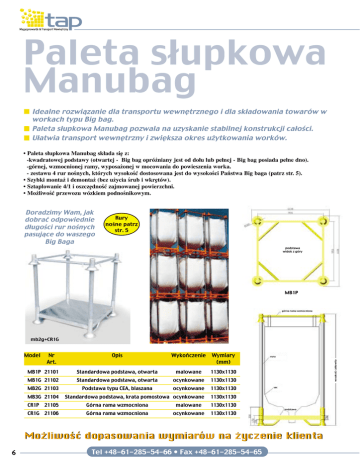 Paleta słupkowa Manubag Idealne rozwiązanie dla transportu wewnętrznego i dla składowania towarów w workach typu Big bag. Paleta słupkowa Manubag pozwala na uzyskanie stabilnej konstrukcji całości. Ułatwia transport wewnętrzny i zwiększa okres użytkowania worków. • Paleta słupkowa Manubag składa się z: -kwadratowej podstawy (otwartej - Big bag opróżniany jest od dołu lub pełnej - Big bag posiada pełne dno). -górnej, wzmocnionej ramy, wyposażonej w mocowania do powieszenia worka. - zestawu 4 rur nośnych, których wysokość dostosowana jest do wysokości Państwa Big baga (patrz str. 5). • Szybki montaż i demontaż (bez użycia śrub i wkrętów). • Sztaplowanie 4/1 i oszczędność zajmowanej powierzchni. • Możliwość przewozu wózkiem podnośnikowym. Doradzimy Wam, jak dobrać odpowiednie długości rur nośnych pasujące do waszego Big Baga Rury nośne patrz str. 5 podstawa widok z góry MB1P górna rama wzmocniona mb2g+CR1G Nr Art. Opis Wykończenie Wymiary (mm) MB1P 21101 Standardowa podstawa, otwarta malowane 1130x1130 MB1G 21102 Standardowa podstawa, otwarta ocynkowane 1130x1130 MB2G 21103 Podstawa typu CEA, blaszana ocynkowane 1130x1130 Standardowa podstawa, krata pomostowa ocynkowane 1130x1130 MB3G 21104 CR1P 21105 Górna rama wzmocniona malowane 1130x1130 CR1G 21106 Górna rama wzmocniona ocynkowane 1130x1130 rura wysokość całkowita Model sac podstawa Możliwość dopasowania wymiarów na życzenie klienta 6 Tel +48-61-285-54-66 • Fax +48-61-285-54-65