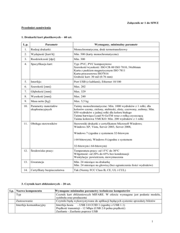 Załącznik nr 1 do SIWZ Przedmiot zamówienia 1. Drukarki kart plastikowych - 60 szt. L.p. Parametr Wymagany, minimalny parametr 1. Rodzaj drukarki: Monochromatyczna, druk termotransferowy 2. Wydajność [kart/h]: Min. 500 (karty monochromatyczne) 3. Rozdzielczość [dpi] Min. 300 4. Specyfikacja kart: Typ: PVC, PVC kompozytowe Szerokość/wysokość: ISO CR-80 ISO 7810, 54x86mm Karta z paskiem magnetycznym ISO 7811 Karta procesorowa ISO7816 Grubość kart: 30 mil (0.76 mm) 5. Interfejs: Port USB (z kablami), Ethernet 10/100 6. Szerokość [mm]: Max. 202 7. Głębokość [mm]: Max. 329 8. Wysokość [mm]: Max. 240 9. Masa netto [kg]: Max. 5,5 kg 10. Parametry materiałów eksploatacyjnych Taśmy monochromatyczne: Min. 1000 wydruków z 1 rolki, dla kolorów czerny, zielony, niebieski, złoty, czerwony, srebrny; Min. 850 wydruków z jednej rolki dla koloru białego Taśma barwiąca Load-N-GoTM wraz z rolką czyszczącą Taśma kolorowa YMCKO: Min. 200 wydruków z 1 rolki 11. Obsługa sterowników Sterowniki drukarki z certyfikatem Microsoft Windows; Windows XP, Vista, Server 2003, Server 2008, Windows 7 (zgodne z systemem 32-bitowym i 64-bitowym), Windows 8 (zgodne z systemem 32-bitowym i 64-bitowym) 12. Środowisko pracy: Temperatura pracy: od 15°C do 30°C Wilgotność: od 20% do 65% bez kondensacji Wentylacja: powietrzem, niewymuszona 13. Gwarancja Min. 24 miesiące na drukarkę Min. 24 miesiące na głowicę (bez ograniczenia ilości wydruków) 14. Certyfikaty bezpieczeństwa Tak (Normy FCC Class B, CE, UL i CUL) 3. Czytnik kart zbliżeniowych – 20 szt. Lp. Nazwa komponentu Typ Zastosowanie Interfejs komunikacyjny Wymagane minimalne parametry techniczne komputerów Czytnik kart zbliżeniowych MIFARE. W ofercie wymagane jest podanie modelu, symbolu oraz producenta Czytniki będą wykorzystywane do aplikacji będących systemie sprzedaży biletów Interfejs hosta - USB 2.0 CCID 1 (zgodny z USB 1.1) Prędkość transmisji - 12 Mbps (USB 2.0 pełna prędkość) Zasilanie - Zasilanie poprzez USB 1 Smart Card Interface Pozostałe funkcje Wspierane API Wsparcie dla PC/SC Standardy: ISO 7816 & EMV2 2000 Level 1 Protokoły: T=0, T=1, 2-wire: SLE 4432/42 (S=10), 3-wire: SLE 4418/28 (S=9), I2C (S=8) Rozmiar karty: ID-1 (pełny wymiar) Prędkość interfejsu Smart Card: do 420 Kbps Taktowanie Smart Card: do 8 MHz Wspierane typy kart: 5V, 3V and 1.8V Smart Cards ISO 7816 Class A, AB and C Zapotrzebowanie prądowe: 60 mA Wykrywanie i ochrona Smart Card: wykrywanie włożenia karty oraz auto power-off , wykrywanie typu karty, zabezpieczenie przeciwzwarciowe i termiczne 8 Pin handling wsparcie dla C4 / C8 Wbudowany port SAM (Secure Access Module) PC/SC driver (ready for 2.01) CT-API (on top of PC/SC) Synchronous-API (on top of PC/SC) OCF (on top of PC/SC) Windows® 2000 / XP (32 bit), 2003 Server, 2008 Server, Windows® CE 5.0 / CE.NET / CE 6.0 (depending on hardware), Specyfikacja sprzętowa Certyfikaty/technologie Bezpieczeństwo/środowisko Windows® XP (64 bit), Windows® Vista (32 bit / 64 bit), Windows 7 (32 bit / 64 bit), Linux® and Mac® OS X Żywotność - 100,000 cykli złożeniowych Awaryjność (MTBF) - 500,000 godzin Microsoft® WHQL³, EMV² 2000 Level 1, ISO 7816, HBCI4, USB 2.0 (USB 1.1 compatible), CCID1, GSA Fips201 approved product list CE/WEEE, FCC, UL, VCCI, MIC, RoHS 2