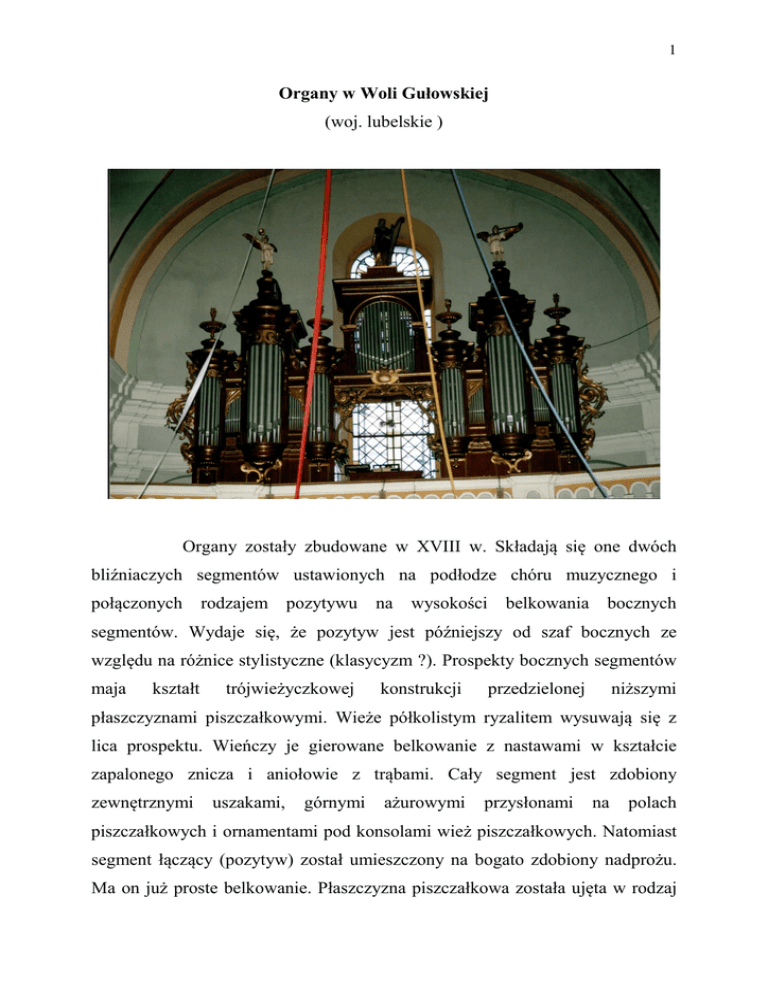 1 Organy w Woli Gułowskiej (woj. lubelskie ) Organy zostały zbudowane w XVIII w. Składają się one dwóch bliźniaczych segmentów ustawionych na podłodze chóru muzycznego i połączonych rodzajem pozytywu na wysokości belkowania bocznych segmentów. Wydaje się, że pozytyw jest późniejszy od szaf bocznych ze względu na różnice stylistyczne (klasycyzm ?). Prospekty bocznych segmentów maja kształt trójwieżyczkowej konstrukcji przedzielonej niższymi płaszczyznami piszczałkowymi. Wieże półkolistym ryzalitem wysuwają się z lica prospektu. Wieńczy je gierowane belkowanie z nastawami w kształcie zapalonego znicza i aniołowie z trąbami. Cały segment jest zdobiony zewnętrznymi uszakami, górnymi ażurowymi przysłonami na polach piszczałkowych i ornamentami pod konsolami wież piszczałkowych. Natomiast segment łączący (pozytyw) został umieszczony na bogato zdobiony nadprożu. Ma on już proste belkowanie. Płaszczyzna piszczałkowa została ujęta w rodzaj 2 pilastrów podtrzymujący łuk prosty oparty na węgarach. Na zwieńczeniu łącznika znajduje się pełno plastyczna rzeźba Dawida z harfą. Prześwit poniżej łącznika zdobi złocony ornament o kształtach roślinnych. Wszystkie ornament są złocone. Natomiast rzeźby – polichromowane. Szafa organowa pomalowana na kolor brązowy. W 1918 roku zarekwirowano dla wojska piszczałki prospektowe. Po zniszczeniach wojennych z 1939 r. ( Tutaj w Woli Gułowskiej miała miejsce słynna bitwa pod Kockiem.) organy przebudował, w 1943 r., Stanisław Jagodziński.1 Właściwie zabytkowe wnętrze organów z wiatrownicami zasuwowo-klapowymi zamienił na wiatrownice stożkowe, zastosował wolno stojący kontuar zamiast klawiatur wbudowanych w praw segment szafy organowej.2 Klawiatura ma mechaniczną trakturę, registry głosowe – pneumatyczną. Miech pływakowy. Dyspozycja: Man. I (C-f3): Bourdon 16’, Pryncypał 8’, Viola di Gamba 8’, Vox coel. 8, Dolce 8’, Portunal 8’, Oktawa 4’, Dulcyon 4’. Mixtura 2-3x Man. II (C-f3): Pryncypał 8’, Salicyonał 8’, Aeolina 8’, Gedeckt 88’, Kwintadena 4’ (umieszczony na arkadzie). Ped.: (C-d1): Subbass 16’, Violonbas 16’, Pryncypał 8’, Oktawbas 8’ Dyspozycja organów została pomyślana wyłącznie dla celów akompaniamentu. Tym samym powstała ograniczona możliwość wykonywania bogatej literatury organowej. o.Waldemar Kapeć OP 1 Por. folder parafii – Sanktuarium Matki Bożej. Wola Gułowska, wydane w 2002 r. Zdjęcie organów otrzymałem dzięki uprzejmości Pana Jana Osiaka, miejscowego organisty. 2 Przebudowa organów w Woli Gułowskiej przypomina mi losy zabytkowych organów identycznie potraktowanych przez S. Jagodzińskiego w kościele św. Ducha w Lublinie i w kościele parafialnym w Gołębiu koło Dęblina.