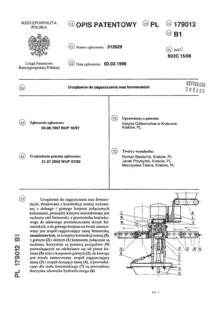 Urządzenie do zagęszczania mas formierskich - Patenty