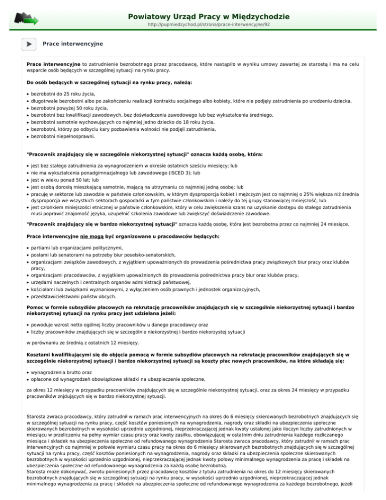 Powiatowy Urząd Pracy w Międzychodzie http://pupmiedzychod.pl/strona/prace-interwencyjne/92 Prace interwencyjne Prace interwencyjne to zatrudnienie bezrobotnego przez pracodawcę, które nastąpiło w wyniku umowy zawartej ze starostą i ma na celu wsparcie osób będących w szczególnej sytuacji na rynku pracy. Do osób będących w szczególnej sytuacji na rynku pracy, należą: ● bezrobotni do 25 roku życia, ● długotrwale bezrobotni albo po zakończeniu realizacji kontraktu socjalnego albo kobiety, które nie podjęły zatrudnienia po urodzeniu dziecka, ● bezrobotni powyżej 50 roku życia, ● bezrobotni bez kwalifikacji zawodowych, bez doświadczenia zawodowego lub bez wykształcenia średniego, ● bezrobotni samotnie wychowujących co najmniej jedno dziecko do 18 roku życia, ● bezrobotni, którzy po odbyciu kary pozbawienia wolności nie podjęli zatrudnienia, ● bezrobotni niepełnosprawni. "Pracownik znajdujący się w szczególnie niekorzystnej sytuacji" oznacza każdą osobę, która: ● jest bez stałego zatrudnienia za wynagrodzeniem w okresie ostatnich sześciu miesięcy; lub ● nie ma wykształcenia ponadgimnazjalnego lub zawodowego (ISCED 3); lub ● jest w wieku ponad 50 lat; lub ● jest osobą dorosłą mieszkającą samotnie, mającą na utrzymaniu co najmniej jedną osobę; lub ● ● pracuję w sektorze lub zawodzie w państwie członkowskim, w którym dysproporcja kobiet i mężczyzn jest co najmniej o 25% większa niż średnia dysproporcja we wszystkich sektorach gospodarki w tym państwie członkowskim i należy do tej grupy stanowiącej mniejszość; lub jest członkiem mniejszości etnicznej w państwie członkowskim, który w celu zwiększenia szans na uzyskanie dostępu do stałego zatrudnienia musi poprawić znajomość języka, uzupełnić szkolenia zawodowe lub zwiększyć doświadczenie zawodowe. "Pracownik znajdujący się w bardzo niekorzystnej sytuacji" oznacza każdą osobę, która jest bezrobotna przez co najmniej 24 miesiące. Prace interwencyjne nie mogą być organizowane u pracodawców będących: ● partiami lub organizacjami politycznymi, ● posłami lub senatorami na potrzeby biur poselsko-senatorskich, ● ● organizacjami związków zawodowych, z wyjątkiem upoważnionych do prowadzenia pośrednictwa pracy związkowych biur pracy oraz klubów pracy, organizacjami pracodawców, z wyjątkiem upoważnionych do prowadzenia pośrednictwa pracy biur oraz klubów pracy, ● urzędami naczelnych i centralnych organów administracji państwowej, ● kościołami lub związkami wyznaniowymi, z wyłączeniem osób prawnych i jednostek organizacyjnych, ● przedstawicielstwami państw obcych. Pomoc w formie subsydiów płacowych na rekrutację pracowników znajdujących się w szczególnie niekorzystnej sytuacji i bardzo niekorzystnej sytuacji na rynku pracy jest udzielana jeżeli: ● powoduje wzrost netto ogólnej liczby pracowników u danego pracodawcy oraz ● liczby pracowników znajdujących się w szczególnie niekorzystnej i bardzo niekorzystej sytuacji w porównaniu ze średnią z ostatnich 12 miesięcy. Kosztami kwalifikującymi się do objęcia pomocą w formie subsydiów płacowych na rekrutację pracowników znajdujących się w szczególnie niekorzystnej sytuacji i bardzo niekorzystnej sytuacji są koszty płac nowych pracowników, na które składają się: ● wynagrodzenia brutto oraz ● opłacone od wynagrodzeń obowiązkowe składki na ubezpieczenie społeczne, za okres 12 miesięcy w przypadku pracowników znajdujących się w szczególnie niekorzystnej sytuacji, oraz za okres 24 miesięcy w przypadku pracowników znjdujących się w bardzo niekorzystnej sytuacji. Starosta zwraca pracodawcy, który zatrudnił w ramach prac interwencyjnych na okres do 6 miesięcy skierowanych bezrobotnych znajdujących się w szczególnej sytuacji na rynku pracy, część kosztów poniesionych na wynagrodzenia, nagrody oraz składki na ubezpieczenia społeczne skierowanych bezrobotnych w wysokości uprzednio uzgodnionej, nieprzekraczającej jednak kwoty ustalonej jako iloczyn liczby zatrudnionych w miesiącu w przeliczeniu na pełny wymiar czasu pracy oraz kwoty zasiłku, obowiązującej w ostatnim dniu zatrudnienia każdego rozliczanego miesiąca i składek na ubezpieczenia społeczne od refundowanego wynagrodzenia Starosta zwraca pracodawcy, który zatrudnił w ramach prac interwencyjnych co najmniej w połowie wymiaru czasu pracy na okres do 6 miesięcy skierowanych bezrobotnych znajdujących się w szczególnej sytuacji na rynku pracy, część kosztów poniesionych na wynagrodzenia, nagrody oraz składki na ubezpieczenia społeczne skierowanych bezrobotnych w wysokości uprzednio uzgodnionej, nieprzekraczającej jednak kwoty połowy minimalnego wynagrodzenia za pracę i składek na ubezpieczenia społeczne od refundowanego wynagrodzenia za każdą osobę bezrobotną. Starosta może dokonywać, zwrotu poniesionych przez pracodawcę kosztów z tytułu zatrudnienia na okres do 12 miesięcy skierowanych bezrobotnych znajdujących się w szczególnej sytuacji na rynku pracy, w wysokości uprzednio uzgodnionej, nieprzekraczającej jednak minimalnego wynagrodzenia za pracę i składek na ubezpieczenia społeczne od refundowanego wynagrodzenia za każdego bezrobotnego, jeżeli refundacja obejmuje koszty poniesione za co drugi miesiąc ich zatrudnienia. Jeżeli do pracy w ramach prac interwencyjnych są kierowani bezrobotni, którzy: ● ● spełniają warunki konieczne do nabycia prawa do świadczenia przedemerytalnego - refundacja jest przyznawana w wysokości do 80% minimalnego wynagrodzenia za pracę i składek na ubezpieczenia społeczne od refundowanego wynagrodzenia, nie spełniają warunków koniecznych do uzyskania świadczenia przedemerytalnego - refundacja jest przyznawana w wysokości do 50% minimalnego wynagrodzenia za pracę i składek na ubezpieczenia społeczne od refundowanego wynagrodzenia. Wymagane dokumenty: 