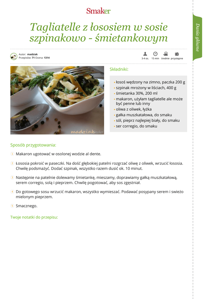 Tagliatelle z łososiem w sosie szpinakowo - śmietankowym Autor: madziak Przepisów: 71 Ocena: 1314 3-4 os. 15 min średnie przystępne Składniki: łosoś wędzony na zimno, paczka 200 g szpinak mrożony w liściach, 400 g śmietanka 30%, 200 ml makaron, użyłam tagliatelle ale może być penne lub inny oliwa z oliwek, łyżka gałka muszkatałowa, do smaku sól, pieprz najlepiej biały, do smaku ser corregio, do smaku Sposób przygotowania: 1 Makaron ugotować w osolonej wodzie al dente. 2 Łososia pokroić w paseczki. Na dość głębokiej patelni rozgrzać oliwę z oliwek, wrzucić łososia. Chwilę podsmażyć. Dodać szpinak, wszystko razem dusić ok. 10 minut. 3 Następnie na patelnie dolewamy śmietankę, mieszamy, doprawiamy gałką muszkatałową, serem corregio, solą i pieprzem. Chwilę pogotować, aby sos zgęstniał. 4 Do gotowego sosu wrzucić makaron, wszystko wymieszać. Podawać posypany serem i swieżo mielonym pieprzem. 5 Smacznego. Twoje notatki do przepisu: