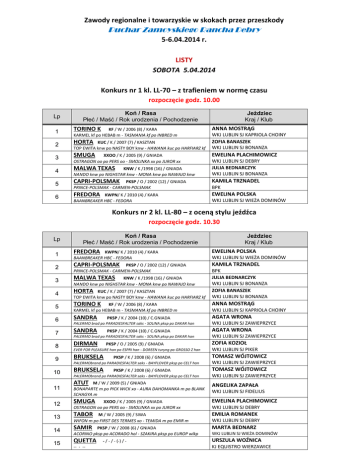 Zawody regionalne i towarzyskie w skokach przez przeszkody Puchar Zamoyskiego Rancha Debry 5-6.04.2014 r. LISTY SOBOTA 5.04.2014 Konkurs nr 1 kl. LL-70 – z trafieniem w normę czasu rozpoczęcie godz. 10.00 Lp Koń / Rasa Płeć / Maść / Rok urodzenia / Pochodzenie Jeździec Kraj / Klub 1 TORINO K ANNA MOSTRĄG 2 HORTA KUC / K / 2007 (7) / KASZTAN TOP EWITA knw po NASTY BOY knw - HAWANA kuc po HARFIARZ kf WKJ LUBLIN SJ KAPRIOLA CHOINY ZOFIA BANASZEK WKJ LUBLIN SJ BONANZA 3 SMUGA EWELINA PLACHIMOWICZ 4 MALWA TEXAS KNW / K /1998 (16) / GNIADA NANDO knw po NIGHSTAR knw - MONA knw po NAWAJO knw WKJ LUBLIN SJ DEBRY JULIA BEDNARCZYK WKJ LUBLIN SJ BONANZA 5 CAPRI-POLSMAK PKSP / O / 2002 (12) / GNIADA PRINCE-POLSMAK - CARMEN-POLSMAK KAMILA TRZNADEL 6 FREDORA EWELINA POLSKA KF / W / 2006 (8) / KARA KARMEL kf po HEBAB m - TASMANIA kf po INBRED m XXOO / K / 2005 (9) / GNIADA OSTRAGON oo po PERS oo - SMOLINKA xx po JUROR xx KWPN/ K / 2010 (4) / KARA BAANBREAKER HBC - FEDORA BPK WKJ LUBLIN SJ WIEŻA DOMINÓW Konkurs nr 2 kl. LL-80 – z oceną stylu jeźdźca rozpoczęcie godz. 10.30 Lp Koń / Rasa Płeć / Maść / Rok urodzenia / Pochodzenie Jeździec Kraj / Klub 1 FREDORA KWPN/ K / 2010 (4) / KARA BAANBREAKER HBC - FEDORA EWELINA POLSKA 2 CAPRI-POLSMAK KAMILA TRZNADEL 3 MALWA TEXAS 4 HORTA KUC / K / 2007 (7) / KASZTAN TOP EWITA knw po NASTY BOY knw - HAWANA kuc po HARFIARZ kf BPK JULIA BEDNARCZYK WKJ LUBLIN SJ BONANZA ZOFIA BANASZEK WKJ LUBLIN SJ BONANZA 5 TORINO K KF / W / 2006 (8) / KARA KARMEL kf po HEBAB m - TASMANIA kf po INBRED m ANNA MOSTRĄG 6 SANDRA AGATA WRONA PALERMO brad po PARADIESFALTER saks - SOLINA pksp po DAKAR han WKJ LUBLIN SJ ZAWIEPRZYCE 7 SANDRA AGATA WRONA PALERMO brad po PARADIESFALTER saks - SOLINA pksp po DAKAR han WKJ LUBLIN SJ ZAWIEPRZYCE 8 DIRMAN ZOFIA KOZIOŁ EVER FOR PLEASURE han po ESPRI han - DOREEN turyng po GROSSO Z han WKJ LUBLIN SJ PIKER 9 BRUKSELA TOMASZ WÓJTOWICZ PALERMObrand po PARADIESFALTER saks - BAYFLOVER pksp po CELT han WKJ LUBLIN SJ ZAWIEPRZYCE 10 BRUKSELA TOMASZ WÓJTOWICZ PKSP / O / 2002 (12) / GNIADA PRINCE-POLSMAK - CARMEN-POLSMAK KNW / K /1998 (16) / GNIADA NANDO knw po NIGHSTAR knw - MONA knw po NAWAJO knw PKSP / K / 2004 (10) / C.GNIADA PKSP / K / 2004 (10) / C.GNIADA PKSP / O / 2005 (9) / GNIADA PKSP / K / 2008 (6) / GNIADA PKSP / K / 2008 (6) / GNIADA PALERMObrand po PARADIESFALTER saks - BAYFLOVER pksp po CELT han ATUT WKJ LUBLIN SJ WIEŻA DOMINÓW WKJ LUBLIN SJ KAPRIOLA CHOINY WKJ LUBLIN SJ ZAWIEPRZYCE M / W / 2009 (5) / GNIADA BONAPARTE m po PICK WICK xo - AURA DAHOMANKA m po BLANK SCHAGYA m ANGELIKA ZAPAŁA 12 SMUGA XXOO / K / 2005 (9) / GNIADA OSTRAGON oo po PERS oo - SMOLINKA xx po JUROR xx EWELINA PLACHIMOWICZ 13 TABOR M / W / 2005 (9) / SIWA WIFON m po FIRST DES TERMES xo - TEMIDA m po EMIR m EMILIA ROMANEK 14 SAMIR PKSP / W / 2008 (6) / GNIADA ACORINO pksp po ACORADO hol - SZAKIRA pksp po EUROP wlkp MARTA BEDNARZ 15 QUETTA URSZULA WOŹNICA 11 -- - -- - / - / - (-) / - WKJ LUBLIN SJ FIDELIUS WKJ LUBLIN SJ DEBRY WKJ LUBLIN SJ DEBRY WKJ LUBLIN SJ WIEŻA DOMINÓW KJ EQUISTRO WIERZAWICE URSZULA WOŹNICA 16 QUETTA -- - -- KJ EQUISTRO WIERZAWICE 17 HIPIS M / W / 2001 (13) / KASZTAN BAJT m - HRABINA PIOTR PISKORSKI 18 LORD LEROY PAWEŁ STEC 19 KURT COBAIN 20 TIK TAK ANDRZEJ MACIASZCZYK 21 ZEUS JUSTYNA TUREK-WIERZCHOWSKA - / - / - (-) / - - / - / - (-) / - WKJ LUBLIN SJ DAKAR KJ EQUISTRO WIERZAWICE -- - -- / - / - (-) / - -- - -- PKSP / W / - (-) / GNIADA DAN - ZORZA SŁAWOMIR SZLACHTA KJ EQUISTRO WIERZAWICE WKJ LUBLIN SJ DEBRY WKJ LUBLIN SJ TARZYMIECHY Konkurs nr 3 kl. LL-90 – z oceną stylu jeźdźca rozpoczęcie godz. 11.50 Lp Koń / Rasa Płeć / Maść / Rok urodzenia / Pochodzenie Jeździec Kraj / Klub JUSTYNA TUREK-WIERZCHOWSKA 1 ZEUS 2 TIK TAK 3 KURT COBAIN 4 LORD LEROY 5 LORD LEROY -- - -- KJ EQUISTRO WIERZAWICE 6 HIPIS M / W / 2001 (13) / KASZTAN BAJT m - HRABINA PIOTR PISKORSKI 7 QUETTA URSZULA WOŹNICA -- - -- KJ EQUISTRO WIERZAWICE 8 SAMIR PKSP / W / 2008 (6) / GNIADA ACORINO pksp po ACORADO hol - SZAKIRA pksp po EUROP wlkp MARTA BEDNARZ 9 SAMIR PKSP / W / 2008 (6) / GNIADA ACORINO pksp po ACORADO hol - SZAKIRA pksp po EUROP wlkp MARTA BEDNARZ 10 SMUGA EWELINA PLACHIMOWICZ 11 12 13 PKSP / W / - (-) / GNIADA DAN - ZORZA WKJ LUBLIN SJ TARZYMIECHY ANDRZEJ MACIASZCZYK WKJ LUBLIN SJ DEBRY - / - / - (-) / - SŁAWOMIR SZLACHTA KJ EQUISTRO WIERZAWICE -- - -- / - / - (-) / - PAWEŁ STEC KJ EQUISTRO WIERZAWICE -- - -- / - / - (-) / - - / - / - (-) / - XXOO / K / 2005 (9) / GNIADA OSTRAGON oo po PERS oo - SMOLINKA xx po JUROR xx ATUT M / W / 2009 (5) / GNIADA BONAPARTE m po PICK WICK xo - AURA DAHOMANKA m po BLANK SCHAGYA m BRUKSELA PAWEŁ STEC WKJ LUBLIN SJ DAKAR WKJ LUBLIN SJ WIEŻA DOMINÓW WKJ LUBLIN SJ WIEŻA DOMINÓW WKJ LUBLIN SJ DEBRY ANGELIKA ZAPAŁA WKJ LUBLIN SJ FIDELIUS PKSP / K / 2008 (6) / GNIADA PALERMObrand po PARADIESFALTER saks - BAYFLOVER pksp po CELT han TOMASZ WÓJTOWICZ DIRMAN ZOFIA KOZIOŁ PKSP / O / 2005 (9) / GNIADA EVER FOR PLEASURE han po ESPRI han - DOREEN turyng po GROSSO Z han DIRMAN WKJ LUBLIN SJ ZAWIEPRZYCE WKJ LUBLIN SJ PIKER PKSP / O / 2005 (9) / GNIADA EVER FOR PLEASURE han po ESPRI han - DOREEN turyng po GROSSO Z han ZOFIA KOZIOŁ 15 SANDRA AGATA WRONA PALERMO brad po PARADIESFALTER saks - SOLINA pksp po DAKAR han WKJ LUBLIN SJ ZAWIEPRZYCE 16 BACCHUS SLO.GORĄC. / W / 2008 (6) / GNIADA COLDREX hol - HELA II po BANITA slo.gorąc. MAGDALENA CZELEJ 17 BACCHUS MAGDALENA CZELEJ 14 18 PKSP / K / 2004 (10) / C.GNIADA SLO.GORĄC. / W / 2008 (6) / GNIADA COLDREX hol - HELA II po BANITA slo.gorąc. MAGNUS PKSP / W / 2008 (6) / C.GNIADA WERY GOOD pksp po GRAF STEPP han - MULTUN IN PARVO han po MATTERNICH han MAGNUS WKJ LUBLIN SJ PIKER WKJ LUBLIN WKJ LUBLIN ALEKSANDRA CZERSKA BPK PKSP / W / 2008 (6) / C.GNIADA WERY GOOD pksp po GRAF STEPP han - MULTUN IN PARVO han po MATTERNICH han ALEKSANDRA CZERSKA 20 INGRID PKSP / K / 2004 (10) / GNIADA LAJS kwpn po GUIDAM sf - ISTRIA pksp po EMPIRYK pksp KATARZYNA BEKIESZ 2