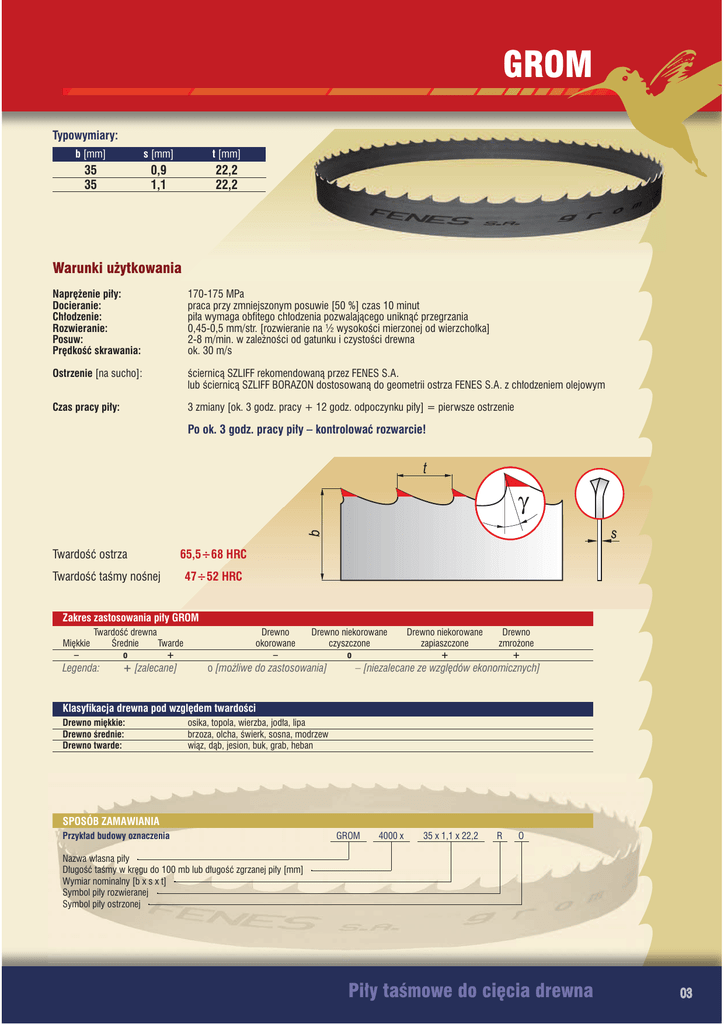 GROM Typowymiary: b [mm] s [mm] t [mm] 35 35 0,9 1,1 22,2 22,2 Warunki użytkowania Naprężenie piły: Docieranie: Chłodzenie: Rozwieranie: Posuw: Prędkość skrawania: 170-175 MPa praca przy zmniejszonym posuwie [50 %] czas 10 minut piła wymaga obfitego chłodzenia pozwalającego uniknąć przegrzania 0,45-0,5 mm/str. [rozwieranie na ½ wysokości mierzonej od wierzchołka] 2-8 m/min. w zależności od gatunku i czystości drewna ok. 30 m/s Ostrzenie [na sucho]: ściernicą SZLIFF rekomendowaną przez FENES S.A. lub ściernicą SZLIFF BORAZON dostosowaną do geometrii ostrza FENES S.A. z chłodzeniem olejowym Czas pracy piły: 3 zmiany [ok. 3 godz. pracy + 12 godz. odpoczynku piły] = pierwsze ostrzenie Po ok. 3 godz. pracy piły – kontrolować rozwarcie! Twardość ostrza 65,5÷68 HRC Twardość taśmy nośnej 47÷52 HRC Zakres zastosowania piły GROM Miękkie – Twardość drewna Średnie Twarde o + Legenda: + [zalecane] Drewno okorowane – Drewno niekorowane czyszczone o o [możliwe do zastosowania] Drewno niekorowane zapiaszczone + Drewno zmrożone + – [niezalecane ze względów ekonomicznych] Klasyfikacja drewna pod względem twardości Drewno miękkie: Drewno średnie: Drewno twarde: osika, topola, wierzba, jodła, lipa brzoza, olcha, świerk, sosna, modrzew wiąz, dąb, jesion, buk, grab, heban SPOSÓB ZAMAWIANIA Przykład budowy oznaczenia GROM 4000 x 35 x 1,1 x 22,2 R O Nazwa własna piły Długość taśmy w kręgu do 100 mb lub długość zgrzanej piły [mm] Wymiar nominalny [b x s x t] Symbol piły rozwieranej Symbol piły ostrzonej Piły taśmowe do cięcia drewna