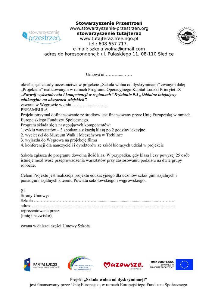 Stowarzyszenie Przestrzeń www.stowarzyszenie-przestrzen.org stowarzyszenie tutajteraz www.tutajteraz.free.ngo.pl tel.: 608 657 717, e-mail: [email protected] adres do korespondencji: ul. Pułaskiego 11, 08-110 Siedlce Umowa nr ………....…… określająca zasady uczestnictwa w projekcie „Szkoła wolna od dyskryminacji” zwanym dalej „Projektem” realizowanym w ramach Programu Operacyjnego Kapitał Ludzki Priorytet IX „Rozwój wykształcenia i kompetencji w regionach” Działanie 9.5 „Oddolne inicjatywy edukacyjne na obszarach wiejskich”. zawarta w Węgrowie w dniu ………...........….…. PREAMBUŁA Projekt otrzymał dofinansowanie ze środków jest finansowany przez Unię Europejską w ramach Europejskiego Funduszu Społecznego. Program składa się z następujących komponentów: 1. cyklu warsztatów – 3 spotkania z każdą klasą po 2 godziny lekcyjne 2. wycieczki do Muzeum Walk i Męczeństwa w Treblince 3. wyjazdu do Węgrowa na projekcję filmu 4. konferencji dla nauczycieli i dyrektorów ze szkół biorących udział w projekcie Szkoła zgłasza do programu dowolną ilość klas. W przypadku, gdy klasa liczy powyżej 25 osób istnieje możliwość przeprowadzenia warsztatów przy zastosowaniu podziału na dwie grupy robocze. Celem Projektu jest realizacja projektu edukacyjnego dla uczniów szkół gimnazjalnych i ponadgimnazjalnych z terenu Powiatu sokołowskiego i węgrowskiego. §1 Strony Umowy: Szkoła ….………………………………….......................................................………… adres................................................................................................................................... reprezentowana przez: (imię i nazwisko), zwana w dalszej części Umowy Szkołą Projekt „Szkoła wolna od dyskryminacji” jest finansowany przez Unię Europejską w ramach Europejskiego Funduszu Społecznego Stowarzyszenie Przestrzeń www.stowarzyszenie-przestrzen.org stowarzyszenie tutajteraz www.tutajteraz.free.ngo.pl tel.: 608 657 717, e-mail: [email protected] adres do korespondencji: ul. Pułaskiego 11, 08-110 Siedlce Stowarzyszenie Przestrzeń ul. Przemysłowa 6/22 07-100 Węgrów KRS 0000319146 zwane w dalszej części umowy Wykonawcą §2 W ramach projektu Wykonawca zobowiązuje się do: 1. zorganizowania cyklu zajęć w wymiarze 6 godzin lekcyjnych 2. zorganizowania wycieczki do Muzeum walk i męczeństwa w Treblince 3. zorganizowania projekcji filmu 4. zorganizowania konferencji podsumowującej projekt 5. terminy realizacji działań 1-3 ustalone zostaną w porozumieniu ze Szkołą Szkoła zobowiązuje się do: 1. Wyznaczenia nauczyciela odpowiedzialnego za współpracę z Wykonawcą 2. Zapewnienia w terminie ustalonym z Wykonawcą pomieszczenia niezbędnego do przeprowadzenia warsztatów 3. Zapewnienia niezbędnych (zgodnie z obowiązującymi przepisami) opiekunów w ramach wycieczki i wyjazdu do Węgrowa na projekcję filmu 4. Aktywnego udziału zadeklarowanych klas a) w warsztatach zorganizowanych na terenie szkoły, b) w wycieczce do Muzeum Walk i Męczeństwa w Treblince c) w projekcji filmu w Węgrowie 5. Udziału minimum 2 osób ze szkoły biorącej udział w projekcie w konferencji podsumowującej projekt (przybliżony termin odbycia się konferencji styczeń 2011) Projekt „Szkoła wolna od dyskryminacji” jest finansowany przez Unię Europejską w ramach Europejskiego Funduszu Społecznego Stowarzyszenie Przestrzeń www.stowarzyszenie-przestrzen.org stowarzyszenie tutajteraz www.tutajteraz.free.ngo.pl tel.: 608 657 717, e-mail: [email protected] adres do korespondencji: ul. Pułaskiego 11, 08-110 Siedlce §6 1.Wszelkie zawiadomienia i inna korespondencja związana z niniejszą umową wymaga formy pisemnej. Jako formę pisemną Strony dopuszczają przekaz pism: pocztą elektroniczną e-mail z potwierdzeniem przeczytania, kurierem, listem poleconym. a) Dane korespondencyjne Wykonawcy projektu: Stowarzyszenie Przestrzeń ul. Pułaskiego 11 08-110 Siedlce E-mail: [email protected] b) Dane korespondencyjne Uczestnika Projektu: …………………………………………………… …………………………………………………… …………………………………………………… §7 1. Wykonawca działa na podstawie umowy nr …... ramach …................, co Szkoła przyjmuje do wiadomości i zgadza się na konsekwencje wynikłe z dodatkowych wytycznych 2. Umowę sporządzono w dwóch jednobrzmiących egzemplarzach po jednym dla Wykonawcy i Szkoły. 3. W sprawach nieuregulowanych niniejszą umową zastosowanie mają odpowiednie postanowienia Kodeksu cywilnego. 4. Umowa wchodzi w życie w dniu jej podpisania. Projekt „Szkoła wolna od dyskryminacji” jest finansowany przez Unię Europejską w ramach Europejskiego Funduszu Społecznego