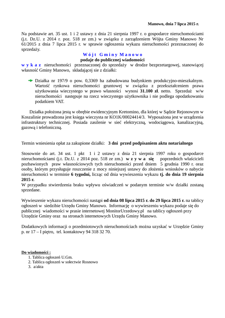 Manowo, dnia 7 lipca 2015 r. Na podstawie art. 35 ust. 1 i 2 ustawy z dnia 21 sierpnia 1997 r. o gospodarce nieruchomościami (j.t. Dz.U. z 2014 r. poz. 518 ze zm.) w związku z zarządzeniem Wójta Gminy Manowo Nr 61/2015 z dnia 7 lipca 2015 r. w sprawie ogłoszenia wykazu nieruchomości przeznaczonej do sprzedaży. Wójt Gminy Manowo podaje do publicznej wiadomości w y k a z nieruchomości przeznaczonej do sprzedaży w drodze bezprzetargowej, stanowiącej własność Gminy Manowo, składającej sie z działki: Działka nr 197/9 o pow. 0,3369 ha zabudowana budynkiem produkcyjno-mieszkalnym. Wartość rynkowa nieruchomości gruntowej w związku z przekształceniem prawa użytkowania wieczystego w prawo własności wynosi 31.100 zł. netto. Sprzedaż w/w nieruchomości następuje na rzecz wieczystego użytkownika i nie podlega opodatkowaniu podatkiem VAT. Działka położona jestą w obrębie ewidencyjnym Kretomino, dla której w Sądzie Rejonowym w Koszalinie prowadzona jest księga wieczysta nr KO1K/00024414/3. Wyposażona jest w urządzenia infrastruktury technicznej. Posiada zasilenie w sieć elektryczną, wodociągowa, kanalizacyjną, gazową i telefoniczną. Termin wniesienia opłat za zakupione działki: 3 dni przed podpisaniem aktu notarialnego Stosownie do art. 34 ust. 1 pkt 1 i 2 ustawy z dnia 21 sierpnia 1997 roku o gospodarce nieruchomościami (j.t. Dz.U. z 2014 poz. 518 ze zm.) w z y w a się poprzednich właścicieli pozbawionych praw własnościowych tych nieruchomości przed dniem 5 grudnia 1990 r. oraz osoby, którym przysługuje roszczenie z mocy niniejszej ustawy do złożenia wniosków o nabycie nieruchomości w terminie 6 tygodni, licząc od dnia wywieszenia wykazu tj. do dnia 19 sierpnia 2015 r. W przypadku stwierdzenia braku wpływu oświadczeń w podanym terminie w/w działki zostaną sprzedane. Wywieszenie wykazu nieruchomości nastąpi od dnia 08 lipca 2015 r. do 29 lipca 2015 r. na tablicy ogłoszeń w siedzibie Urzędu Gminy Manowo. Informację o wywieszeniu wykazu podaje się do publicznej wiadomości w prasie internetowej MonitorUrzedowy.pl na tablicy ogłoszeń przy Urzędzie Gminy oraz na stronach internetowych Urzędu Gminy Manowo. Dodatkowych informacji o przedmiotowych nieruchomościach można uzyskać w Urzędzie Gminy p. nr 17 – I piętro, tel. kontaktowy 94 318 32 70. Do wiadomości : 1. Tablica ogłoszeń U.Gm. 2. Tablica ogłoszeń w sołectwie Rosnowo 3. a/akta