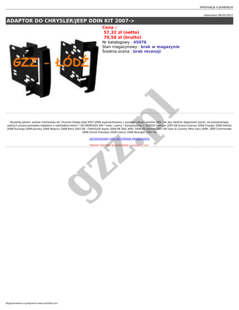 Informacje o produkcie Utworzono 08-03-2017 ADAPTOR DO CHRYSLER/JEEP DDIN KIT 2007-> Cena : 57,32 zł (netto) 70,50 zł (brutto) .p l Nr katalogowy : 45076 Stan magazynowy : brak w magazynie Średnia ocena : brak recenzji Wysokiej jakości, zestaw montażowy do: Chrysler Dodge Jeep 2007-2008 wyprodukowany z wysokiej jakości plastiku ABS, tak aby idealnie dopasować panel, nie pozostawiając żadnych przerw pomiędzy kokpitem a radioodbiornikiem * DO MONTAŻU DIN * kolor: czarny * Kompatybilny z: DODGE Avenger 2007-08 Grand Caravan 2008 Charger 2008 Dakota 2008 Durango 2008 Journey 2009 Magnun 2008 Nitro 2007-08 ; CHRYSLER Aspen 2008-08 300/ 300C 2008-08 Sebring 2007-08 Town & Country (Mini Van) 2008 ; JEEP Commander 2008 Grand Cherokee 2008 Liberty 2008 Wrangler 2007-08 SZCZEGÓŁOWY OPIS NA STRONIE PRODUCENTA gz z PRODUKT DOSTĘPNY NA ZAMÓWIENIE (realizacja 1-2 dni)* Wygenerowano w programie www.oscGold.com