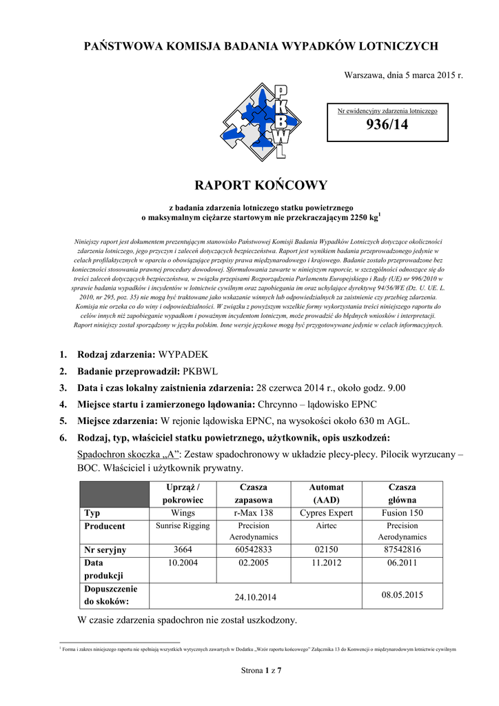 PAŃSTWOWA KOMISJA BADANIA WYPADKÓW LOTNICZYCH Warszawa, dnia 5 marca 2015 r. Nr ewidencyjny zdarzenia lotniczego 936/14 RAPORT KOŃCOWY z badania zdarzenia lotniczego statku powietrznego o maksymalnym ciężarze startowym nie przekraczającym 2250 kg1 Niniejszy raport jest dokumentem prezentującym stanowisko Państwowej Komisji Badania Wypadków Lotniczych dotyczące okoliczności zdarzenia lotniczego, jego przyczyn i zaleceń dotyczących bezpieczeństwa. Raport jest wynikiem badania przeprowadzonego jedynie w celach profilaktycznych w oparciu o obowiązujące przepisy prawa międzynarodowego i krajowego. Badanie zostało przeprowadzone bez konieczności stosowania prawnej procedury dowodowej. Sformułowania zawarte w niniejszym raporcie, w szczególności odnoszące się do treści zaleceń dotyczących bezpieczeństwa, w związku przepisami Rozporządzenia Parlamentu Europejskiego i Rady (UE) nr 996/2010 w sprawie badania wypadków i incydentów w lotnictwie cywilnym oraz zapobiegania im oraz uchylające dyrektywę 94/56/WE (Dz. U. UE. L. 2010, nr 295, poz. 35) nie mogą być traktowane jako wskazanie winnych lub odpowiedzialnych za zaistnienie czy przebieg zdarzenia. Komisja nie orzeka co do winy i odpowiedzialności. W związku z powyższym wszelkie formy wykorzystania treści niniejszego raportu do celów innych niż zapobieganie wypadkom i poważnym incydentom lotniczym, może prowadzić do błędnych wniosków i interpretacji. Raport niniejszy został sporządzony w języku polskim. Inne wersje językowe mogą być przygotowywane jedynie w celach informacyjnych. 1. Rodzaj zdarzenia: WYPADEK 2. Badanie przeprowadził: PKBWL 3. Data i czas lokalny zaistnienia zdarzenia: 28 czerwca 2014 r., około godz. 9.00 4. Miejsce startu i zamierzonego lądowania: Chrcynno – lądowisko EPNC 5. Miejsce zdarzenia: W rejonie lądowiska EPNC, na wysokości około 630 m AGL. 6. Rodzaj, typ, właściciel statku powietrznego, użytkownik, opis uszkodzeń: Spadochron skoczka „A”: Zestaw spadochronowy w układzie plecy-plecy. Pilocik wyrzucany – BOC. Właściciel i użytkownik prywatny. Typ Producent Nr seryjny Data produkcji Dopuszczenie do skoków: Uprząż / pokrowiec Wings Czasza zapasowa r-Max 138 Automat (AAD) Cypres Expert Czasza główna Fusion 150 Sunrise Rigging Precision Aerodynamics Airtec Precision Aerodynamics 3664 10.2004 60542833 02.2005 02150 11.2012 87542816 06.2011 24.10.2014 08.05.2015 W czasie zdarzenia spadochron nie został uszkodzony. 1 Forma i zakres niniejszego raportu nie spełniają wszystkich wytycznych zawartych w Dodatku „Wzór raportu końcowego” Załącznika 13 do Konwencji o międzynarodowym lotnictwie cywilnym Strona 1 z 7 Na lewej, przedniej taśmie nośnej zlokalizowano czerwony ślad, który mógł pochodzić z otarcia czerwonego napisu, który znajdował się z lewej strony kasku skoczka „A”. Wyposażenie: Wysokościomierz analogowy Barigo Nie odnaleziono wysokościomierza akustycznego. Spadochron skoczka „B”: zestaw spadochronowy w układzie plecy-plecy. Pilocik wyrzucany – BOC. Właściciel i użytkownik prywatny. Typ Producent Nr seryjny Data produkcji Dopuszczenie do skoków: Uprząż / pokrowiec Vector Micron Czasza zapasowa Optimum 143 Automat (AAD) Cypres Expert Czasza główna Crossfire2 129 United Parachute Technologies Performance Designs Airtec Icarus Canopies 50358 02.2010 02602 03.2009 58356 02.2010 96117818 03.2014 18.03.2016 18.03.2016 W czasie zdarzenia spadochron nie został uszkodzony. Na lewej pionowej taśmie uprzęży, nieco poniżej trzykółkowego zamka wyczepnego, zlokalizowano jasne otarcie niewiadomego pochodzenia. Wyposażenie: Wysokościomierz Altitrack i Viso Wysokościomierz akustyczny Optima Dane odczytane z wysokościomierza Altitrack: Kolejny skok: 1151; Data i godzina skoku: 28 czerwca 2014 r.; 09:01 Wysokość skoku: 4060 m; Wysokość otwarcia: 630 m; Odcinek swobodnego spadania: 3430 m; Czas swobodnego spadania: 65 s; Dane odczytane z wysokościomierza Viso: godzina skoku: 8:56 Kolejny skok: 44 Wysokość skoku: 4050 m Wysokość otwarcia: 625 m Czas swobodnego spadania: 66 s; Maksymalna (pionowa) prędkość w czasie swobodnego spadania: 237 km/h Maksymalna prędkość (pionowa) na otwartym spadochronie: 39 km/h Strona 2 z 7 Ustawienia sygnałów wysokościomierza akustycznego Optima: 1300 m 1000 m 500 m 7. Typ operacji: skok spadochronowy – zadanie RW-6. 8. Faza lotu: otwarcie spadochronów. 9. Czynniki pogody: bez wpływu na zaistnienie wypadku - nie było ograniczenia widzialności. 10. Organizator lotów i skoków: Aeroklub Warszawski 11. Dane dotyczące dowódcy statku powietrznego: Skoczek „A”: mężczyzna lat 43, posiadał świadectwo kwalifikacji skoczka spadochronowego z uprawnieniem klasy wyszkolenia D i uprawnieniem instruktora SL. Wypadek nastąpił w czasie wykonywania przez niego 1515 skoku. Posiadał duże doświadczenie w skokach RW. Brał udział w skokach formacji RW w składzie nawet kilkudziesięciu osób. Skoczek „B”: mężczyzna lat 40, posiadał świadectwo posiadał świadectwo kwalifikacji skoczka spadochronowego z uprawnieniem klasy wyszkolenia D. Wypadek nastąpił w czasie wykonywania przez niego 1151 skoku (1146 według listy załadowczej). Posiadał duże doświadczenie w skokach RW. Brał udział w skokach formacji RW w składzie nawet kilkudziesięciu osób. 12. Obrażenia załogi: Skoczek „A”: doznał obrażeń ze skutkiem śmiertelnym, podczas zderzenia w powietrzu ze skoczkiem „B” i przy uderzeniu o ziemię. Skoczek „B”: doznał ciężkich obrażeń podczas zderzenia w powietrzu ze skoczkiem „A” i przy twardym lądowaniu. 13. Opis przebiegu i analiza zdarzenia: Analiza przebiegu skoku została przeprowadzona w oparciu o zeznania uczestników jak i materiału filmowego zarejestrowanego podczas skoku. Skoczkowie zaplanowali skok na zadanie RW-62 z udziałem skoczka-kamerzysty. Przeprowadzili trening naziemny obejmujący wielokrotne wykonywanie z