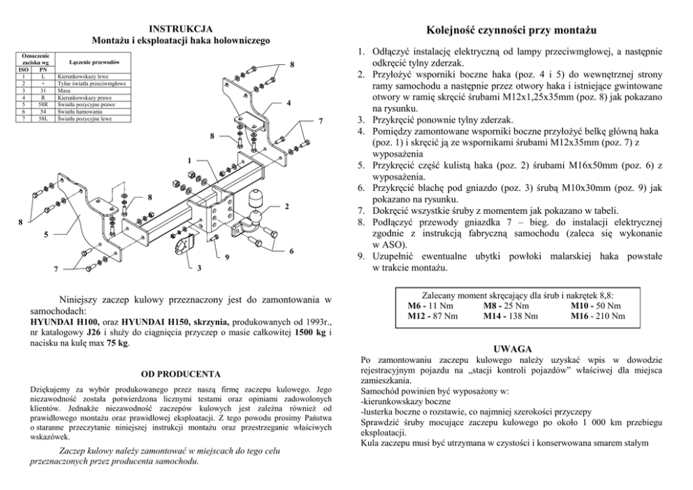 INSTRUKCJA MontaŜu i eksploatacji haka holowniczego Oznaczenie zacisku wg ISO PN 1 L 2 + 3 31 4 R 5 58R 6 54 7 58L Kolejność czynności przy montaŜu Łączenie przewodów 8 Kierunkowskazy lewe Tylne światła przeciwmgłowe Masa Kierunkowskazy prawe Światła pozycyjne prawe Światła hamowania Światła pozycyjne lewe 4 7 8 1 8 2 8 5 9 7 6 3 Niniejszy zaczep kulowy przeznaczony jest do zamontowania w samochodach: HYUNDAI H100, oraz HYUNDAI H150, skrzynia, produkowanych od 1993r., nr katalogowy J26 i słuŜy do ciągnięcia przyczep o masie całkowitej 1500 kg i nacisku na kulę max 75 kg. OD PRODUCENTA Dziękujemy za wybór produkowanego przez naszą firmę zaczepu kulowego. Jego niezawodność została potwierdzona licznymi testami oraz opiniami zadowolonych klientów. JednakŜe niezawodność zaczepów kulowych jest zaleŜna równieŜ od prawidłowego montaŜu oraz prawidłowej eksploatacji. Z tego powodu prosimy Państwa o staranne przeczytanie niniejszej instrukcji montaŜu oraz przestrzeganie właściwych wskazówek. Zaczep kulowy naleŜy zamontować w miejscach do tego celu przeznaczonych przez producenta samochodu. 1. Odłączyć instalację elektryczną od lampy przeciwmgłowej, a następnie odkręcić tylny zderzak. 2. PrzyłoŜyć wsporniki boczne haka (poz. 4 i 5) do wewnętrznej strony ramy samochodu a następnie przez otwory haka i istniejące gwintowane otwory w ramię skręcić śrubami M12x1,25x35mm (poz. 8) jak pokazano na rysunku. 3. Przykręcić ponownie tylny zderzak. 4. Pomiędzy zamontowane wsporniki boczne przyłoŜyć belkę główną haka (poz. 1) i skręcić ją ze wspornikami śrubami M12x35mm (poz. 7) z wyposaŜenia 5. Przykręcić część kulistą haka (poz. 2) śrubami M16x50mm (poz. 6) z wyposaŜenia. 6. Przykręcić blachę pod gniazdo (poz. 3) śrubą M10x30mm (poz. 9) jak pokazano na rysunku. 7. Dokręcić wszystkie śruby z momentem jak pokazano w tabeli. 8. Podłączyć przewody gniazdka 7 – bieg. do instalacji elektrycznej zgodnie z instrukcją fabryczną samochodu (zaleca się wykonanie w ASO). 9. Uzupełnić ewentualne ubytki powłoki malarskiej haka powstałe w trakcie montaŜu. Zalecany moment skręcający dla śrub i nakrętek 8,8: M6 - 11 Nm M8 - 25 Nm M10 - 50 Nm M12 - 87 Nm M14 - 138 Nm M16 - 210 Nm UWAGA Po zamontowaniu zaczepu kulowego naleŜy uzyskać wpis w dowodzie rejestracyjnym pojazdu na „stacji kontroli pojazdów” właściwej dla miejsca zamieszkania. Samochód powinien być wyposaŜony w: -kierunkowskazy boczne -lusterka boczne o rozstawie, co najmniej szerokości przyczepy Sprawdzić śruby mocujące zaczepu kulowego po około 1 000 km przebiegu eksploatacji. Kula zaczepu musi być utrzymana w czystości i konserwowana smarem stałym PPUH AUTO-HAK S.J. WyposaŜenie zaczepu kulowego: Produkcja Haków Holowniczych Henryk & Zbigniew Nejman 76-200 SŁUPSK ul. Słoneczna 16K tel./fax. (059) 8-414-414; 8-414-413 E-mail: [email protected] www. autohak.com.pl Zaczep kulowy bez wyposaŜenia elektrycznego J26 Klasa: A50-X Nr kat. Przeznaczony do zamontowania w samochodzie: Producent: HYUNDAI Model: H100 i H150 Typ: skrzynia produkowanych od 1993r. KARTA GWARANCYJNA Dane techniczne: wartość siły D: 11,82 kN maksymalna masa przyczepy: 1500 kg maksymalny nacisk na kulę: 75 kg Numer homologacji zgodnie z Dyrektywą 94/20/WE: Producent udziela gwarancji niniejszą kartą gwarancyjną na okres 24 miesięcy licząc od dnia zakupu zaczepu kulowego do samochodu: HYUNDAI H100, HYUNDAI H150 skrzynia produkowanych od 1993 r. Data produkcji .............................. Data zakupu............................................. Zakres gwarancji obejmuje wyłącznie wady jakościowe wynikające z winy producenta. Gwarancja nie obejmuje natomiast uszkodzeń zawinionych przez nabywcę, wynikających z niewłaściwego montaŜu, uŜytkowania lub konserwacji, uszkodzeń mechanicznych, normalnego zuŜycia podczas eksploatacji itp. Gwarancja udzielona na zakupiony towar nie wyłącza, nie ogranicza ani nie zawiesza uprawnień kupującego wynikających z niezgodności towaru z umową. Reklamacje naleŜy zgłaszać w punkcie sprzedaŜy, składając jednocześnie kartę gwarancyjną. Usunięcie "wady" następuje po stwierdzeniu przez punkt sprzedaŜy wspólnie z producentem słuszności złoŜonej reklamacji. Reklamacja powinna być załatwiona w ciągu 14 dni od dnia uznania reklamacji. Karta gwarancyjna jest niewaŜna, jeŜeli nie jest wypełniona i podpisana. Data zgłoszenia reklamacji: ................................................................... INFORMACJA WSTĘPNA Niniejszy zaczep kulowy jest skonstruowany zgodnie z zasadami bezpieczeństwa ruchu drogowego. Zaczep kulowy jest elementem wpływającym na bezpieczeństwo jazdy i moŜe zostać zainstalowany wyłącznie przez personel wyspecjalizowany. Niedopuszczalne jest dokonywanie jakichkolwiek zmian w konstrukcji zaczepu. Powoduje to wygaśniecie dopuszczenia do stosowania. W przypadku obecności masy izolacyjnej lub osłony podwozia w miejscu przylegania zaczepu, naleŜy ją usunąć. Nieosłonięte miejsca karoserii oraz wywiercone otwory naleŜy pomalować farbą antykorozyjną. Informacjami wiąŜącymi odnośnie wartości obciąŜeń są dane podawane przez producenta samochodu, względnie wartości maksymalnej masy przyczepy oraz maksymalnego nacisku na kulę, przy czym wartości parametrów zaczepu kulowego nie mogą być przekroczone. Wzór do obliczania wartości siły D: Maks. masa przyczepy [kg] x Maks. masa samochodu [kg] Maks. masa przyczepy [kg] + Maks. masa samochodu [kg] X 9,81 = 1000 D [kN]