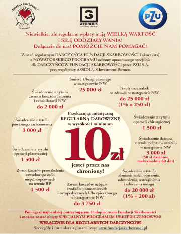 Niewielkie, ale regularne wpłaty mają WIELKĄ WARTOŚĆ i SIŁĘ ODDZIAŁYWANIA! Dołączcie do nas! POMÓŻCIE NAM POMAGAĆ! Zostań regularnym DARCZYŃCĄ FUNDACJI SKARBOWOŚCI i skorzystaj z NOWATORSKIEGO PROGRAMU ochrony opracowanego specjalnie dla DARCZYŃCÓW FUNDACJI SKARBOWOŚCI przez PZU S.A. przy współpracy ASSIDUUS Investment Partners Śmierć Ubezpieczonego w następstwie NW Świadczenie z tytułu zwrotu kosztów leczenia i rehabilatacji NW 25 000 zł Trwały uszczerbek na zdrowiu w następstwie NW do 25 000 zł (1% = 250 zł) do 2 000 zł Świadczenie z tytułu poważnego zachorowania 3 000 zł Świadczenie z tytułu operacji plastycznej 1 500 zł Przekazując miesięczną REGULARNĄ DAROWIZNĘ w wysokości minimum 10 jesteś przez nas chroniony! zł Świadczenie z tytułu operacji chirurgicznej 1 500 zł Świadczenie dzienne z tytułu pobytu w szpitalu w następstwie NW 3 000 zł (50 zł dziennie, maksymalnie 60 dni) Zwrot kosztów przeszkolenia Świadczenie z tytułu zawodowego osób złamania kości, oparzenia, niepełnosprawnych odmrożenia, wstrząśnienia na terenie RP i stłuczenia mózgu Zwrot kosztów nabycia środków pomocniczych 1 500 zł do 20 000 zł i ortopedycznych Ubezpieczonego (1% = 200 zł) w następstwie NW do 3 750 zł Pomagasz najbardziej potrzebującym Podopiecznym Fundacji Skarbowości i możesz zostać objęty SPECJALNYM PROGRAMEM UBEZPIECZENIOWYM! WYŁĄCZNIE DLA REGULARNYCH DARCZYŃCÓW! Szczegóły i formularz zgłoszeniowy: www.fundacjaskarbowosci.pl FUNDACJA SKARBOWOŚCI TWORZY WSPÓLNOTĘ OSÓB WSPIERAJACYCH SIĘ WZAJEMNIE. TY POMAGASZ WSPIERAĆ PODOPIECZNYCH FUNDACJI – MY DBAMY O CIEBIE! 10 zł Minimalna DAROWIZNA miesięcznie uruchamia PAKIET WIELU KORZYŚCI DLA DARCZYŃCY Rozpatrywanie przez Fundację Skarbowości w pierwszej kolejnosci, PILNIE wniosków o udzielenie pomocy od REGULARNYCH DARCZYŃCÓW Nowy program UBEZPIECZONY DARCZYŃCA FUNDACJI 5 zł zostaje przekazane na zabezpieczenie DARCZYŃCY, 5 zł pozostaje jako DAROWIZNA dla Podopiecznych Fundacji (obowiązuje tylko po wypełnieniu formularza zgłoszenia do programu: i przesłaniu na adres e-mail: [email protected]) Możliwość odliczenia DAROWIZNY od podatku w rozliczeniu rocznym. Minimum formalności Bezpłatny dostęp do porad Kancelarii Finansowej ASSIDUUS m. in. w tematach: • ubezpieczeń • kredytów • inwestycji • oszczędności • emerytur – III Filar Szybka wypłata świadczeń Bez ankiety medycznej, bez karencji Przejrzysty system obsługi i wypłaty należnych świadczeń gwarantowane przez Najstarsze Polskie Towarzystwo Ubezpieczeniowe PZU S.A. Proste zgłoszenie szkody: • internet: www.pzu.pl • telefon: 801 102 102 lub +48 22 566 55 55 • osobiście w Oddziale PZU S.A. Stały monitornig programu gwarantowany przez FUNDACJĘ SKARBOWOŚCI Warunki KONIECZNE przystąpienia do Programu UBEZPIECZONY DARCZYŃCA FUNDACJI SKARBOWOŚCI: 1. Przesłanie na adres e-mail: [email protected] prawidłowo wypełnionego formularza przystąpienia do Programu UBEZPIECZONY DARCZYNCA FUNDACJI lub wypełnienie formularza on-line (formularz dostępny na stronie: www.fundacjaskarbowosci.pl) 2. Regularne wpłaty DAROWIZNY – min. 10 zł miesięcznie, najpóźniej do końca miesiąca poprzedzającego ochronę ubezpieczeniową na numer konta właściwy dla DARCZYŃCÓW: PEKAO S.A. I/O Bydgoszcz 57 1240 1183 1111 0010 6410 8444 tytułem: DAROWIZNA (za jaki okres, za kogo) Dodatkowe informacje: e-mail: [email protected]; [email protected]; tel.: 52 332 92 41 Mariusz Geppert, e-mail: [email protected] copyright © 2016 by Magdalena Dworska copyright © 2016 for Fundacja Skarbowości im. Jana Pawła II