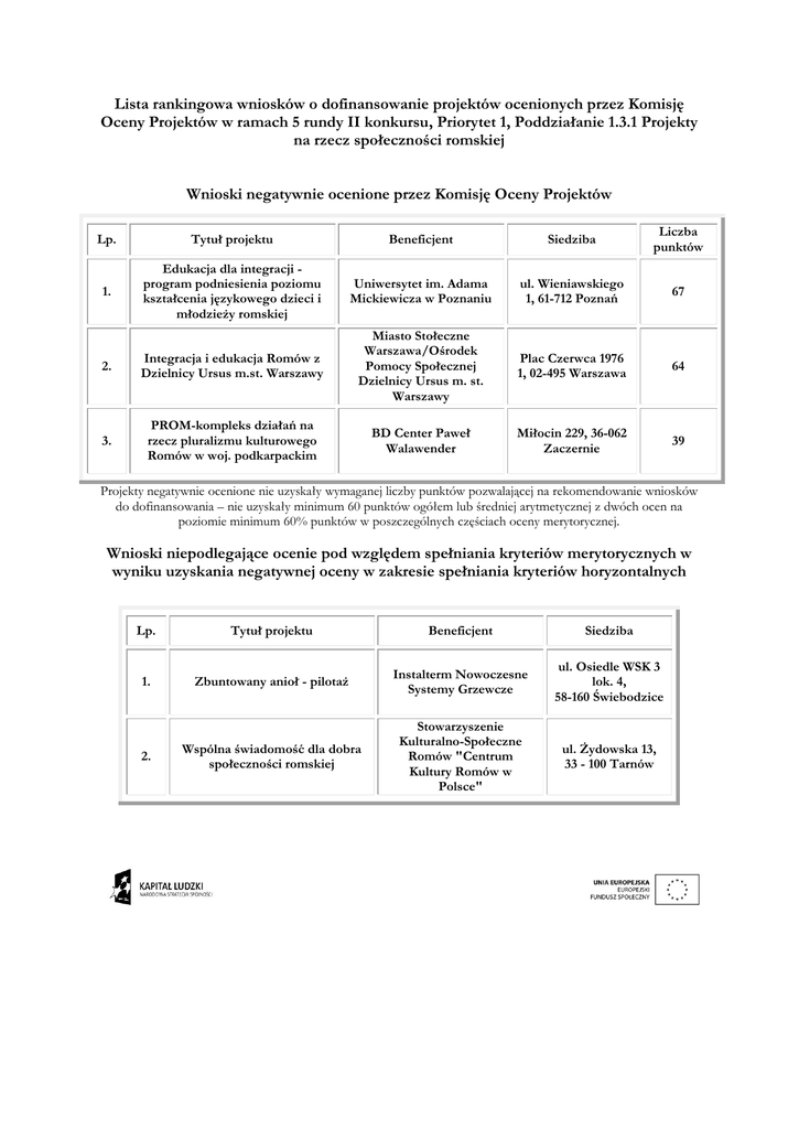 Lista rankingowa wniosków o dofinansowanie projektów ocenionych przez Komisję Oceny Projektów w ramach 5 rundy II konkursu, Priorytet 1, Poddziałanie 1.3.1 Projekty na rzecz społeczności romskiej Wnioski negatywnie ocenione przez Komisję Oceny Projektów Lp. Tytuł projektu Beneficjent Siedziba Liczba punktów 1. Edukacja dla integracji program podniesienia poziomu kształcenia językowego dzieci i młodzieży romskiej Uniwersytet im. Adama Mickiewicza w Poznaniu ul. Wieniawskiego 1, 61-712 Poznań 67 2. Integracja i edukacja Romów z Dzielnicy Ursus m.st. Warszawy Miasto Stołeczne Warszawa/Ośrodek Pomocy Społecznej Dzielnicy Ursus m. st. Warszawy Plac Czerwca 1976 1, 02-495 Warszawa 64 3. PROM-kompleks działań na rzecz pluralizmu kulturowego Romów w woj. podkarpackim BD Center Paweł Walawender Miłocin 229, 36-062 Zaczernie 39 Projekty negatywnie ocenione nie uzyskały wymaganej liczby punktów pozwalającej na rekomendowanie wniosków do dofinansowania – nie uzyskały minimum 60 punktów ogółem lub średniej arytmetycznej z dwóch ocen na poziomie minimum 60% punktów w poszczególnych częściach oceny merytorycznej. Wnioski niepodlegające ocenie pod względem spełniania kryteriów merytorycznych w wyniku uzyskania negatywnej oceny w zakresie spełniania kryteriów horyzontalnych Lp. Tytuł projektu Beneficjent Siedziba 1. Zbuntowany anioł - pilotaż Instalterm Nowoczesne Systemy Grzewcze ul. Osiedle WSK 3 lok. 4, 58-160 Świebodzice Wspólna świadomość dla dobra społeczności romskiej Stowarzyszenie Kulturalno-Społeczne Romów "Centrum Kultury Romów w Polsce" ul. Żydowska 13, 33 - 100 Tarnów 2.