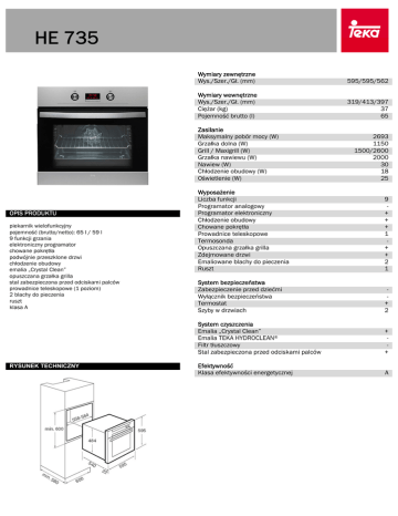 HE 735 Wymiary zewnętrzne Wys./Szer./Gł. (mm) 595/595/562 Wymiary wewnętrzne Wys./Szer./Gł. (mm) Ciężar (kg) Pojemność brutto (l) 319/413/397 37 65 Zasilanie Maksymalny pobór mocy (W) Grzałka dolna (W) Grill / Maxigrill (W) Grzałka nawiewu (W) Nawiew (W) Chłodzenie obudowy (W) Oświetlenie (W) OPIS PRODUKTU piekarnik wielofunkcyjny pojemność (brutto/netto): 65 l / 59 l 9 funkcji grzania elektroniczny programator chowane pokrętła podwójnie przeszklone drzwi chłodzenie obudowy emalia „Crystal Clean” opuszczana grzałka grilla stal zabezpieczona przed odciskami palców prowadnice teleskopowe (1 poziom) 2 blachy do pieczenia ruszt klasa A RYSUNEK TECHNICZNY 2693 1150 1500/2600 2000 30 18 25 Wyposażenie Liczba funkcji Programator analogowy Programator elektroniczny Chłodzenie obudowy Chowane pokrętła Prowadnice teleskopowe Termosonda Opuszczana grzałka grilla Zdejmowane drzwi Emaliowane blachy do pieczenia Ruszt 9 + + + 1 + + 2 1 System bezpieczeństwa Zabezpieczenie przed dziećmi Wyłącznik bezpieczeństwa Termostat Szyby w drzwiach + 2 System czyszczenia Emalia „Crystal Clean” Emalia TEKA HYDROCLEAN® Filtr tłuszczowy Stal zabezpieczona przed odciskami palców + + Efektywność Klasa efektywności energetycznej A