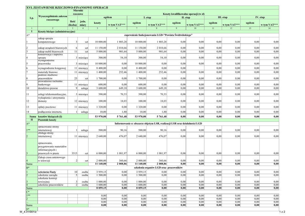 XVI. ZESTAWIENIE RZECZOWO-FINANSOWE OPERACJI Lp. 1 I Wyszczególnienie zakresu rzeczowego 2 Mierniki rzeczowe ogółem Ilość (liczba) jedn. miary koszty 3 4 5 w tym VAT*** 6 ogółem w tym VAT*** 7 8 ogółem w tym VAT*** 9 10 III. etap ogółem 11 IV. etap w tym VAT*** 12 ogółem w tym VAT*** 13 14 Koszty bieŜące (administracyjne) zapewnienie funkcjonowania LGD-"Powiatu Świdwińskiego" A* 1 Koszty kwalifikowalne operacji (w zł) II. etap I. etap zakup sprzętu komputerowego 3 szt 10 000,00 1 803,28 10 000,00 1 803,28 0,00 0,00 0,00 0,00 0,00 0,00 zakup urządzeń biurowych zakup mebli biurowych konserwacja i naprawa sprzętu wynagrodzenie pracownika 6 11 szt szt 11 150,00 5 000,00 2 010,66 901,64 11 150,00 5 000,00 2 010,66 901,64 0,00 0,00 0,00 0,00 0,00 0,00 0,00 0,00 0,00 0,00 0,00 0,00 3 miesiące 300,00 54,10 300,00 54,10 0,00 0,00 0,00 0,00 0,00 0,00 3 miesiące 10 000,00 0,00 10 000,00 0,00 0,00 0,00 0,00 0,00 0,00 0,00 wynagrodzenie księgowej materiały biurowe podróŜe słuŜbowe pracowników prowadzenie rachunku bankowego doradztwo prawne 11 miesięcy 11 miesięcy 8 400,00 1 400,00 0,00 252,46 8 400,00 1 400,00 0,00 252,46 0,00 0,00 0,00 0,00 0,00 0,00 0,00 0,00 0,00 0,00 0,00 25 szt 1 700,00 0,00 1 700,00 0,00 0,00 0,00 0,00 0,00 0,00 0,00 11 miesięcy 9 usługa 600,00 3 600,00 0,00 649,18 600,00 3 600,00 0,00 649,18 0,00 0,00 0,00 0,00 0,00 0,00 0,00 0,00 0,00 0,00 0,00 0,00 3 miesiące 390,00 70,33 390,00 70,33 0,00 0,00 0,00 0,00 0,00 0,00 12 usługi telekomunikacyjne, wykupienia i utrzymania domeny 12 miesięcy 100,00 18,03 100,00 18,03 0,00 0,00 0,00 0,00 0,00 0,00 13 opłaty pocztowe 11 miesięcy 1 320,00 0,00 1 320,00 0,00 0,00 0,00 0,00 0,00 0,00 0,00 14 podłączenia internetu, 10,00 1,80 10,00 1,80 0,00 0,00 0,00 0,00 0,00 0,00 53 970,00 5 761,48 53 970,00 5 761,48 0,00 0,00 0,00 0,00 0,00 0,00 2 3 4 5 6 7 8 9 10 11 Suma kosztów bieŜących (I) II Pozostałe koszty A* opracowanie strony 1** internetowej obsługa strony 2 internetowej 3 4 Suma B* 1 2 3 4 Suma C* 1** 2 ... Suma opracowanie, przygotowanie materiałów informacyjnych i prasowych w prasie Zakup czasu antenowego w telewizji szkolenie Rady szkolenie zarządu szkolenie komisji rewizyjnej szkolenie pracowników 1 usługa Informowanie o: obszarze objetym LSR, realizacji LSR oraz działalności LGD 1 usługa 500,00 90,16 500,00 90,16 0,00 0,00 0,00 0,00 0,00 0,00 11 miesięcy 2 640,00 476,07 2 640,00 476,07 0,00 0,00 0,00 0,00 0,00 0,00 6 000,00 1 081,97 0,00 0,00 0,00 0,00 0,00 0,00 2 000,00 360,66 0,00 11 140,00 2 008,86 0,00 szkolenia organów LGD oraz pracowników 0,00 0,00 0,00 0,00 0,00 0,00 0,00 0,00 0,00 0,00 3515 szt 6 000,00 1 081,97 2 szt 2 000,00 11 140,00 360,66 2 008,86 10 5 osoba osoba 3 959,15 1 500,00 0,00 0,00 3 959,15 1 500,00 0,00 0,00 0,00 0,00 0,00 0,00 0,00 0,00 0,00 0,00 0,00 0,00 0,00 0,00 3 2 osoba osoba 1 000,00 1 600,00 8 059,15 0,00 0,00 0,00 1 000,00 1 600,00 8 059,15 0,00 0,00 0,00 0,00 0,00 0,00 0,00 0,00 0,00 0,00 0,00 0,00 0,00 0,00 0,00 0,00 0,00 0,00 0,00 0,00 0,00 0,00 0,00 0,00 0,00 0,00 0,00 0,00 0,00 0,00 0,00 0,00 0,00 0,00 0,00 0,00 0,00 0,00 0,00 0,00 0,00 0,00 0,00 0,00 0,00 0,00 0,00 0,00 0,00 0,00 0,00 0,00 0,00 0,00 0,00 0,00 0,00 0,00 0,00 0,00 0,00 D* W_4.31/001/z 1z2 1** 2 … Suma E* 1** 2 … Suma Suma kosztów pozostałych ( II ) III Suma kosztów kwalifikowalnych (I+II) 0,00 0,00 0,00 0,00 0,00 0,00 0,00 0,00 0,00 0,00 0,00 0,00 0,00 0,00 0,00 0,00 0,00 0,00 0,00 0,00 0,00 0,00 0,00 0,00 0,00 0,00 0,00 0,00 0,00 0,00 0,00 0,00 0,00 0,00 0,00 0,00 0,00 0,00 0,00 0,00 0,00 0,00 0,00 0,00 0,00 0,00 0,00 0,00 0,00 0,00 0,00 0,00 0,00 0,00 0,00 0,00 0,00 0,00 0,00 0,00 0,00 0,00 0,00 0,00 0,00 0,00 0,00 0,00 0,00 0,00 0,00 0,00 0,00 0,00 0,00 0,00 0,00 0,00 0,00 0,00 19 199,15 2 008,86 19 199,15 2 008,86 0,00 0,00 0,00 0,00 0,00 0,00 73 169,15 7 770,34 73 169,15 7 770,34 0,00 0,00 0,00 0,00 0,00 0,00 * zadanie lub grupa zadań realizowanych w ramach zakresu wsparcia ** zadanie lub dostawa/robota/usługa realizowana w ramach zadania *** VAT, jeśli jest kosztem kwalifikowalnym W_4.31/001/z 2z2