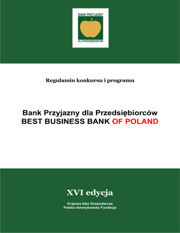 Bank Przyjazny dla Przedsiębiorców – BEST BUSINESS BANK OF POLAND Regulamin konkursu i programu certyfikacyjnego Regulamin konkursu i programu Bank Przyjazny dla Przedsiębiorców BEST BUSINESS BANK OF POLAND XVI edycja Krajowa Izba Gospodarcza Polsko-Amerykańska Fundacja Krajowa Izba Gospodarcza Polsko-Amerykańska Fundacja Doradztwa dla Małych Przedsiębiorstw 1 Bank Przyjazny dla Przedsiębiorców – BEST BUSINESS BANK OF POLAND Doradztwa dla Małych Przedsiębiorstw Spis Treści I. KONKURS BANK PRZYJAZNY DLA PRZEDSIĘBIORCÓW 1. Cel konkursu. Definicja przyjaznej instytucji finansującej przedsiębiorców………………………………………………………………… 3 2. Organizatorzy konkursu……………………………………………………….. 3 3. Kapituła Konkursu i Organy Współdziałające……………………………... 4 4. Kategorie konkursu…………………………………………………………….. 4 5. Nagrody…………………………………………………………………………... 5 6. Harmonogram realizacji konkursu…………………………………………... 6 7. Kryteria oceny…………………………………………………………………… 6 8. Tryb oceny konkursowej………………………………………………………. 8 9. Informacje na temat konkursu, zaznajamianie przedsiębiorców z wynikami konkursu………………………………………. 8 10. Wpłaty związane z konkursem………………………………………………... 9 II. PROGRAM BEST BUSINESS BANK OF POLAND 1. Cele programu …………………………………………………….…................ 11 2. Kategorie wyróżnień………………………………………………………….... 12 3. Zasady uczestnictwa banków w programie………………….…………..... 12 4. Zasady prowadzenia programu……………………………………………… 12 Krajowa Izba Gospodarcza Polsko-Amerykańska Fundacja Doradztwa dla Małych Przedsiębiorstw 2 Bank Przyjazny dla Przedsiębiorców – BEST BUSINESS BANK OF POLAND 1. Cel konkursu. Definicja przyjaznej instytucji finansującej przedsiębiorców 1.1. Cel konkursu Celem konkursu Bank Przyjazny dla Przedsiębiorców jest wspieranie budowy wysokiej kultury współpracy pomiędzy instytucjami finansowymi a przedsiębiorcami, tworzenie klimatu wzajemnego zaufania, popularyzowanie innowacji wprowadzanych w instytucjach finansowych, zmierzających do lepszego zaspokojenia potrzeb finansowych małych i średnich przedsiębiorstw (MSP)1 oraz uzyskanie synergicznego efektu rozwojowego banków jak i całego sektora MSP w Polsce. Konkurs ma za zadanie wyróżnić te instytucje finansowe, które dokonały poważnego wysiłku, aby w większym stopniu udostępnić swoje usługi dla małych i średnich przedsiębiorstw. Godło Promocyjne wskazuje przedsiębiorcom te instytucje finansowe, które charakteryzują się rzeczowym podejściem i zrozumieniem specyfiki ich problemów a także, które dokonały niezbędnego wysiłku, aby wykorzystać pojawiające się możliwości budowy silnych więzi z sektorem MSP, zarówno przy wykorzystaniu nowych technologii jak i efektywnej współpracy zespołowej. Zamierzeniem organizatorów konkursu jest zainicjowanie współzawodnictwa zarówno pomiędzy bankami jak i oddziałami opartego na zasadzie dobrej współpracy, prowadzącego w ostatecznym rezultacie do wzrostu rynku wsparcia finansowego MSP w Polsce. 1.2. Definicja Banku lub Oddziału Przyjaznego dla Przedsiębiorców Bank Przyjazny dla Przedsiębiorców lub Przedsiębiorców jest to taka organizacja, która: Oddział Przyjazny dla • dysponuje ofertą produktów dostosowanych do specyfiki MSP, • posiada koncepcję zwiększenia udziału MSP w wartości oferowanych usług, • kadra legitymuje się stosownym doświadczeniem w zakresie obsługi MSP lub obecnie szkoli się w tym zakresie, • jakość obsługi przedsiębiorców jest wysoka i jednocześnie poparta stosownym badaniem klientów w trakcie II etapu konkursu, • posiada wysoką kulturę korporacyjną i potrafi ją wykorzystać do budowy więzi z sektorem MSP, • kreatywnie wykorzystuje swój kapitał ludzki do budowy projektów współpracy z przedsiębiorcami, • jest przedsiębiorcza i aktywna w segmencie MSP. 2. Organizatorzy konkursu Organizatorami konkursu są: 2.1. Krajowa Izba Gospodarcza (KIG) została powołana w 1990 roku przez regionalne i lokalne izby gospodarcze z całego kraju. Krajowa Izba Gospodarcza zrzesza ponad 130 izb gospodarczych. Głównym celem działania KIG jest reprezentacja środowiska przedsiębiorców wobec władz publicznych. 1 Małe i Średnie Przedsiębiorstwa to firmy zatrudniające do 250 pracowników. Krajowa Izba Gospodarcza Polsko-Amerykańska Fundacja Doradztwa dla Małych Przedsiębiorstw 3 Bank Przyjazny dla Przedsiębiorców – BEST BUSINESS BANK OF POLAND 2.2 Polsko-Amerykańska Fundacja Doradztwa dla Małych Przedsiębiorstw, została założona w 1992 roku przez Krajową Izbę Gospodarczą oraz korporację Scientex International Inc., Va. USA, reprezentującą Komisję Kongresu USA ds. Małych Przedsiębiorstw w Europie Środkowej. Celem Fundacji jest pomoc w rozwoju małych i średnich przedsiębiorstw w Polsce. 3. Kapituła Konkursu i Organy Współdziałające 3.1. Kapituła Konkursu jest najważniejszą władzą konkursu, która podejmuje decyzje o nadaniu nagród. Kapituła składa się z przedstawicieli władz, organizacji zrzeszających przedsiębiorców, jednostek wspierania przedsiębiorczości oraz przedstawicieli nauki. 3.2. Zespół Audytorów - zadaniem Audytorów jest dokonanie ocen wstępnych w oparciu o pisemną prezentację instytucji finansowych w ramach I etapu konkursu. Ponadto Audytorzy badają funkcjonowanie jednostki zgłoszonej do konkursu w jej siedzibie oraz opracowują wyniki badań przedsiębiorców na temat jakoś