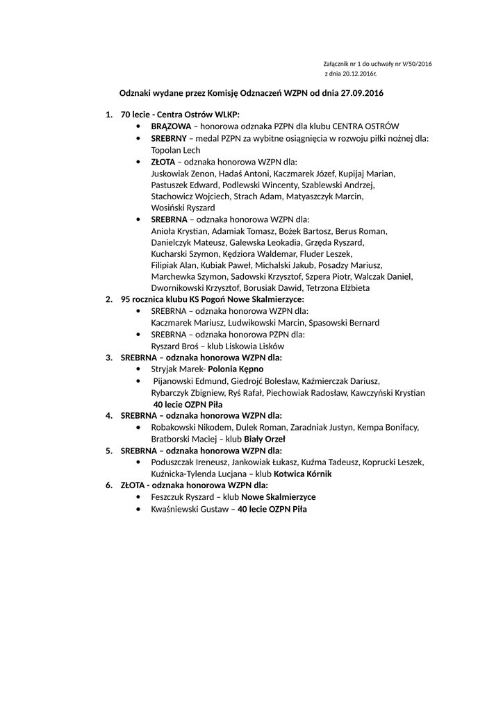 Załącznik nr 1 do uchwały nr V/50/2016 z dnia 20.12.2016r. Odznaki wydane przez Komisję Odznaczeń WZPN od dnia 27.09.2016 1. 70 lecie - Centra Ostrów WLKP: BRĄZOWA – honorowa odznaka PZPN dla klubu CENTRA OSTRÓW SREBRNY – medal PZPN za wybitne osiągnięcia w rozwoju piłki nożnej dla: Topolan Lech ZŁOTA – odznaka honorowa WZPN dla: Juskowiak Zenon, Hadaś Antoni, Kaczmarek Józef, Kupijaj Marian, Pastuszek Edward, Podlewski Wincenty, Szablewski Andrzej, Stachowicz Wojciech, Strach Adam, Matyaszczyk Marcin, Wosiński Ryszard SREBRNA – odznaka honorowa WZPN dla: Anioła Krystian, Adamiak Tomasz, Bożek Bartosz, Berus Roman, Danielczyk Mateusz, Galewska Leokadia, Grzęda Ryszard, Kucharski Szymon, Kędziora Waldemar, Fluder Leszek, Filipiak Alan, Kubiak Paweł, Michalski Jakub, Posadzy Mariusz, Marchewka Szymon, Sadowski Krzysztof, Szpera Piotr, Walczak Daniel, Dwornikowski Krzysztof, Borusiak Dawid, Tetrzona Elżbieta 2. 95 rocznica klubu KS Pogoń Nowe Skalmierzyce: SREBRNA – odznaka honorowa WZPN dla: Kaczmarek Mariusz, Ludwikowski Marcin, Spasowski Bernard SREBRNA – odznaka honorowa PZPN dla: Ryszard Broś – klub Liskowia Lisków 3. SREBRNA – odznaka honorowa WZPN dla: Stryjak Marek- Polonia Kępno Pijanowski Edmund, Giedrojć Bolesław, Kaźmierczak Dariusz, Rybarczyk Zbigniew, Ryś Rafał, Piechowiak Radosław, Kawczyński Krystian 40 lecie OZPN Piła 4. SREBRNA – odznaka honorowa WZPN dla: Robakowski Nikodem, Dulek Roman, Zaradniak Justyn, Kempa Bonifacy, Bratborski Maciej – klub Biały Orzeł 5. SREBRNA – odznaka honorowa WZPN dla: Poduszczak Ireneusz, Jankowiak Łukasz, Kuźma Tadeusz, Koprucki Leszek, Kuźnicka-Tylenda Lucjana – klub Kotwica Kórnik 6. ZŁOTA - odznaka honorowa WZPN dla: Feszczuk Ryszard – klub Nowe Skalmierzyce Kwaśniewski Gustaw – 40 lecie OZPN Piła