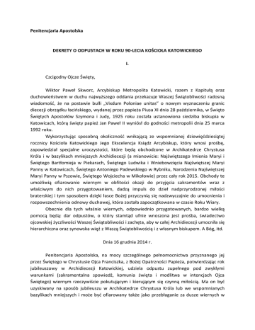 Penitencjaria Apostolska DEKRETY O ODPUSTACH W ROKU 90-LECIA KOŚCIOŁA KATOWICKIEGO I. Czcigodny Ojcze Święty, Wiktor Paweł Skworc, Arcybiskup Metropolita Katowicki, razem z Kapitułą oraz duchowieństwem w duchu najwyższego oddania przekazuje Waszej Świątobliwości radosną wiadomość, że na postawie bulli „Vixdum Poloniae unitas” o nowym wyznaczeniu granic diecezji obrządku łacińskiego, wydanej przez papieża Piusa XI dnia 28 października, w Święto Świętych Apostołów Szymona i Judy, 1925 roku została ustanowiona siedziba biskupia w Katowicach, którą święty papież Jan Paweł II wyniósł do godności metropolii dnia 25 marca 1992 roku. Wykorzystując sposobną okoliczność wnikającą ze wspomnianej dziewięćdziesiątej rocznicy Kościoła Katowickiego Jego Ekscelencja Ksiądz Arcybiskup, który wnosi prośbę, zapowiedział specjalne uroczystości, które będą obchodzone w Archikatedrze Chrystusa Króla i w bazylikach mniejszych Archidiecezji (a mianowicie: Najświętszego Imienia Maryi i Świętego Bartłomieja w Piekarach, Świętego Ludwika i Wniebowzięcia Najświętszej Maryi Panny w Katowicach, Świętego Antoniego Padewskiego w Rybniku, Narodzenia Najświętszej Maryi Panny w Pszowie, Świętego Wojciecha w Mikołowie) przez cały rok 2015. Obchody te umożliwią ofiarowanie wiernym w obfitości okazji do przyjęcia sakramentów wraz z właściwym do nich przygotowaniem, dadzą impuls do dzieł nadprzyrodzonej miłości braterskiej i tym sposobem dzięki łasce Bożej przyczynią się nadzwyczajnie do umocnienia i rozpowszechnienia odnowy duchowej, która została zapoczątkowana w czasie Roku Wiary. Obecnie dla tych właśnie wiernych, odpowiednio przygotowanych, bardzo wielką pomocą będą: dar odpustów, o który stamtąd ufnie wnoszona jest prośba, świadectwo ojcowskiej życzliwości Waszej Świątobliwości i zachęta, aby w całej Archidiecezji umocniła się hierarchiczna oraz synowska więź z Waszą Świątobliwością i z własnym biskupem. A Bóg, itd. Dnia 16 grudnia 2014 r. Penitencjaria Apostolska, na mocy szczególnego pełnomocnictwa przyznanego jej przez Świętego w Chrystusie Ojca Franciszka, z Bożej Opatrzności Papieża, potwierdzając rok jubileuszowy w Archidiecezji Katowickiej, udziela odpustu zupełnego pod zwykłymi warunkami (sakramentalna spowiedź, komunia święta i modlitwa w intencjach Ojca Świętego) wiernym rzeczywiście pokutującym i kierującym się czynną miłością. Ma on być uzyskiwany na sposób jubileuszu w Archikatedrze Chrystusa Króla lub we wspomnianych bazylikach mniejszych i może być ofiarowany także jako przebłaganie za dusze wiernych w czyśćcu cierpiące. Wierni mogą go uzyskać, jeśli pobożnie wezmą udział w uroczystościach jubileuszowych lub pielgrzymkach, albo przynajmniej przez odpowiednią długość czasu będą zanosić do Boga modlitwy o wierność Polski dla chrześcijańskiego powołania, o pomnażanie powołań kapłańskich i zakonnych oraz o obronę instytucji rodziny ludzkiej, a zakończą ten czas Modlitwą Pańską, Wyznaniem Wiary i wezwaniami do Najświętszej Maryi Panny, Królowej Polski. Osoby w podeszłym wieku, chorzy i ci wszyscy, którzy z poważnego powodu nie są w stanie wychodzić z domu, również będą mogli uzyskać odpust zupełny, jeżeli wyrzekną się jakiegokolwiek grzechu i wzbudzą intencję, kiedy tylko to będzie możliwe, spełnienia trzech zwykłych warunków, a ponadto jeśli duchowo połączą się z obchodami uroczystości jubileuszowych, ofiarując miłosiernemu Bogu przez Maryję swoje modlitwy i cierpienia. W celu zatem spowodowania, dzięki miłości pasterskiej, łatwiejszego przystępu do Bożego przebaczenia, które ma być uzyskiwane przez klucze Kościoła, Penitencjaria usilnie prosi o to, aby kanonik penitencjarz, członkowie kapituły, rektorzy bazylik i inni prezbiterzy, obdarzeni odpowiednimi upoważnieniami do słuchania spowiedzi, z ochoczym i wielkodusznym usposobieniem podejmowali się sprawowania sakramentu pokuty i często rozdzielali komunię św. chorym. Niniejsze rozporządzenie będzie obowiązywało w ciągu całego czasu trwania jubileuszu Kościoła Katowickiego niezależnie od jakichkolwiek przeciwnych rozporządzeń. Kard. Mauro Piacenza Wielki Penitencjarz Ks. prałat Krzysztof Nykiel Regent II. Penitencjaria Apostolska, na mocy szczególnego pełnomocnictwa przyznanego jej przez Świętego w Chrystusie Ojca i Pana Naszego Franciszka, z Bożej Opatrzności Papieża, łaskawie zezwala Wielce Dostojnemu i Czcigodnemu Księdzu Arcybiskupowi Wiktorowi Pawłowi Skworcowi, Metropolicie Katowickiemu, aby z okazji Jubileuszu Kościoła Katowickiego, dokonując wyboru dnia ze względu na pożytek wiernych, po złożeniu Najświętszej Ofiary udzielił wszystkim zgromadzonym wiernym, którzy całkowicie wolni od przywiązania do grzechu będą brali udział w tychże świętych obrzędach, papieskiego błogosławieństwa połączonego z uzyskaniem odpustu zupełnego pod zwykłymi warunkami (sakramentalna spowiedź, komunia święta i modlitwa w intencjach Ojca Świętego). Wierni, którzy pobożnie przyjmą papieskie błogosławieństwo, nawet jeśli ze zrozumiałych względów nie będą fizycznie uczestniczyć w świętych obrzędach, ale w trakcie ich sprawowania będą je śledzili z nabożnym usposobieniem poprzez transmisję telewizyjną lub radiową, będą mogli uzyskać odpust zupełny zgodnie z przepisami prawa. Niezależnie od jakichkolwiek przeciwnych rozporządzeń. Wydano w Rzymie, w siedzibie Penitencjarii Apostolskiej, dnia 16 grudnia, Roku Pańskiego 2014. Kard. Mauro Piacenza Wielki Penitencjarz Ks. prał. Krzysztof Nykiel Regent
