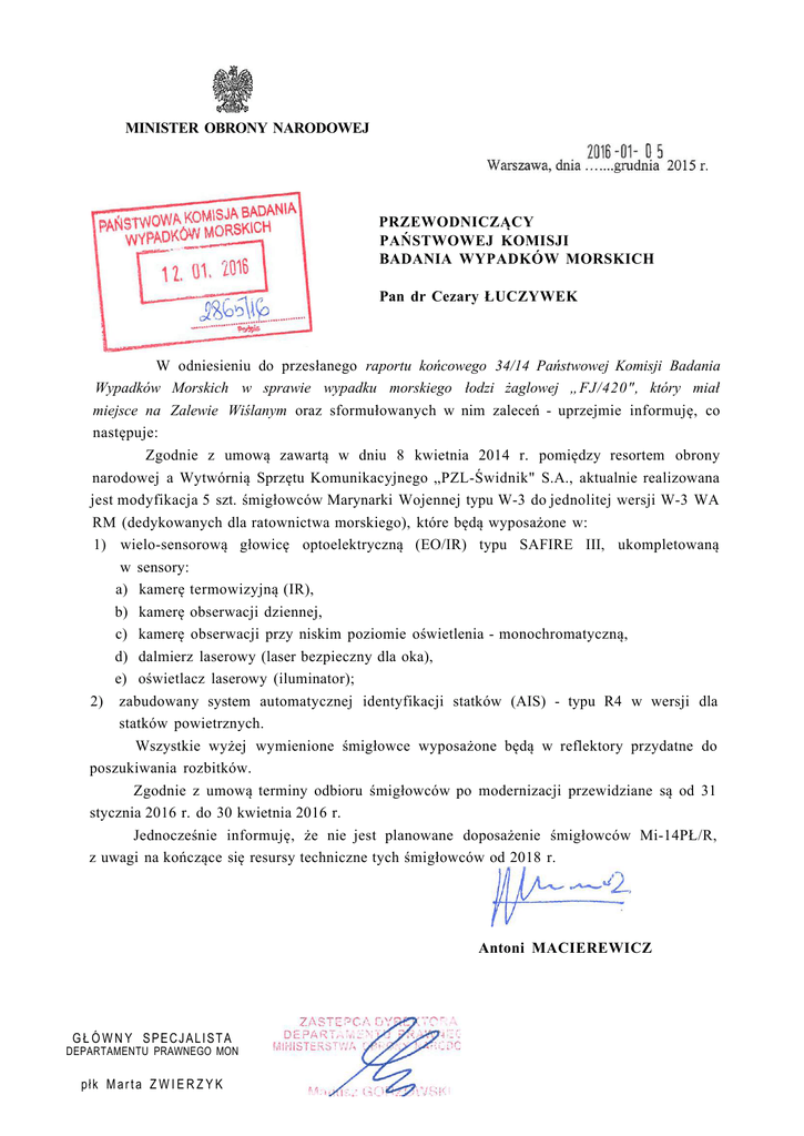 MINISTER OBRONY NARODOWEJ PRZEWODNICZĄCY PAŃSTWOWEJ KOMISJI BADANIA WYPADKÓW MORSKICH Pan dr Cezary ŁUCZYWEK W odniesieniu do przesłanego raportu końcowego 34/14 Państwowej Komisji Badania Wypadków Morskich w sprawie wypadku morskiego łodzi żaglowej „FJ/420", który miał miejsce na Zalewie Wiślanym oraz sformułowanych w nim zaleceń - uprzejmie informuję, co następuje: Zgodnie z umową zawartą w dniu 8 kwietnia 2014 r. pomiędzy resortem obrony narodowej a Wytwórnią Sprzętu Komunikacyjnego „PZL-Świdnik" S.A., aktualnie realizowana jest modyfikacja 5 szt. śmigłowców Marynarki Wojennej typu W-3 do jednolitej wersji W-3 WA RM (dedykowanych dla ratownictwa morskiego), które będą wyposażone w: 1) wielo-sensorową głowicę optoelektryczną (EO/IR) typu SAFIRE III, ukompletowaną w sensory: a) kamerę termowizyjną (IR), b) kamerę obserwacji dziennej, c) kamerę obserwacji przy niskim poziomie oświetlenia - monochromatyczną, d) dalmierz laserowy (laser bezpieczny dla oka), e) oświetlacz laserowy (iluminator); 2) zabudowany system automatycznej identyfikacji statków (AIS) - typu R4 w wersji dla statków powietrznych. Wszystkie wyżej wymienione śmigłowce wyposażone będą w reflektory przydatne do poszukiwania rozbitków. Zgodnie z umową terminy odbioru śmigłowców po modernizacji przewidziane są od 31 stycznia 2016 r. do 30 kwietnia 2016 r. Jednocześnie informuję, że nie jest planowane doposażenie śmigłowców Mi-14PŁ/R, z uwagi na kończące się resursy techniczne tych śmigłowców od 2018 r. Antoni MACIEREWICZ G Ł Ó W N Y SPECJALISTA DEPARTAMENTU PRAWNEGO MON płk M a r t a Z W I E R Z Y K