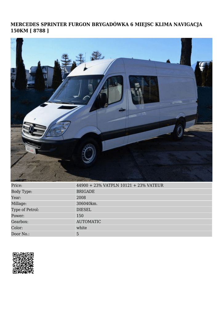 MERCEDES SPRINTER FURGON BRYGADÓWKA 6 MIEJSC KLIMA NAVIGACJA 150KM [ 8788 ] Price: Body Type: Year: Millage: Type of Petrol: Power: Gearbox: Color: Door No.: 44900 + 23% VATPLN 10121 + 23% VATEUR BRIGADE 2008 306040km. DIESEL 150 AUTOMATIC white 5 ADDITIONAL INFORMATION ● ● ● ● ● accident-free serwisowany w ASO sprowadzony zarejestrowany w polsce stan bardzo dobry OPTIONAL EXTRAS ● ● ● ● ● ● ● ● ● ● ● ABS centralny zamek elektryczne lusterka immobiliser klimatyzacja komputer kontrola trakcji szyberdach tempomat wspomaganie kierownicy elektryczne szyby DESCRIPTION OFFER NUMBER -8788 Mercedes Sprinter 315 Box-type delivery van double cab 6 seats. Year of manufacture 2008, white color. Never crashed car, is fully functional. Greate condition. Serviced in ASO. Everything works as it should. Car has automatic gearbox. The spacious interior is clean and tidy. It can accommodate 6 people. Painting in perfect condition. Greate work engine, gearbox and suspension. The engine, 2.2 CDI has power 150HP. Sprinter with aircondition, cruise control and navigation. Equipment: - ABS, ASR - Driver airbag - Aircondition - Cruise control - Navigation - Power Steering - Central locking - Immobilizer - Electric windows and mirrors - Radio CD - 6 seats - Service book - Dimensions of the cargo area: length / 325 cm / width / 177 cm / Height / 194 cm /