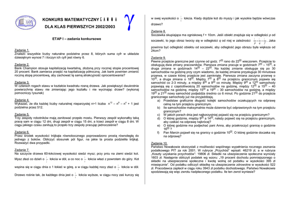 KONKURS MATEMATYCZNY GAMMA DLA KLAS PIERWSZYCH 2002/2003 g ETAP I – zadania konkursowe Zadanie 1. Znaleźć wszystkie liczby naturalne podzielne przez 8, których suma cyfr w układzie dziesiętnym wynosi 7 i iloczyn ich cyfr jest równy 6. Zadanie 2. Bank Champion stosuje kapitalizację kwartalną, złożoną przy rocznej stopie procentowej 20 procent. Bank zamierza przejść na kapitalizację półroczną. Jak bank powinien zmienić roczną stopę procentową, aby zachować tę samą atrakcyjność oprocentowania? Zadanie 3. W czterech rogach stawu w kształcie kwadratu rosną drzewa. Jak powiększyć dwukrotnie powierzchnię stawu nie zmieniając jego kształtu i nie wycinając drzew? (wykonaj pomocniczy rysunek) Zadanie 4. Wykazać, że dla każdej liczby naturalnej nieparzystej n>1 liczba n12 – n8 – n4 + 1 jest podzielna przez 512. Zadanie 5. Trzy zespoły robotników mają zanitować przęsło mostu. Pierwszy zespół wykonałby taką pracę sam w ciągu 12 dni, drugi zespół w ciągu 15 dni, a trzeci zespół w ciągu 8 dni. W ciągu jakiego czasu zanitują to przęsło trzy zespoły pracując jednocześnie? Zadanie 6. Przez środek wysokości trójkąta równobocznego poprowadzono prostą równoległą do jednego z boków. Obliczyć stosunek pól figur, na jakie ta prosta podzieliła trójkąt. Rozważyć dwa przypadki. Zadanie 7. Na szczycie drzewa 60-łokciowej wysokości siedzi mysz; przy pniu na ziemi siedzi kot. 1 1 łokcia w dół, a co noc o łokcia włazi z powrotem do góry. Kot 2 6 1 wspina się w ciągu dnia o 1 łokieć w górę, a w ciągu każdej nocy złazi o łokcia w dół. 4 1 Drzewo rośnie tak, że każdego dnia jest o łokcia wyższe, w ciągu nocy zaś kurczy się 4 Mysz złazi co dzień o w swej wysokości o 1 łokcia. Kiedy dojdzie kot do myszy i jak wysokie będzie wówczas 8 drzewo? Zadanie 8. Soczewka skupiająca ma ogniskową f = 10cm. Jeśli obiekt znajduje się w odległości p od soczewki, to jego obraz tworzy się w odległości q od niej w zależności 1 1 1 + = . Jaka p q f powinna być odległość obiektu od soczewki, aby odległość jego obrazu była większa od 24cm? Zadanie 9. Pewne przejście graniczne jest czynne od godz. 700 rano do 2200 wieczorem. Przejście to obsługują dwie zmiany pracowników. Pierwsza zmiana pracuje w godzinach 700 – 1500, a 00 druga zmiana w godzinach 1400 – 22 . Na każdej zmianie obsługuje się po 30 samochodów na godzinę przy czym wiadomo, że każdej zmianie przysługuje 30 minutowa przerwa, w czasie której przejście jest zamknięte. Pierwsza zmiana zaczyna przerwę o 1030, a druga zmiana o 1800. Między 700 a 800 na przejściu granicznym pojawia się samochód co 2-3 minuty, a między 800 a 900 co minutę. Między 900 a 1200 samochody pojawiają się z częstotliwością 20 samochodów na godzinę, między 1200 a 1500 – 40 samochodów na godzinę, między 1500 a 1900 – 30 samochodów na godzinę, a między 1900 a 2100 nowy samochód podjeżdża średnio co 6 minut. Po godzinie 2100 do przejścia granicznego samochody już nie przyjeżdżają. a) Przedstaw graficznie długość kolejki samochodów oczekujących na odprawę celną na tym przejściu granicznym. b) Ile samochodów maksymalnie może dziennie być odprawionych na tym przejściu granicznym? c) W jakich porach dnia jest najkorzystniej pojawić się na przejściu granicznym? d) O której godzinie, między 900 a 1400, należy pojawić się na przejściu granicznym, aby czekać na odprawę najkrócej? e) O której godzinie ma podjechać pani Anna, aby przekroczyć granicę o godzinie 1600 ? f) Pan Marcin pojawił się na granicy o godzinie 1000. O której godzinie doczeka się na odprawę? Zadanie 10. Państwo Nowakowie skorzystali z możliwości wspólnego wypełnienia rocznego zeznania podatkowego PIT za rok 2001. W rubryce „Przychód” wpisali: 46219 zł, a w rubryce „Koszty uzyskania przychodów”: 19806 zł. Składki na ubezpieczenie społeczne wyniosły 1603 zł. Następnie obliczyli podatek wg wzoru: „19 procent dochodu pomniejszonego o składki na ubezpieczenie społeczne i kwotę wolną od podatku w wysokości 395 zł miesięcznie”. Od podatku odliczyli składkę na ubezpieczenie zdrowotne w wysokości 522 zł. Pracodawca zapłacił w ciągu roku 3943 zł podatku dochodowego. Państwo Nowakowie spodziewają się więc zwrotu nadpłaconego podatku. Ile ten zwrot wyniesie?