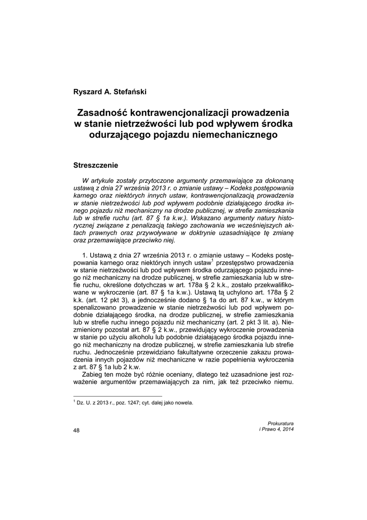 R. A. Stefański Ryszard A. Stefański Zasadność kontrawencjonalizacji prowadzenia w stanie nietrzeźwości lub pod wpływem środka odurzającego pojazdu niemechanicznego Streszczenie W artykule zostały przytoczone argumenty przemawiające za dokonaną ustawą z dnia 27 września 2013 r. o zmianie ustawy – Kodeks postępowania karnego oraz niektórych innych ustaw, kontrawencjonalizacją prowadzenia w stanie nietrzeźwości lub pod wpływem podobnie działającego środka innego pojazdu niŜ mechaniczny na drodze publicznej, w strefie zamieszkania lub w strefie ruchu (art. 87 § 1a k.w.). Wskazano argumenty natury historycznej związane z penalizacją takiego zachowania we wcześniejszych aktach prawnych oraz przywoływane w doktrynie uzasadniające tę zmianę oraz przemawiające przeciwko niej. 1. Ustawą z dnia 27 września 2013 r. o zmianie ustawy – Kodeks postępowania karnego oraz niektórych innych ustaw1 przestępstwo prowadzenia w stanie nietrzeźwości lub pod wpływem środka odurzającego pojazdu innego niŜ mechaniczny na drodze publicznej, w strefie zamieszkania lub w strefie ruchu, określone dotychczas w art. 178a § 2 k.k., zostało przekwalifikowane w wykroczenie (art. 87 § 1a k.w.). Ustawą tą uchylono art. 178a § 2 k.k. (art. 12 pkt 3), a jednocześnie dodano § 1a do art. 87 k.w., w którym spenalizowano prowadzenie w stanie nietrzeźwości lub pod wpływem podobnie działającego środka, na drodze publicznej, w strefie zamieszkania lub w strefie ruchu innego pojazdu niŜ mechaniczny (art. 2 pkt 3 lit. a). Niezmieniony pozostał art. 87 § 2 k.w., przewidujący wykroczenie prowadzenia w stanie po uŜyciu alkoholu lub podobnie działającego środka pojazdu innego niŜ mechaniczny na drodze publicznej, w strefie zamieszkania lub strefie ruchu. Jednocześnie przewidziano fakultatywne orzeczenie zakazu prowadzenia innych pojazdów niŜ mechaniczne w razie popełnienia wykroczenia z art. 87 § 1a lub 2 k.w. Zabieg ten moŜe być róŜnie oceniany, dlatego teŜ uzasadnione jest rozwaŜenie argumentów przemawiających za nim, jak teŜ przeciwko niemu. 1 Dz. U. z 2013 r., poz. 1247; cyt. dalej jako nowela. 48 Prokuratura i Prawo 4, 2014 Zasadność kontrawencjonalizacji prowadzenia w stanie nietrzeźwości… Jest to o tyle istotne, Ŝe problematyka rodzaju odpowiedzialności za prowadzenie w stanie nietrzeźwości pojazdu zarówno mechanicznego, jak i niemechanicznego wywołuje kontrowersje w literaturze, a takŜe stwarza trudności ustawodawcy, który róŜnie ją regulował. Dla oceny dokonanej kontrawencjonalizacji – zwłaszcza ze względu na ten ostatni aspekt – pomocne moŜe być prześledzenie regulacji prawnych dotyczących prowadzenia pojazdu w stanie nietrzeźwości. 2. W początkach ruchu drogowego nie tylko nie sankcjonowano prowadzenia pojazdu w stanie nietrzeźwości, ale równieŜ nie było takiego zakazu. Artykuł 21 ustawy z dnia 7 października 1921 r. o przepisach porządkowych na drogach publicznych2 określał odpowiedzialność dla winnych przekroczenia przepisów porządkowych na drogach publicznych, o ile dane przekroczenie nie podlegało surowszemu przepisowi. Groziła za nie kara grzywny w wysokości 100 000 marek lub areszt do 2 miesięcy, z moŜliwością zamiany grzywny, w razie jej nieściągalności, na areszt nie dłuŜszy niŜ 3 miesiące. Początkowo z przepisu tego nie odpowiadał kierujący pojazdem, będący w stanie nietrzeźwości, gdyŜ zarówno ta ustawa, jak i wydane na jej podstawie rozporządzenie Ministra Robót Publicznych i Ministra Spraw Wewnętrznych z dnia 6 lipca 1922 r. o ruchu samochodów i innych pojazdów mechanicznych na drogach publicznych3 nie zawierało zakazu prowadzenia pojazdu w takim stanie. Po raz pierwszy regulacja taka pojawiła się w rozporządzeniu Ministrów Robót Publicznych i Spraw Wewnętrznych, wydanym w porozumieniu z Ministrem Spraw Wojskowych z dnia 27 stycznia 1928 r. o ruchu pojazdów mechanicznych na drogach publicznych4, które w § 51 lit. a zabraniało prowadzenia pojazdu przez kierowcę będącego w stanie nietrzeźwości. Zawierały ją teŜ kolejne akty wykonawcze do tej ustawy. W § 53 ust. 2 lit. a rozporządzenia Ministrów Komunikacji, Spraw Wewnętrznych i Spraw Wojskowych, wydanego w porozumieniu z Ministrem Opieki Społecznej, z dnia 27 października 1937 r. w sprawie ruchu pojazdów mechanicznych na drogach publicznych5 zabronione było kierowcy w czasie prowadzenia pojazdu mechanicznego lub w czasie postoju okolicznościowego uŜywać lub znajdować się w stanie wskazującym na uŜycie alkoholu lub innych podobnie działających środków. Naruszenie tego zakazu stanowiło wykroczenie określone w art. 21 ustawy z dnia 7 października 1921 r. o przepisach porządkowych na drogach publicznych. 2 Dz. U. Nr 89, poz. 656. Dz. U. Nr 65, poz. 587. 4 Dz. U. Nr 41, poz. 396. 5 Dz. U. Nr 85, poz. 616. 3 Prokuratura i Prawo 4, 2014 49 R. A. Stefański Zakaz ten zyskał rangę ustawową w ustawie z dnia 27 listopada 1961 r. o bezpieczeństwie i porządku ruchu na drogach publicznych6. Ustawa ta w art. 19 ust. 1 zabraniała kierującym pojazdami znajdowania się w czasie prowadzenia pojazdu w stanie wskazującym na uŜycie alkoholu lub innego podobnie działającego środka. Ponadto, nakładała na kierującego, w wypadku gdy zachodzi podejrzenie znajdowania się w czasie prowadzenia pojazdu w stanie wskazującym na uŜycie alkoholu lub innego podobnie działającego środka, obowiązek poddania się, na Ŝądanie upowaŜnionych do tego organów, badaniom koniecznym do ustalenia zawartości tych środków w organizmie (art. 19 ust. 2)7. Naruszenie tego zakazu stanowiło wykroczenie określone w art. 24 pkt 12 tej ustawy, który przewidywał za prowadzenie pojazdu w stanie wskazującym na uŜycie alkoholu karę grzywny do 4500 zł. Ze względu na to, Ŝe ustawa ta regulowała bezpieczeństwo i porządek ruchu na drogach publicznych, miejsce jego popełnienia było ograniczon