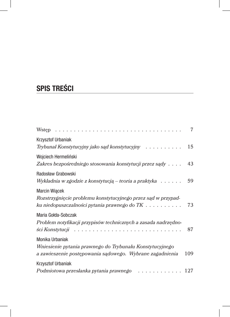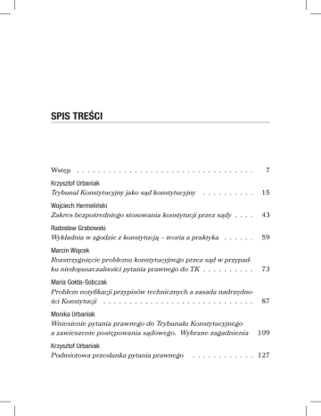 SPIS TREŚCI Wstęp ������������������������������������������������������������������������������������������������������ 7 Krzysztof Urbaniak Trybunał Konstytucyjny jako sąd konstytucyjny ������������������������������� 15 Wojciech Hermeliński Zakres bezpośredniego stosowania konstytucji przez sądy ������������ 43 Radosław Grabowski Wykładnia w zgodzie z konstytucją – teoria a praktyka ������������������ 59 Marcin Wiącek Rozstrzygnięcie problemu konstytucyjnego przez sąd w przypadku niedopuszczalności pytania prawnego do TK ������������������������������ 73 Maria Gołda-Sobczak Problem notyfikacji przypisów technicznych a zasada nadrzędności Konstytucji ��������������������������������������������������������������������������������������� 87 Monika Urbaniak Wniesienie pytania prawnego do Trybunału Konstytucyjnego a zawieszenie postępowania sądowego. Wybrane zagadnienia 109 Krzysztof Urbaniak Podmiotowa przesłanka pytania prawnego ����������������������������������� 127 6 Spis treści Małgorzata Masternak-Kubiak Funkcjonalna przesłanka pytania prawnego ����������������������������������� 147 Leszek Bosek Prawo Unii Europejskiej jako przedmiot pytania prawnego sądu do Trybunału Konstytucyjnego ������������������������������������������������������������ 177 Agata Hauser Postępowanie przed Trybunałem Konstytucyjnym w sprawach z pytań prawnych sądów w świetle ustawy z dnia 25 czerwca 2015 roku o Trybunale Konstytucyjnym ����������������������������������������� 207 Michał Podsiadło Umorzenie postępowania wywołanego pytaniem prawnym �������� 229 Monika Florczak-Wątor Skutki prawne orzeczenia Trybunału Konstytucyjnego dla sprawy, w której wystosowano pytanie prawne. Wybrane zagadnienia 245 Mikołaj Rychlik Pytanie prawne sądu do sądu konstytucyjnego w państwach europejskich. Analiza porównawcza ����������������������������������������������������� 273