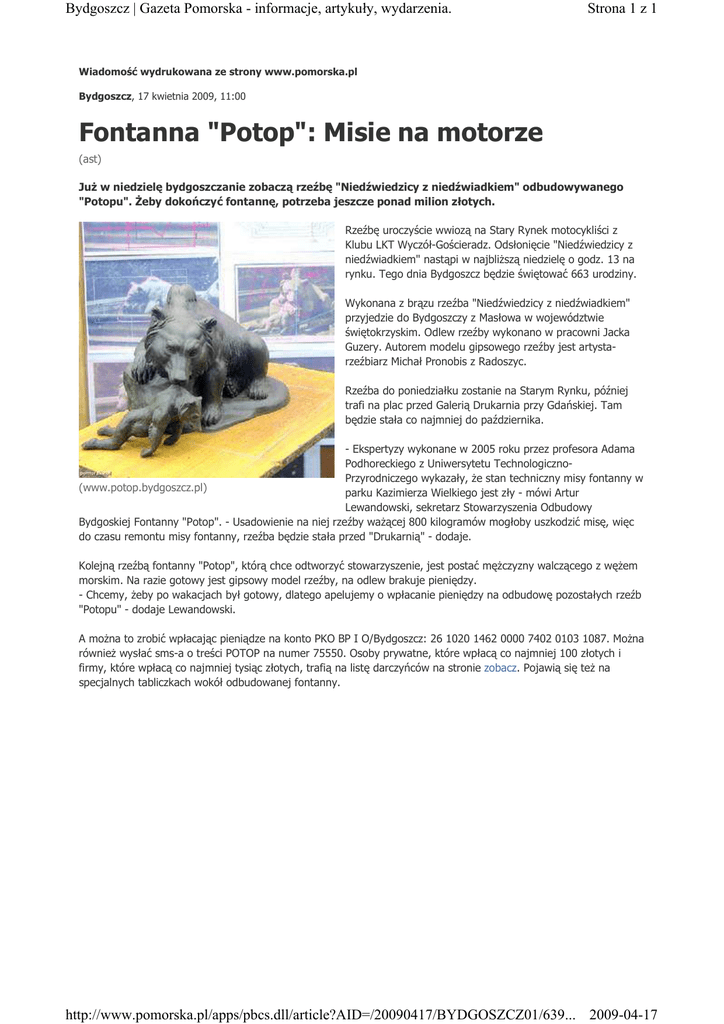 Bydgoszcz | Gazeta Pomorska - informacje, artykuły, wydarzenia. Strona 1 z 1 Wiadomość wydrukowana ze strony www.pomorska.pl Bydgoszcz, 17 kwietnia 2009, 11:00 Fontanna "Potop": Misie na motorze (ast) JuŜ w niedzielę bydgoszczanie zobaczą rzeźbę "Niedźwiedzicy z niedźwiadkiem" odbudowywanego "Potopu". śeby dokończyć fontannę, potrzeba jeszcze ponad milion złotych. Rzeźbę uroczyście wwiozą na Stary Rynek motocykliści z Klubu LKT Wyczół-Gościeradz. Odsłonięcie "Niedźwiedzicy z niedźwiadkiem" nastąpi w najbliŜszą niedzielę o godz. 13 na rynku. Tego dnia Bydgoszcz będzie świętować 663 urodziny. Wykonana z brązu rzeźba "Niedźwiedzicy z niedźwiadkiem" przyjedzie do Bydgoszczy z Masłowa w województwie świętokrzyskim. Odlew rzeźby wykonano w pracowni Jacka Guzery. Autorem modelu gipsowego rzeźby jest artystarzeźbiarz Michał Pronobis z Radoszyc. Rzeźba do poniedziałku zostanie na Starym Rynku, później trafi na plac przed Galerią Drukarnia przy Gdańskiej. Tam będzie stała co najmniej do października. - Ekspertyzy wykonane w 2005 roku przez profesora Adama Podhoreckiego z Uniwersytetu TechnologicznoPrzyrodniczego wykazały, Ŝe stan techniczny misy fontanny w (www.potop.bydgoszcz.pl) parku Kazimierza Wielkiego jest zły - mówi Artur Lewandowski, sekretarz Stowarzyszenia Odbudowy Bydgoskiej Fontanny "Potop". - Usadowienie na niej rzeźby waŜącej 800 kilogramów mogłoby uszkodzić misę, więc do czasu remontu misy fontanny, rzeźba będzie stała przed "Drukarnią" - dodaje. Kolejną rzeźbą fontanny "Potop", którą chce odtworzyć stowarzyszenie, jest postać męŜczyzny walczącego z węŜem morskim. Na razie gotowy jest gipsowy model rzeźby, na odlew brakuje pieniędzy. - Chcemy, Ŝeby po wakacjach był gotowy, dlatego apelujemy o wpłacanie pieniędzy na odbudowę pozostałych rzeźb "Potopu" - dodaje Lewandowski. A moŜna to zrobić wpłacając pieniądze na konto PKO BP I O/Bydgoszcz: 26 1020 1462 0000 7402 0103 1087. MoŜna równieŜ wysłać sms-a o treści POTOP na numer 75550. Osoby prywatne, które wpłacą co najmniej 100 złotych i firmy, które wpłacą co najmniej tysiąc złotych, trafią na listę darczyńców na stronie zobacz. Pojawią się teŜ na specjalnych tabliczkach wokół odbudowanej fontanny. http://www.pomorska.pl/apps/pbcs.dll/article?AID=/20090417/BYDGOSZCZ01/639... 2009-04-17
