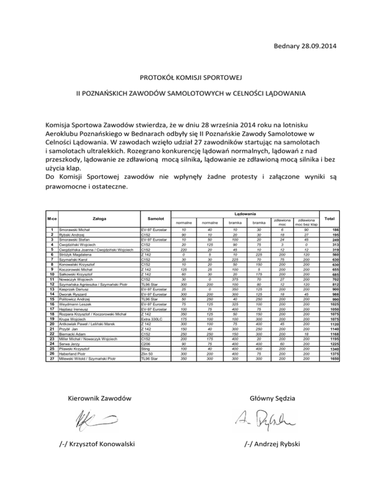 Bednary 28.09.2014 PROTOKÓŁ KOMISJI SPORTOWEJ II POZNAŃSKICH ZAWODÓW SAMOLOTOWYCH w CELNOŚCI LĄDOWANIA Komisja Sportowa Zawodów stwierdza, że w dniu 28 września 2014 roku na lotnisku Aeroklubu Poznańskiego w Bednarach odbyły się II Poznańskie Zawody Samolotowe w Celności Lądowania. W zawodach wzięło udział 27 zawodników startując na samolotach i samolotach ultralekkich. Rozegrano konkurencję lądowań normalnych, lądowań z nad przeszkody, lądowanie ze zdławioną mocą silnika, lądowanie ze zdławioną mocą silnika i bez użycia klap. Do Komisji Sportowej zawodów nie wpłynęły żadne protesty i załączone wyniki są prawomocne i ostateczne. Lądowania M-ce 1 2 3 4 5 6 7 8 9 10 11 12 13 14 15 16 17 18 19 20 21 22 23 24 25 26 27 Załoga Smorawski Michał Rybski Andrzej Smorawski Stefan Cwojdziński Wojciech Cwojdzińska Joanna / Cwojdziński Wojciech Stróżyk Magdalena Szymański Karol Konowalski Krzysztof Koczorowski Michał Sałkowski Krzysztof Nowaczyk Wojciech Szymańska Agnieszka / Szymański Piotr Kasprzak Dariusz Dworak Ryszard Politowicz Andrzej Weydmann Leszek Hajdasz Ireneusz Rozpara Krzysztof / Koczorowski Michał Krupa Wojciech Antkowiak Paweł / Leliński Marek Przybł Jan Biernacki Adam Miller Michał / Nowaczyk Wojciech Serwa Jerzy Pilawski Krzysztof Haberland Piotr Milewski Witold / Szymański Piotr Kierownik Zawodów /-/ Krzysztof Konowalski Samolot EV-97 Eurostar C152 EV-97 Eurostar C152 C152 Z 142 C152 C152 Z 142 Z 142 C152 TL96 Star EV-97 Eurostar EV-97 Eurostar TL96 Star EV-97 Eurostar EV-97 Eurostar Z 142 Extra 330LC Z 142 Z 142 C152 C152 C206 Sting Zlin 50 TL96 Star normalne normalne bramka bramka zdławiona moc zdławiona moc bez klap 10 90 10 20 220 0 30 10 125 60 30 300 25 300 50 75 100 350 175 300 150 250 200 90 100 300 350 40 10 50 125 20 5 30 20 25 30 0 200 0 200 250 125 75 125 100 100 40 250 175 75 40 200 300 10 20 100 90 45 10 225 50 100 20 375 100 350 300 40 325 400 50 100 75 300 150 400 400 400 400 300 30 30 20 75 10 225 70 150 5 175 70 80 125 125 250 100 75 150 300 400 250 300 20 400 400 75 300 6 18 24 3 12 200 75 200 200 200 27 12 200 18 200 200 200 200 200 45 200 200 200 60 200 200 200 90 27 45 0 12 120 200 200 200 200 200 120 200 45 200 200 200 200 200 200 200 18 200 200 200 200 200 Główny Sędzia /-/ Andrzej Rybski Total 186 195 249 313 319 560 630 630 655 685 702 812 900 988 990 1025 1050 1075 1075 1120 1140 1168 1195 1225 1340 1375 1650