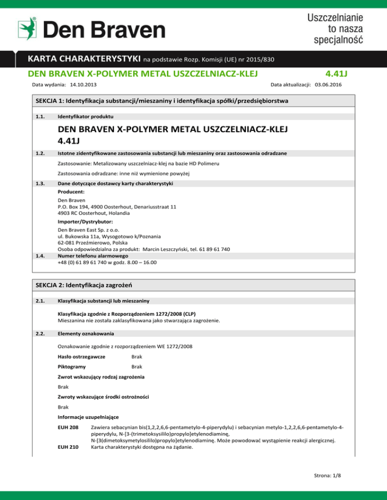 KARTA CHARAKTERYSTYKI na podstawie Rozp. Komisji (UE) nr 2015/830 DEN BRAVEN X-POLYMER METAL USZCZELNIACZ-KLEJ Data wydania: 14.10.2013 4.41J Data aktualizacji: 03.06.2016 SEKCJA 1: Identyfikacja substancji/mieszaniny i identyfikacja spółki/przedsiębiorstwa 1.1. Identyfikator produktu DEN BRAVEN X-POLYMER METAL USZCZELNIACZ-KLEJ 4.41J 1.2. Istotne zidentyfikowane zastosowania substancji lub mieszaniny oraz zastosowania odradzane Zastosowanie: Metalizowany uszczelniacz-klej na bazie HD Polimeru Zastosowania odradzane: inne niż wymienione powyżej 1.3. Dane dotyczące dostawcy karty charakterystyki Producent: Den Braven P.O. Box 194, 4900 Oosterhout, Denariusstraat 11 4903 RC Oosterhout, Holandia Importer/Dystrybutor: 1.4. Den Braven East Sp. z o.o. ul. Bukowska 11a, Wysogotowo k/Poznania 62-081 Przeźmierowo, Polska Osoba odpowiedzialna za produkt: Marcin Leszczyński, tel. 61 89 61 740 Numer telefonu alarmowego +48 (0) 61 89 61 740 w godz. 8.00 – 16.00 SEKCJA 2: Identyfikacja zagrożeń 2.1. Klasyfikacja substancji lub mieszaniny Klasyfikacja zgodnie z Rozporządzeniem 1272/2008 (CLP) Mieszanina nie została zaklasyfikowana jako stwarzająca zagrożenie. 2.2. Elementy oznakowania Oznakowanie zgodnie z rozporządzeniem WE 1272/2008 Hasło ostrzegawcze Brak Piktogramy Brak Zwrot wskazujący rodzaj zagrożenia Brak Zwroty wskazujące środki ostrożności Brak Informacje uzupełniające EUH 208 EUH 210 Zawiera sebacynian bis(1,2,2,6,6-pentametylo-4-piperydylu) i sebacynian metylo-1,2,2,6,6-pentametylo-4piperydylu, N-[3-(trimetoksysililo)propylo]etylenodiaminę, N-[3(dimetoksymetylosililo)propylo]etylenodiaminę. Może powodować wystąpienie reakcji alergicznej. Karta charakterystyki dostępna na żądanie. Strona: 1/8 KARTA CHARAKTERYSTYKI na podstawie Rozp. Komisji (UE) nr 2015/830 DEN BRAVEN X-POLYMER METAL USZCZELNIACZ-KLEJ Data wydania: 14.10.2013 2.3. 4.41J Data aktualizacji: 03.06.2016 Inne zagrożenia Produkt nie zawiera składników spełniających kryteria PBT lub vPvB. SEKCJA 3: Skład/informacja o składnikach 3.1. 3.2. Substancje – Nie dotyczy Mieszaniny Charakter chemiczny: mieszanina poniższych składników z nieklasyfikowanymi dodatkami. Nazwa substancji Identyfikator Klasyfikacja 1272/2008 % wag Ftalan diizononylu Indeks: --CAS: 28553-12-0 WE: 249-079-5 Nr rej. REACH: 012119430798-28-xxxx --- --- 10 -<30 Trimetoksywinylosilan Indeks --CAS 2768-02-7 WE 220-449-8 Nr rejestracyjny 012119513215-52-xxxx Flam. Liq. 3 Acute Tox. 4 H226 H332 1-5 Pełne znaczenie zwrotów zagrożenia H ujęto w sekcji 16 SEKCJA 4: Środki pierwszej pomocy 4.1. 4.2. 4.3. Opis środków pierwszej pomocy Drogi narażenia: Drogi oddechowe, drogi pokarmowe, kontakt ze skórą, kontakt z oczami. Następstwa wdychania: Wyprowadzić poszkodowana osobę na świeże powietrze. Ułożyć w wygodnej pozycji. Zapewnić ciepło i spokój. W razie potrzeby zapewnić pomoc lekarską. Następstwa połknięcia: Przepłukać usta wodą, dać do wypicia 2-3 szklanki wody, skontaktować się z lekarzem. Nie wywoływać wymiotów. Osobie nieprzytomnej nie podawać czegokolwiek do połknięcia. W razie potrzeby przetransportować do szpitala. Choremu zapewnić spokój, leżenie i ciepło. Kontakt z oczami: Usunąć szkła kontaktowe. Przemyć zanieczyszczone oczy większą ilością letniej wody przez 15 minut, przy wywiniętych powiekach. Co pewien czas nakładać górną na dolną powiekę. Oczy osłonić kompresem. W razie potrzeby zapewnić pomoc okulisty. Kontakt ze skórą: Zdjąć zanieczyszczone ubranie i buty. Oczyścić zanieczyszczoną skórę, przemyć dużą ilością wody a następnie wodą z łagodnym mydłem. W przypadku gdy podrażnienie skóry nie przemija, skonsultować się z lekarzem dermatologiem. Najważniejsze ostre i opóźnione objawy oraz skutki narażenia Brak danych Wskazania dotyczące wszelkiej natychmiastowej pomocy lekarskiej i szczególnego postępowania z poszkodowanym Brak danych Strona: 2/8 KARTA CHARAKTERYSTYKI na podstawie Rozp. Komisji (UE) nr 2015/830 DEN BRAVEN X-POLYMER METAL USZCZELNIACZ-KLEJ Data wydania: 14.10.2013 4.41J Data aktualizacji: 03.06.2016 SEKCJA 5: Postępowanie w przypadku pożaru 5.1. 5.2. 5.3. Środki gaśnicze Odpowiednie środki gaśnicze: piana gaśnicza odporna na alkohol, ditlenek węgla CO2, proszki gaśnicze, rozproszona woda. Niewłaściwe środki gaśnicze: Nie stosować zwartych strumieni wody na powierzchnię palącego się produktu. Szczególne zagrożenia związane z substancją lub mieszaniną Produkty spalania: Podczas spalania tworzą się toksyczne produkty rozkładu termicznego. Mieszaniny wybuchowe: Nie dotyczy Informacje dla straży pożarnej Stosować standardowe metody gaszenia pożarów chemicznych. Pojemniki narażone na działanie wysokiej temperatury chłodzić wodą i w miarę możliwości usunąć z zagrożonego obszaru. Opary strącać rozproszonymi strumieniami wody. Sprzęt ochronny strażaków: Pełne wyposażenie ochronne. Aparaty izolujące drogi oddechowe. SEKCJA 6: Postępowanie w przypadku niezamierzonego uwolnienia do środowiska 6.1. 6.2. 6.3. 6.4. Indywidualne środki ostrożności, wyposażenie ochronne i procedury w sytuacjach awaryjnych Indywidualne środki ostrożności: Patrz Sekcja 8 W przypadku wydostania się większej ilości mieszaniny, ostrzec jej użytkowników i nakazać opuszczenie zanieczyszczonego terenu osobom postronnym. Środki ostrożności w zakresie ochrony środowiska Nie dopuścić do zanieczyszczenia środowiska. Zabezpieczyć studzienki ściekowe. W przypadku poważnego zanieczyszczenia cieku wodnego, systemu kanalizacyjnego lub zanieczyszczenia gruntu, powiadomić odpowiednie władze administracyjne i kontrolne oraz organizacje ratownicze. Metody i materiały zapobiegające rozprzestrzenianiu się skażenia i służące do usuwania skażenia Usunąć wszelkie potencjalne źródła zapłonu. Nie palić Zabezpieczyć uszkodzone opakowania. Wietrzyć zagrożony obszar i unikać wdychania op