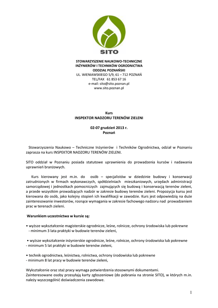 STOWARZYSZENIE NAUKOWO-TECHNICZNE INŻYNIERÓW I TECHNIKÓW OGRODNICTWA ODDZIAŁ POZNAŃSKI UL. WIENIAWSKIEGO 5/9, 61 – 712 POZNAŃ TEL/FAX 61 853 67 16 e-mail: [email protected] www.sito.poznan.pl Kurs INSPEKTOR NADZORU TERENÓW ZIELENI 02-07 grudzień 2013 r. Poznań Stowarzyszenia Naukowo – Techniczne Inżynierów i Techników Ogrodnictwa, odział w Poznaniu zaprasza na kurs INSPEKTOR NADZORU TERENÓW ZIELENI. SITO oddział w Poznaniu posiada statutowe uprawnienia do prowadzenia kursów i nadawania uprawnień branżowych. Kurs kierowany jest m.in. do osób – specjalistów w dziedzinie budowy i konserwacji zatrudnionych w firmach wykonawczych, spółdzielniach mieszkaniowych, urzędach administracji samorządowej i jednostkach pomocniczych zajmujących się budową i konserwacją terenów zieleni, a przede wszystkim prowadzących nadzór w zakresie budowy terenów zieleni. Propozycja kursu jest kierowana do osób, jako kolejny stopień ich kwalifikacji w zawodzie. Kurs jest odpowiedzią na duże zainteresowanie inwestorów, rosnące wymagania w zakresie fachowego nadzoru nad prowadzeniem prac w terenach zieleni. Warunkiem uczestnictwa w kursie są: • wyższe wykształcenie magisterskie ogrodnicze, leśne, rolnicze, ochrony środowiska lub pokrewne - minimum 3 lata praktyki w budowie terenów zieleni, • wyższe wykształcenie inżynierskie ogrodnicze, leśne, rolnicze, ochrony środowiska lub pokrewne - minimum 5 lat praktyki w budowie terenów zieleni, • technik ogrodnictwa, leśnictwa, rolnictwa, ochrony środowiska lub pokrewne - minimum 8 lat pracy w budowie terenów zieleni, Wykształcenie oraz staż pracy wymaga potwierdzenia stosownymi dokumentami. Zainteresowane osoby przesyłają karty zgłoszeniowe (do pobrania na stronie SITO), w których m.in. należy wyszczególnić doświadczenia zawodowe. 1 Organizatorzy kursu na podstawie przysłanych formularzy zgłoszeniowych dokonają ostatecznej weryfikacji uczestników. O zakwalifikowaniu się na kurs, zainteresowany zostanie poinformowany telefonicznie lub e-mailem. TERMIN SKŁADANIA ZGŁOSZEŃ: do 23 listopada 2013 r. KOSZT UCZESTNICTWA: 3.300 zł. brutto Organizator zapewnia materiały szkoleniowe, serwis kawowy i obiady. Koszt kursu nie obejmuje kosztów noclegów. Termin płatności do 15 listopada 2013 r. Istnieje możliwość wniesienia opłaty za kurs w ratach, z których pierwsza w wysokości 1.800,00 zł. brutto powinna być wniesiona do 15 listopada 2013 r. a ostatnia do dnia 30 listopada 2013 r. Nie wniesienie pełnej opłaty za kurs skutkuje wstrzymaniem wydania zaświadczenia o ukończonym kursie. PŁATNOŚĆ ZA KURS: Należność prosimy przelać na konto SITO: PKO BP I O/Poznań 35 1020 4027 0000 1202 0031 1654 z dopiskiem: udział w kursie „Inspektor Nadzoru Terenów Zieleni”. Stowarzyszenie Naukowo-Techniczne Inżynierów i Techników Ogrodnictwa Oddział w Poznaniu wystawi faktury za wpłaconą należność. MIEJSCE KURSU: FEDERACJA STOWARZYSZEŃ NAUKOWO-TECHNICZNYCH NOT RADA W POZNANIU ul. Wieniawskiego 5/9 61-712 Poznań TERMIN KURSU: 02-07 grudzień 2013 r. PLANOWANY CZAS TRWANIA ZAJĘĆ: 45 godzin. Podczas kursu przedstawione zostaną zagadnienia z tematyki obejmującej m.in. : 1. Obowiązujące przepisy prawne z zakresu: - ochrona przyrody - ochrona lasów - ochrona środowiska - prawo budowlane - ochrona roślin - ochrona zabytków - zamówienia publiczne - BHP i ich interpretacja. 2 2. Funkcja i zakres czynności Inspektora Nadzoru Terenów Zieleni. 3. Wybrane zagadnienia z zakresu gleboznawstwa, nawożenia, fitopatologii, entomologii niezbędne w pracy Inspektora Nadzoru. 4. Dokumentacja geodezyjna, projektowa, ekspertyzy, czytanie i interpretacja. 5. Podstawy kosztorysowania prac w terenach zieleni. 6. Zieleń zabytkowa, nadzór nad wykonaniem prac rewaloryzacyjnych i zabiegów pielęgnacyjnych oraz zasady współpracy ze służbami konserwatorskimi. 7. Nadzór nad pracami związanymi z pielęgnacją drzew z zastosowaniem technik linowych. 8. Dobór roślinności w zależności od charakteru terenu zieleni. 9. Inwentaryzacja dendrologiczna. 10. Zieleń przydrożna i autostradowa – zakres działań Inspektora Nadzoru. 11. Nadzór nad pracami w zieleni autostradowej, zabytkowej, miejskiej oraz innych typach terenów zieleni. Szczegółowy program przedstawiony zostanie osobom, które zostaną zakwalifikowane na kurs Inspektor Nadzoru Terenów Zieleni. Sesje wykładowe uzupełnione będą ćwiczeniami praktycznymi. Zajęcia poprowadzą zarówno pracownicy naukowi Uniwersytetu Przyrodniczego w Poznaniu jak i specjaliści oraz praktycy w poszczególnych dziedzinach związanych z budową terenów zieleni. Organizator: Stowarzyszenie Naukowo-Techniczne Inżynierów i Techników Ogrodnictwa Oddział Poznań Sekcja Terenów Zieleni. Dyrektor kursu: mgr inż. Andrzej Aumiller Kierownictwo kursu: mgr inż. Barbara Hoffmann mgr inż. Michał Grewling mgr inż. Ewa Raczkowska Koordynator prezentacji promocyjnych: mgr Agnieszka Mueller – Antczak Szczegółowe informacje w biurze SITO: telefon: 61 853 67 16 [email protected] 3