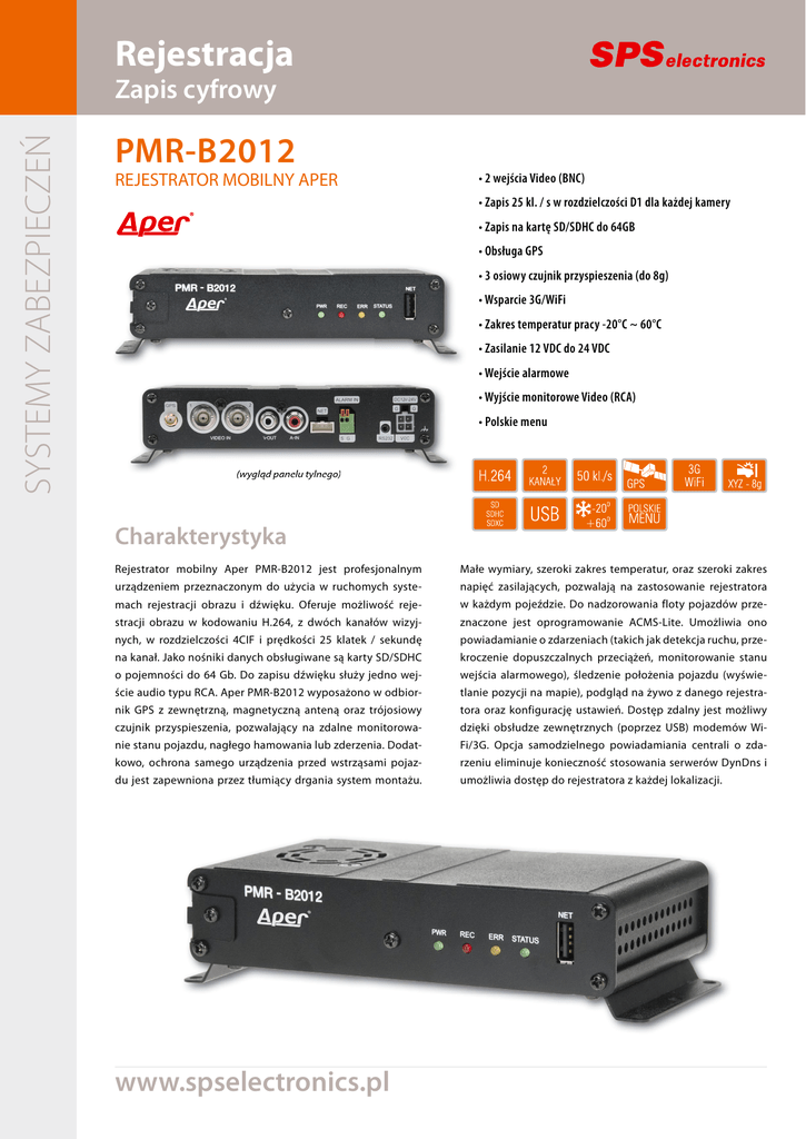 Rejestracja SYSTEMY ZABEZPIECZEŃ Zapis cyfrowy PMR-B2012 REJESTRATOR MOBILNY APER • 2 wejścia Video (BNC) • Zapis 25 kl. / s w rozdzielczości D1 dla każdej kamery • Zapis na kartę SD/SDHC do 64GB • Obsługa GPS • 3 osiowy czujnik przyspieszenia (do 8g) • Wsparcie 3G/WiFi • Zakres temperatur pracy -20°C ~ 60°C • Zasilanie 12 VDC do 24 VDC • Wejście alarmowe • Wyjście monitorowe Video (RCA) • Polskie menu (wygląd panelu tylnego) Charakterystyka Rejestrator mobilny Aper PMR-B2012 jest profesjonalnym Małe wymiary, szeroki zakres temperatur, oraz szeroki zakres urządzeniem przeznaczonym do użycia w ruchomych syste- napięć zasilających, pozwalają na zastosowanie rejestratora mach rejestracji obrazu i dźwięku. Oferuje możliwość reje- w każdym pojeździe. Do nadzorowania floty pojazdów prze- stracji obrazu w kodowaniu H.264, z dwóch kanałów wizyj- znaczone jest oprogramowanie ACMS-Lite. Umożliwia ono nych, w rozdzielczości 4CIF i prędkości 25 klatek / sekundę powiadamianie o zdarzeniach (takich jak detekcja ruchu, prze- na kanał. Jako nośniki danych obsługiwane są karty SD/SDHC kroczenie dopuszczalnych przeciążeń, monitorowanie stanu o pojemności do 64 Gb. Do zapisu dźwięku służy jedno wej- wejścia alarmowego), śledzenie położenia pojazdu (wyświe- ście audio typu RCA. Aper PMR-B2012 wyposażono w odbior- tlanie pozycji na mapie), podgląd na żywo z danego rejestra- nik GPS z zewnętrzną, magnetyczną anteną oraz trójosiowy tora oraz konfigurację ustawień. Dostęp zdalny jest możliwy czujnik przyspieszenia, pozwalający na zdalne monitorowa- dzięki obsłudze zewnętrznych (poprzez USB) modemów Wi- nie stanu pojazdu, nagłego hamowania lub zderzenia. Dodat- Fi/3G. Opcja samodzielnego powiadamiania centrali o zda- kowo, ochrona samego urządzenia przed wstrząsami pojaz- rzeniu eliminuje konieczność stosowania serwerów DynDns i du jest zapewniona przez tłumiący drgania system montażu. umożliwia dostęp do rejestratora z każdej lokalizacji. www.spselectronics.pl Dane techniczne MODEL PMR-B2012 Wejścia wizyjne 2 x Video (BNC) 50 kl./s (720 x 576 px) 50 kl./s (720 x 288 px) 50 kl./s (360 x 288 px) Maksymalne prędkości rejestracji i rozdzielczości obrazu zapisywanego / odtwarzanego Metoda kompresji H.264 Wyjścia wizyjne główne Video (RCA) Rozdzielczość obrazu wyśw. poj. w czasie rzeczyw. 720 x 576 px Wejścia foniczne 1 x Audio (RCA) 10 kΩ/1 Vpp Wejścia alarmowe 1 x wejście beznapięciowe, NC/NO (zaciskowe) System operacyjny Embedded Linux Obsługa poprzez sieć IP ACMS-Lite Interfejsy USB 2.0 (wsparcie 3G/WiFi), GPS (antena) Obsługiwane sieci LAN/WAN/Internet/3G/WiFi Protokoły sieciowe TCP/IP, DHCP, DDNS, SMTP Rejestracja Tryby rejestracji Karty SD/SDHC/SDXC Ciągły, harmonogram; Detekcja ruchu (z zapisem przed i po detekcji), alarmowy (z zapisem przedi poalarmowym). Ochrona rejestracji alarmowej przed nadpisaniem Wyszukiwanie nagrań Kalendarz, zdarzenia Archiwizacja Inne USB Wbudowany GPS, antena GPS przedłużona kablem o długości 3 m. Trójosiowy czujnik przyspieszeń, maksymalne przyspieszenie 8g. Sygnalizacja alarmu, powiadamianie centrali pojazdów o zdarzeniu, prędkości i kierunku. Zasilanie 12- 24 VDC Pobór mocy 4,5 W Zakres temperatury -20°C ~ +60°C Wymiary (szer. x wys. x gł.) 152 x 33 x 80 mm Montaż Metalowy uchwyt przeciwwstrząsowy Waga 400 g Centrala - ul. Wał Miedzeszyński 630, 03-994 Warszawa; tel. 022 518 31 50, fax 022 518 31 70, e-mail: [email protected] BH Gdańsk - ul. Drożyny 6, 80-302 Gdańsk; tel. 058 624 83 04, fax 058 668 59 20, e-mail: [email protected] BH Katowice - ul. Kościuszki 227, 40-600 Katowice; tel. 032 255 64 27, fax 032 255 64 52, e-mail: [email protected] BH Poznań - ul. Polska 60, 60-595 Poznań; tel. 061 852 19 02, fax 061 825 09 03, e-mail: [email protected] BH Toruń - ul. Grudziądzka 176, 87-100 Toruń; tel. 056 653 99 43, fax 056 653 90 81, e-mail: [email protected] BH Wrocław - pl. Gen. Wróblewskiego 3a, 50-413 Wrocław; tel. 071 348 44 64, fax 071 348 36 35, e-mail: [email protected] Dystrybutor (gniazdo karty SD)