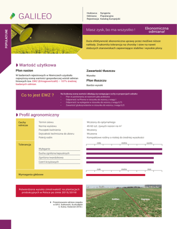 Galileo Hodowca:Syngenta Odmiana: Populacyjna Rejestracja: Katalog Europejski Ekonomiczna odmiana! POPULACYJNE Masz zysk, bo ma wszystko ! Duża efektywność ekonomiczna uprawy przez możliwe niższe nakłady. Znakomita tolerancja na choroby i siew na nawet słabszych stanowiskach zapewniające stabilne i wysokie plony. Wartość użytkowa Plon nasion Zawartość tłuszczu W badaniach rejestrowych w Niemczech uzyskała najwyższą ocenę wartości gospodarczej wśród odmian liniowych tzw. EWZ (Ertragswertzahl) – 107% średniej badanych odmian. Wysoka Co to jest EWZ ? Plon tłuszczu Bardzo wysoki Na liczbową ocenę wartości składają się następujące cechy w proporcjach udziału: • Plon w porównaniu ze wzorcem jako podstawa • Odporność na Phoma w stosunku do wzorca, z wagą 1 • Odporność na wyleganie w stosunku do wzorca, z wagą 0,75 • Zawartość glukozynolanów w stosunku do wzorca, z wagą 0,25 Profil agronomiczny Cechy rolnicze Termin siewu Wczesny do optymalnego Norma wysiewu 45-60 szt. żywych nasion na m2 Początek kwitnienia Wczesny Dojrzałość techniczna do zbioru Wczesna Pokrój roślin Kompaktowe rośliny o niskiej do średniej wysokości Tolerancja niska średnia wysoka małe średnie duże Wyleganie Sucha zgnilizna kapustnych Zgnilizna twardzikowa Czerń krzyżowych Wymagania glebowe Potwierdzona wysoka zimotrwałość na plantacjach produkcyjnych w Polsce po zimie 2015/2016! p o l e t k a d o Galileo Przezimowanie odmian rzepaku w GR E. Dutkowski, Suchodębie k. Kutna. Kwiecień 2016 r. ś w i a d c z a Vapiano l n e