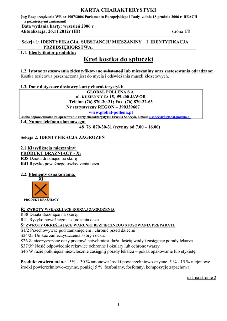 KARTA CHARAKTERYSTYKI (wg Rozporządzenia WE nr 1907/2006 Parlamentu Europejskiego i Rady z dnia 18 grudnia 2006 r REACH z późniejszymi zmianami) Data wydania karty: wrzesień 2006 r Aktualizacja: 26.11.2012r (III) strona 1/8 Sekcja 1: IDENTYFIKACJA SUBSTANCJI/ MIESZANINY I IDENTYFIKACJA PRZEDSIĘBIORSTWA, 1.1. Identyfikator produktu: Kret kostka do spłuczki 1.2. Istotne zastosowania zidentyfikowane substancji lub mieszaniny oraz zastosowania odradzane: Kostka toaletowa przeznaczona jest do mycia i odświeżania muszli klozetowych. 1.3. Dane dotyczące dostawcy karty charakterystyki: GLOBAL POLLENA S.A. ul. KUZIENNICZA 15, 59-400 JAWOR Telefon (76) 870-30-31; Fax (76) 870-32-63 Nr statystyczny REGON – 390339667 www.global-pollena.pl Osoba odpowiedzialna za opracowanie karty charakterystyki: Urszula Sobczyk, e-mail: [email protected] 1.4. Numer telefonu alarmowego: +48 76 870-30-31 (czynny od 7.00 – 16.00) Sekcja 2: IDENTYFIKACJA ZAGROŻEŃ 2.1.Klasyfikacja mieszaniny: PRODUKT DRAŻNIĄCY - Xi R38 Działa drażniąco na skórę R41 Ryzyko poważnego uszkodzenia oczu 2.2. Elementy oznakowania: PRODUKT DRAŻNIĄCY R: ZWROTY WSKAZUJĄCE RODZAJ ZAGROŻENIA R38 Działa drażniąco na skórę. R41 Ryzyko poważnego uszkodzenia oczu S: ZWROTY OKREŚLAJĄCE WARUNKI BEZPIECZNEGO STOSOWANIA PREPARATU S1/2 Przechowywać pod zamknięciem i chronić przed dziećmi. S24/25 Unikać zanieczyszczenia skóry i oczu. S26 Zanieczyszczone oczy przemyć natychmiast duża ilością wody i zasięgnąć porady lekarza. S37/39 Nosić odpowiednie rękawice ochronne i okulary lub ochronę twarzy. S46 W razie połknięcia niezwłocznie zasięgnij porady lekarza – pokaż opakowanie lub etykietę. Produkt zawiera m.in.: 15% - 30 % anionowe środki powierzchniowo-czynne, 5 % - 15 % niejonowe środki powierzchniowo-czynne, poniżej 5 % fosfoniany, fosforany; kompozycję zapachową. c.d. na stronie 2 1 KARTA CHARAKTERYSTYKI Nazwa handlowa produktu: Kret kostka do spłuczki strona 2/8 2.3. Inne zagrożenia ♦ Zagrożenie dla środowiska: przy właściwym użyciu zgodnym z przeznaczeniem: brak. Duże ilości mogą być niebezpieczne dla organizmów wodnych Sekcja 3: SKŁAD / INFORMACJA O SKŁADNIKACH 3.1. Substancje – nie dotyczy 3.2. Mieszaniny: Nr WE Nazwa substancji niebezpiecznej Nr CAS Nr rejestracji właściwej Nr indeksowy A K 232-268-1 8000-41-7 497-19-8 207-838-8 Stężenie [%] Xn; R22, 38, R41 20 < C < 30 Kwas benzenosulfonowy, 01C1 C10-C13, pochodne 2119489428 270-115-0 68411-30-3 alkilowe, sól sodowa -22-xxxx 292-481-0 90622-77-8 Klasyfikacja niebezpieczeństwa N- (hydroksyetylo) amidy kokosowych kwasów tłuszczowych Alkohole Terpeny (Pinus) Węglan sodu -------- Eye Dam.1 H318 Skin Irrit.2 H315 Acute Tox. 4 H302 Xi; R38, R41 012119489413 -33-xxxx ------ ------- ----- Skin. Irrit. 2 H315 Eye Dam.1 H318 C < 15 Xi; R38 Skin Irrit.2 H315 01Xi; R36 2119485498 011-005-00-2 Eye Irrit. 2 H319 -19-xxxx C<5 C<2 Treść zwrotów R i H – patrz p. 16 Sekcja 4: ŚRODKI PIERWSZEJ POMOCY 4.1. Opis środków pierwszej pomocy Kontakt z oczami: przemyć dużą ilością czystej, bieżącej wody, przez co najmniej 15 minut, przy odwiniętych powiekach. Unikać silnego strumienia wody, który może stworzyć ryzyko uszkodzenia rogówki. Nie używać żadnych maści oraz płynów do przemywania oczu. Natychmiast skontaktować się z lekarzem okulistą. UWAGA ! Osoby narażone na skażenie oczu powinny być poinformowane o konieczności i sposobie natychmiastowego płukania oczu. Kontakt ze skórą: spłukać skórę dużą ilością wody. W przypadku wystąpienia niepokojących objawów skontaktować się z lekarzem.. Połknięcie (przewód pokarmowy) : w razie spożycia, jeżeli to możliwe, usunąć resztki produktu z jamy ustnej i dokładnie przepłukać dużą ilością wody. Nie podawać żadnych środków zobojętniajacych. Nie wywoływać wymiotów. Natychmiast skontaktować się z lekarzem Wdychanie (drogi oddechowe): w razie zatrucia inhalacyjnego, poszkodowanego wynieść z miejsca narażenia na świeże powietrze, zapewnić spokój. Skontaktować się z lekarzem. 4.2. Najważniejsze ostre i opóźnione objawy oraz skutki narażenia Kontakt ze skórą: działa drażniąco na skórę (czerwone plamy, pieczenie) Kontakt z oczami: ryzyko poważnego uszkodzenia oczu ( pieczenie, łzawienie, obrzęk spojówek) Wdychanie: podrażnienie górnych dróg oddechowych (kaszel, pieczenie gardła) Połknięcie – działa szkodliwie po połknięciu. c.d. na stronie 3 2 KARTA CHARAKTERYSTYKI Nazwa handlowa produktu: Kret kostka do spłuczki strona 3/8 ● Skutki zdrowotne narażenia ostrego długoterminowego – długotrwały kontakt ze skórą może powodować wystąpienie reakcji alergicznej oraz stany zapalne skóry. 4.3. Wskazania dotyczące wszelkiej natychmiastowej pomocy lekarskiej i szczególnego postępowania z poszkodowanym. ♦ zalecana obserwacja medyczna przez 48 g po narażeniu ♦ na stanowiskach pracy zamontowane są urządzenia umożliwiające natychmiastową pomoc: - myjka do przemywania oczu - prysznic Sekcja 5: POSTĘPOWANIE W PRZYPADKU POŻARU 5.1. Środki gaśnicze ♦ pożary w obecności produktu gasić środkami gaśniczymi odpowiednimi dla palących się materiałów ( najlepiej woda, proszek gaśniczy, CO2) 5.2. Szczegółowe zagrożenia związane z substancją lub mieszaniną ♦ produkt niepalny, podczas pożaru mogą powstawać niebezpieczne produkty spalania: dwutlenek węgla, tlenek węgla, tlenki siarki 5.3. Informacje dla straży pożarnej ♦ nie należy przebywać w strefie zagrożenia bez specjalnej gazoszczelnej odzieży ochronnej i aparatu izolującego drogi oddechowe. Sekcja 6: POSTĘPOWANIE W PRZYPADKU NIEZAMIERZONEGO UWOLNIENIA DO ŚRODOWISKA 6.1. Indywidualne środki ostrożności, wyposażenie ochronne i procedury w sytuacjach awaryjnych ♦ unikać bezpośredniego kontaktu z oczami i skórą. Stosować okulary szczelnie przylegające do twarzy, rękawice, ubranie i obuwie ochro