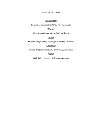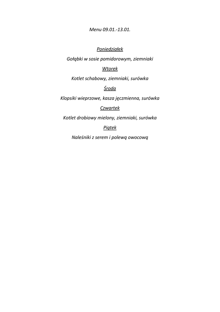 Menu 09.01.-13.01. Poniedziałek Gołąbki w sosie pomidorowym, ziemniaki Wtorek Kotlet schabowy, ziemniaki, surówka Środa Klopsiki wieprzowe, kasza jęczmienna, surówka Czwartek Kotlet drobiowy mielony, ziemniaki, surówka Piątek Naleśniki z serem i polewą owocową