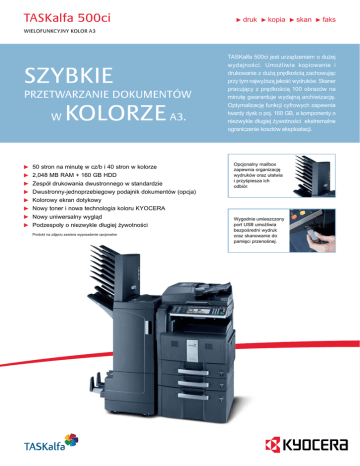 TASKalfa 500ci druk kopia skan faks wieLofunKcyjny KoLor A3 SzybKie przeTwArzAnie doKumenTów w KoLorze A3. 50 stron na minutę w cz/b i 40 stron w kolorze 2,048 MB RAM + 160 GB HDD Zespół drukowania dwustronnego w standardzie Dwustronny-jednoprzebiegowy podajnik dokumentów (opcja) Kolorowy ekran dotykowy Nowy toner i nowa technologia koloru KYOCERA Nowy uniwersalny wygląd Podzespoły o niezwykle długiej żywotności Produkt na zdjęciu zawiera wyposażenie opcjonalne TASKalfa 500ci jest urządzeniem o dużej wydajności. Umożliwia kopiowanie i drukowanie z dużą prędkością zachowując przy tym najwyższą jakość wydruków. Skaner pracujący z prędkością 100 obrazów na minutę gwarantuje wydajną archiwizację. Optymalizację funkcji cyfrowych zapewnia twardy dysk o poj. 160 GB, a komponenty o niezwykle długiej żywotności ekstremalne ograniczenie kosztów eksploatacji. Opcjonalny mailbox zapewnia organizację wydruków oraz ułatwia i przyśpiesza ich odbiór. Wygodnie umieszczony port USB umożliwia bezpośredni wydruk oraz skanowanie do pamięci przenośnej. TASKalfa 500ci wieLofunKcyjny KoLor A3 TASKalfa 500ci jest połączeniem wydajności i niezawodności z ekstremalną żywotnością podzespołów co gwarantuje efektywne i niezawodne działanie. Aby sprostać wysokim wymaganiom współczesnego biura, TASKalfa 500ci oferuje elastyczość i efektywą wydajność, zapewniając przy tym minimalny wpływ na środowisko naturalne. INFORMACJE OGÓLNE Technologia KYOCERA Laser Kolor Prędkość robocza 40/19 stron na minutę A4/A3 w kolorze 50/25 stron na minutę A4/A3 cz/b Rozdzielczość 600 x 600 dpi Technologia Multi-bit do drukowania z jakością 9,600 dpi level x 600 dpi Czcionki / kody kreskowe 93 czcionki konturowe (PCL6), 8 czcionek (Windows Vista), 136 czcionek PostScript KPDL 3, 45 typów 1-wymiarowych plus 2-wymiarowy kod kreskowy (PDF-417) Czcionki pobieralne: KYOCERA, PCL + format TrueType, format Type 1 + 3 EKSPLOATACJA Funkcje Szybki wydruk, wydruk próbny, wydruk prywatny, zachowanie pracy i zarządzanie pracami OPCJE KOPIARKA Czas nagrzewania Ok. 45 sekund lub mniej od włączenia zasilania Maks. format oryginału A3 Czas pierwszej strony Ok. 4.9 sek. lub mniej w cz/b Ok. 6.9 sek. lub mniej w kolorze Pamięć 2,048 MB RAM + 160 GB HDD Wymiary (szer x głęb x wys) 605 mm x 680 mm x 745 mm Waga ok. 106 kg Zasilanie AC 220 V – 240 V, 50/60 Hz Zużycie energii W czasie pracy: 1,150 W Czuwanie: 210 W Tryb energooszczędny (ECOpower): 19 W Hałas (ISO 7779 / ISO 9296) W czasie pracy: 72 dB(A) Czuwanie: 56.9 dB (A) Standardy GS, TÜV, CE To urządzenie jest produkowane zgodnie z normą jakości ISO 9001 oraz normą ochrony środowiska ISO 14001. Zgodność z dyrektywą RoHs. OBSŁUGA PAPIERU Kopiowanie ciągłe 1–999 Zakres zoom 25–400 % co 1 % Zoom skokowy 5 zmniejszeń / 5 powiększeń Funkcje cyfrowe Skanuj raz drukuj wielokrotnie, sorter elektroniczny, funkcja 2w1 i 4w1, funkcja powtarzania obrazu, numerowanie stron, tryb okładek, kopiowanie broszur, skrzynka dokumentów 80 GB, tryb pilnej kopii, elektroniczne formularze Tryby ekspozycji Automatyczny lub ręczny: 7 lub 13 stopni Typ oryginału Tekst + foto, tekst, foto, mapa SKANER Funkcje Skanowanie do: PC, e-mail, FTP (FTP przez SSL), sieciowy TWA N, SMB, do skrzynki dokumentów, do USB Prędkość skanowania 100 obrazów na minutę (A4, kolor, cz/b), (300 dpi z DP-760) Rozdzielczość 600 dpi, 400 dpi, 300 dpi, 200 dpi, 200 x 100 dpi, 200 x 400 dpi, (256 skala szarości) Wszystkie podane pojemności dotyczą papieru o grubości maks. 0.11 mm. Zaleca się stosowanie papieru polecanego przez KYOCERA w normalnych warunkach otoczenia. Maks. obszar skanowania A3 Pojemność wejściowa Podajnik ręczny - 100 ark. A3–A6R, 60–220 g/m2; Kaseta uniwersalna - 2 x 500 ark. A3–A5R, 60–163 g/m2; Maksymalna pojemność łącznie z opcjami: 4,100 ark. A4 Interfejs 10/100 Base-TX Zespół dupleksu W standardzie, A3–A5, 60–163 g/m2 Pojemność wyjściowa 250 ark. drukiem do dołu DRUKARKA Procesor PowerPC 750 GL / 600 MHz Pamięć 2,048 MB RAM + 160 GB HDD Interfejsy standardowe USB 2.0 (Hi-Speed), Fast Ethernet 10-Base-T/100Base-TX, gniazdo karty CompactFlash® Język kontrolera Prescribe Emulacje PCL6, KPDL 3 (zgodna z PostScript 3), wydruk bezpośredni XPS, wydruk bezpośredni PDF Protokół sieciowy TCP/IP Typ pliku PDF (kompresowany/szyfrowany), JPEG, T FF, XPS FAX (OPCJA) Kompatybilność ITU-T Super G3 Prędkość modemu Maks. 33 6 kbps Prędkość transmisji Maks. 2 sekundy (JBIG) Gęstość skanowania Normal: 8 pkt/mm x 3.85 linii/mm Fine: 8 pkt/mm x 7.7 linii/mm Superfine: 8 pkt/mm x 15.4 linii/mm Ultrafine: 16 pkt/mm x 15.4 linii/mm (z dodatkową pamięcią), półtony Maks. format oryginału A3 Metody kompresji JBIG, MMR, MR, MH Pamięć Standard 12 MB, maks. 120 MB Funkcje Faks sieciowy, transmisja rotacyjna, odbiór rotacyjny, funkcja dupleks, odbiór do pamięci, skrzynka faksów, zdalna diagnostyka, podwójna linia Tonery TK-855C, TK-855M, TK-855Y Cyan, Magenta, Yellow na 18,000 stron A4 przy pokryciu 5 % Fax System (Q) Internet Fax Kit (A) Obsługa papieru DP-750 podajnik dokumentów (dwustronny) Maks. 100 ark. A5R-A3, folio, 45–160 g/m2, DP-760 podajnik dokumentów (dwustronny, jednoprzebiegowy) Maks. 100 ark. A5R–A3, folio, 45–160 g/m2; PF-720 podajnik papieru 2 x 500 ark. A5R–A3, folio, 60–163 g/m2; PF-760 podajnik papieru 3,000 ark. A4, B5, letter, 60–163 g/m2; DT-710 półka na dokumenty DF-760* finiszer + adapter AK-720 Taca główna: maks. 3,000 ark. A3-B5; 60–220 g/m2; Taca pomocnicza: maks. 200 ark. A3-A6R; 60–163 g/m2; Taca pomocnicza (górna): maks. 50 ark., 60–163 g/m2; A4 Zszywacz do 50 ark. A4 lub 30 ark. A3 w 3 miejscach DF-780** finiszer Maks. 1,000 ark. A3–B5E, 64–105 g/m2, zszywacz do 50 ark. A4 lub 20 ark. A3 w 3 miejscach PH-5C/PH-5D dziurkacz do DF-760 2/4-otwory/typ szwedzki, 60–200 g/m2, A5R–A3 MT-720 mailbox do DF-760 7 półek po maks