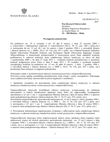 Bielsko – Biała, 21 lipca 2011 r. WOJEWODA ŚLĄSKI NZ/III/8012/67/11 „RZ” Pan Ryszard Odrzywołek Dyrektor Bielskie Pogotowie Ratunkowe ul. Emilii Plater 14 43 – 300 Bielsko – Biała Wystąpienie pokontrolne Na podstawie art. 19 w związku z art. 22 pkt 6 ustawy z dnia 23 stycznia 2009 r. o wojewodzie i administracji rządowej w województwie (Dz.U. Nr 31, poz. 206 z późn.zm.) w nawiązaniu do art. 15 ust. 6b i ust. 6c ustawy z dnia 5 grudnia 1996 r. o zawodach lekarza i lekarza dentysty (t.j. z 2008r., Dz.U. Nr 136, poz. 857 z późn. zm.) Oddział Kontroli Zakładów Opieki Zdrowotnej Wydziału Nadzoru nad Systemem Opieki Zdrowotnej Śląskiego Urzędu Wojewódzkiego w Katowicach przeprowadził w kierowanym przez Pana zakładzie kontrolę problemową w zakresie realizacji stażu cząstkowego lekarzy medycyny za okres od dnia 1 października 2009 r. do dnia 27 maja 2011 r. Ustalenia kontroli przedstawiono w protokole kontroli podpisanym przez Pana w dniu 8 maja 2011 r. W związku z wynikami kontroli zarządzający kontrolę na podstawie art. 15 ust. 6c ppkt 4) ustawy z dnia 5 grudnia 1996 r. o zawodach lekarza i lekarza dentysty (t.j. z 2008 r., Dz.U. Nr 136, poz. 857 z późn. zm.) przekazuje Panu niniejsze wystąpienie pokontrolne. Wykonanie zadań w kontrolowanym zakresie oceniam pozytywnie z nieprawidłowościami. Powyższą ocenę ogólną uzasadniają przedstawione niżej uwagi i oceny szczegółowe. Dokonując ocen cząstkowych miały zastosowanie kryteria legalności i rzetelności. 1. Spełnianie warunków do prowadzenia stażu cząstkowego lekarzy medycyny w zakresie medycyny ratunkowej należy ocenić pozytywnie z nieprawidłowością. Nieprawidłowość dotyczyła kwalifikacji lekarza medycyny wyznaczonego do pełnienia obowiązków w trakcie nieobecności opiekuna stażu, które nie odpowiadały wymaganiom określonym w §7 ust.1 i ust. 3 rozporządzenia Ministra Zdrowia z dnia 24 marca 2004 r. w sprawie stażu podyplomowego lekarza i lekarza dentysty (Dz. U. Nr 57, poz. 553 z późn. zm.). Stwierdzona nieprawidłowość spowodowała naruszenie art. 15 ust.5 ustawy z dnia 5 grudnia 1996 r. o zawodach lekarza i lekarza dentysty (t.j. z 2008 r., Dz. U. Nr 136, poz. 857 z późn. zm.) w powiązaniu z §7 ust.1 i ust. 3 rozporządzenia Ministra Zdrowia z dnia 24 marca 2004 r. w sprawie stażu podyplomowego lekarza i lekarza dentysty (Dz. U. Nr 57, poz. 553 z późn. zm.). 2. Prowadzenie dokumentacji organizacyjnej związanej z odbywaniem stażu cząstkowego lekarzy medycyny w zakresie medycyny ratunkowej należy ocenić pozytywnie z nieprawidłowościami. Nieprawidłowość dotycząca ilości nadzorowanych lekarzy przez opiekuna stażu (opiekun stażu nadzorował więcej niż dwóch stażystów) spowodowała naruszenie art. 15 ust.5 ustawy z dnia 5 grudnia 1996 r. o zawodach lekarza i lekarza dentysty (t.j. z 2008 r., Dz. U. Nr 136, poz. 857 z późn. zm.) w powiązaniu z § 7 ust. 4 rozporządzenia Ministra Zdrowia z dnia 24 marca 2004 r. w sprawie stażu podyplomowego lekarza i lekarza dentysty (Dz. U. Nr 57, poz. 553 z późn. zm.). 1 Zakład nie posiadał harmonogramów odbytych dyżurów medycznych lub harmonogramy obejmowały jedynie część dyżurów, jak w przypadku stażystów: Katarzyny Nycz, Joanny Kotłowskiej, Małgorzaty Czanieckiej, Anety Krawiec, Marty Jaworskiej, Szymona Białki, Moniki Birk, Wojciecha Kabiesz, co zostało uznane za nieprawidłowość i spowodowało naruszenie art. 15 ust.5 ustawy z dnia 5 grudnia 1996 r. o zawodach lekarza i lekarza dentysty (t.j. z 2008 r., Dz. U. Nr 136, poz. 857 z późn. zm.) w powiązaniu z § 8 ust. 3 pkt 4 rozporządzenia Ministra Zdrowia z dnia 24 marca 2004 r. w sprawie stażu podyplomowego lekarza i lekarza dentysty (Dz. U. Nr 57, poz. 553 z późn. zm.). Osobą odpowiedzialną za stwierdzone w trakcie kontroli nieprawidłowości jest dyrektor zakładu. Mając na uwadze powyższe oceny i uwagi wnoszę o: 1. wyznaczenie lekarza medycyny, do wykonywania obowiązków opiekuna stażu w trakcie jego nieobecności, którego kwalifikacje będą zgodne z wymaganiami określonymi art. 15 ust.5 ustawy z dnia 5 grudnia 1996 r. o zawodach lekarza i lekarza dentysty (t.j. z 2008 r., Dz. U. Nr 136, poz. 857 z późn. zm.) w powiązaniu z §7 ust.1 rozporządzenia Ministra Zdrowia z dnia 24 marca 2004 r. w sprawie stażu podyplomowego lekarza i lekarza dentysty (Dz. U. Nr 57, poz. 553 z późn. zm.). Jednocześnie informuję, że zgodnie z opinią prawną z dnia 27 czerwca 2011 r. przesłaną przez Pana prof.dr hab.n.med.Krystyna Sosadę Konsultanta Wojewódzkiego w dziedzinie medycyny ratunkowej, prawodawca traktuje staż z zakresu intensywnej terapii i medycyny ratunkowej jako całość i nie ma przeszkód prawnych, aby staż ten był odbywany pod nadzorem lekarza posiadającego specjalizację I i II stopnia w zakresie anestezjologii i intensywnej terapii, 2. przestrzeganie zapisów art. 15 ust.5 ustawy z dnia 5 grudnia 1996 r. o zawodach lekarza i lekarza dentysty (t.j. z 2008 r., Dz. U. Nr 136, poz. 857 z późn. zm.) w powiązaniu z § 7 ust. 4 rozporządzenia Ministra Zdrowia z dnia 24 marca 2004 r. w sprawie stażu podyplomowego lekarza i lekarza dentysty (Dz. U. Nr 57, poz. 553 z późn. zm.) zgodnie z którymi opiekun może nadzorować odbywanie stażu przez jednego stażystę, a w sytuacji szczególnie uzasadnionej, za zgodą koordynatora, przez dwóch stażystów, 3. przestrzeganie zapisów art. 15 ust.5 ustawy z dnia 5 grudnia 1996 r. o zawodach lekarza i lekarza dentysty (t.j. z 2008 r., Dz. U. Nr 136, poz. 857 z późn. zm.) w powiązaniu z § 8 ust. 3 pkt 4 rozporządzenia Ministra Zdrowia z dnia 24 marca 2004 r. w sprawie stażu podyplomowego lekarza i lekarza dentysty (Dz. U. Nr 57, poz. 553 z późn. zm.) zgodnie z którymi opiekun ustala harmonogram dyżurów stażysty. Oczekuję przedstawienia przez Pana Ryszarda Odrzywołka, w terminie 30 dni od daty otrzymania niniejszego wystąpienia, informacj