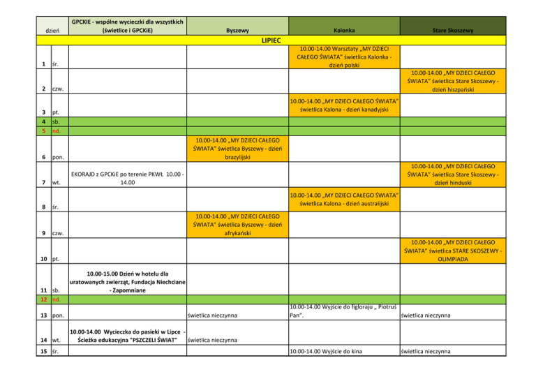 dzień GPCKIE - wspólne wycieczki dla wszystkich (świetlice i GPCKiE) Byszewy Kalonka Stare Skoszewy LIPIEC 1 2 3 4 5 6 7 8 9 10.00-14.00 Warsztaty „MY DZIECI CAŁEGO ŚWIATA” świetlica Kalonka dzień polski śr. 10.00-14.00 „MY DZIECI CAŁEGO ŚWIATA” świetlica Stare Skoszewy dzień hiszpański czw. 10.00-14.00 „MY DZIECI CAŁEGO ŚWIATA” świetlica Kalona - dzień kanadyjski pt. sb. nd. 10.00-14.00 „MY DZIECI CAŁEGO ŚWIATA” świetlica Byszewy - dzień brazylijski pon. wt. 10.00-14.00 „MY DZIECI CAŁEGO ŚWIATA” świetlica Stare Skoszewy dzień hinduski EKORAJD z GPCKiE po terenie PKWŁ 10.00 14.00 10.00-14.00 „MY DZIECI CAŁEGO ŚWIATA” świetlica Kalona - dzień australijski śr. 10.00-14.00 „MY DZIECI CAŁEGO ŚWIATA” świetlica Byszewy - dzień afrykański czw. 10.00-14.00 „MY DZIECI CAŁEGO ŚWIATA” świetlica STARE SKOSZEWY OLIMPIADA 10 pt. 11 sb. 12 nd. 13 pon. 14 wt. 15 śr. 10.00-15.00 Dzień w hotelu dla uratowanych zwierząt, Fundacja Niechciane - Zapomniane świetlica nieczynna 10.00-14.00 Wyjście do figloraju „ Piotruś Pan”. świetlica nieczynna 10.00-14.00 Wycieczka do pasieki w Lipce Ścieżka edukacyjna "PSZCZELI ŚWIAT" świetlica nieczynna 10.00-14.00 Wyjście do kina świetlica nieczynna 16 czw. 10.00-15.00 Pałac Poznańskich – zwiedzanie i warsztaty w Galerii Mistrzów Polskich 17 pt. 18 sb. 19 nd. świetlica nieczynna 10.00-14.00 warsztaty decoupage świetlica nieczynna 20 pon. świetlica nieczynna 10.00-14.00 Zajęcia techniczno – plastyczne. Zabawa z masą solną świetlica nieczynna 10.00-14.00 Zajęcia kulinarne świetlica nieczynna świetlica nieczynna 10.00-14.00 warsztaty decoupage świetlica nieczynna 17.00-21.00 świetlica nieczynna 10.00 - 14.00 17.00-21.00 świetlica nieczynna świetlica nieczynna 10.00 - 14.00 świetlica nieczynna świetlica nieczynna 10.00 - 14.00 10.00-14.00 Zajęcia plastyczno– tech. tworzenie biżuterii 10.00 - 14.00 10.00 - 14.00 21 wt. EKORAJD z GPCKiE po terenie PKWŁ 10.00 14.00 świetlica nieczynna 22 śr. 30 31 Ogród Botaniczny – zwiedzanie i warsztaty w skansenie, ognisko z kiełbaskami w czw. Gpckie pt. sb. nd. pon. 10.00-14.00 Wyjazd do Łodzi - Warsztaty ceramiczne w INDYGO - pracownia wt. ceramiczna Piotrkowska Off śr. 10.00-15.00 Muzeum Kinematografii, Park czw. Źródliska, Palmiarnia pt. 1 2 sb. nd. 3 4 pon. wt. 23 24 25 26 27 28 29 17.00-21.00 Święto pszczoły-impreza plenerowa dla dzieci ( i nie tylko …) 17.00-21.00 17.00-21.00 5 śr. 10.00-14.00 Zajęcia techniczno – plastyczne „Wakacje” 6 czw. 10.00-14.00 Gry i zabawy edukacyjne 7 8 9 10 11 12 13 14 15 16 17 18 19 20 21 22 23 24 25 pt. sb. nd. pon. wt. śr. czw. pt. sb. nd. pon. wt. śr. czw. pt. sb. nd. pon. wt. 17.00-21.00 pt. sb. nd. pon. 10.00 - 14.00 wyjazd młodzieży do Resortu Piaseczno wyjazd młodzieży do Resortu Piaseczno wyjazd młodzieży do Resortu Piaseczno wyjazd młodzieży do Resortu Piaseczno wyjazd młodzieży do Resortu Piaseczno wyjazd młodzieży do Resortu Piaseczno wyjazd młodzieży do Resortu Piaseczno wyjazd młodzieży do Resortu Piaseczno wyjazd dzieci do Ustronia Morskiego wyjazd dzieci do Ustronia Morskiego wyjazd dzieci do Ustronia Morskiego wyjazd dzieci do Ustronia Morskiego wyjazd dzieci do Ustronia Morskiego wyjazd dzieci do Ustronia Morskiego wyjazd dzieci do Ustronia Morskiego wyjazd dzieci do Ustronia Morskiego 17.00 - 21.00 26 śr. 27 czw. 28 29 30 31 10.00-14.00 Zajęcia na powietrzu – gry i zabawy ruchowe usprawniające motorykę. 17.00 - 21.00 10.00-14.00 warsztaty decoupage 10.00-14.00 Zawody sportowe na boisku w Kopance 10.00-14.00 gry i zabawy stolikowe 10.00-14.00 Ognisko i dyskoteka na zakończenie wakacji 10.00 - 14.00 10.00 - 14.00 DOŻYNKI GMINNE 17.00 - 21.00 10.00 - 14.00