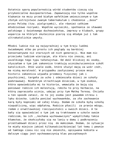 Ostatnio sporą popularnością wśród studentów cieszą się przykościelne duszpasterstwa. Zapewniają nie tylko wspólne klękanie na mszy przed białym wafelkiem umieszczonym w tym złotym ustrojstwie zwanym tabernakulum i chodzenie ,,boso” przez Polskę (tzw. pielgrzymki), ale również całkiem młodzieżowe rozrywki. Wspólne wycieczki, spotkania ze sławami polskiego i światowego duchowieństwa, imprezy w klubach, grupy wsparcia na których skutecznie pierzę się młodym już i tak ultrakatolickie umysły. Młodzi ludzie nie są najwyraźniej w tym kraju ludźmi świadomymi albo po prostu ich poglądy są bardziej konserwatywne niż starszych od nich generacji. Nie mam nic przeciwko ludziom wierzącym, ale kleru nie znoszę, ani wszelkiego tego typu tałatajstwa. Od dość bliskiej mi osoby, słyszałam o tym jak zakonnice traktują uczniów/uczennice szkół katolickich. Otóż wiele osób, które służyć mają za wzór cnót, ma niską moralność. W przypadku zasłyszanej przeze mnie historii zakonnica używała przemocy fizycznej jak i psychicznej, targała za ucho i ośmieszała dzieci ze szkoły podstawowej. Niektórym strachliwym dzieciom, w tym osobie, która opowiedziała mi te historie, wmawiała że boją się ponieważ rodzice ich molestują, robiła to przy herbacie, na którą zapraszała ucznia, udając przy tym Matkę Teresę. Chciała w ten sposób zataić, że to jej osoba jest powodem stresu i lęku dziecka. Lubiła poniżać wychowanków, za złe zachowanie karą były kopniaki od całej klasy. Dodam że szkoła byłą szkołą niepubliczną, więc odpłatną. Rodzice płacili za pranie mózgu, rodem z orwellowskiej rzeczywistości u swoich dzieci. A te bały się opowiedzieć o tym jak są traktowane w szkole swoim rodzicom, bo ich ,,kochana wychowawczyni” wymyśliłaby takie kłamstwo, że skończyłoby się na laniu w domu i podkręceniu prześladowań dzieci przez nią do maksimum. Dodam, że sytuacje te miały miejsce jakieś kilkanaście/dziesięć lat temu i pewnie od tamtego czasu nic się nie zmieniło, opisywana kobieta w dalszym ciągu jest wychowawczynią klas początkowych katolickiej szkoły podstawowej. Trochę odeszłam od tematu, ale ten przypadek jest istotny, pokazuję pierwszy etap indoktrynacji, początek prawicowej choroby zwanej znieczulicą społeczną. Nie dziwi fakt umiłowania do hierarchii, przejawy nietolerancji i niechęć do pomocy potrzebującym u polskiej młodzieży w dzisiejszych czasach. Osobiście mam bardzo religijnego znajomego, należącego do duszpasterstwa, udzielającego się aktywnie. Na kogo głosuję? Na KNP rzecz oczywista, mimo że Chrystus o którego naukach często wspomina był typowym socjalistą. Twierdzi, że: ,,Każdyprzecieżmożezałożyćfirmę,niktnikomuniebroni.”Pewnie, na pewno męczennicy/czki chrystusowi zostaną wtedy nauczycielami/kami, pielęgniarzami/kami czy pracownikami/cami w domniemanych przedsiębiorstwach. Wniosek każdemu, kto to przeczyta niewątpliwie nasuwa się taki, że młodzież polska jest prawicowa. Wynika to nie tylko z sinusoidy politycznej, ale i z indoktrynacji, do której Kościół Katolicki przyczynia się, dzięki swojej wszechobecności w naszym kraju. Istnieją osoby wierzące realizujące swoje chrześcijaństwo w ten pozytywny sposób, poprzez dobre uczynki. Większość katolików to jednak ludzie nie zdolni do samodzielnego myślenia, poddawani praniu mózgu od najmłodszych lat. Chodzących do kościoła, bo wszyscy tak robią. Należących do duszpasterstw, bo wszyscy inni studenci z otoczenia należą. Nie rozumiejących, że chodzi w tym głównie o indoktrynację, a integracja jest przy okazji, jest tylko narzędziem. Sekta działa jak sekta. Nikt tu nic nie robi bezinteresownie. Grupy wsparcia są, żeby umocnić w delikwencie ślepą wiarę, animator jest zwykłym praczem mózgu. Integracja wiernych ma posłużyć jako sposób oddalenia osoby od znajomych ateistów. Msze służą głównie do wciskania poglądów na sprawy polityczne i społeczne duchownego do głów młodych ludzi. Dziwne spotkania organizowane dla młodzieży np. odnowa w duchu świętym, mają służyć podtrzymywania wiary w zabobony, poprzez efekt placebo. Innymi słowy, jeśli nie oddzielmy wspólnymi siłami Kościoła od państwa, dalej trwać będziemy w mentalnym średniowieczu.