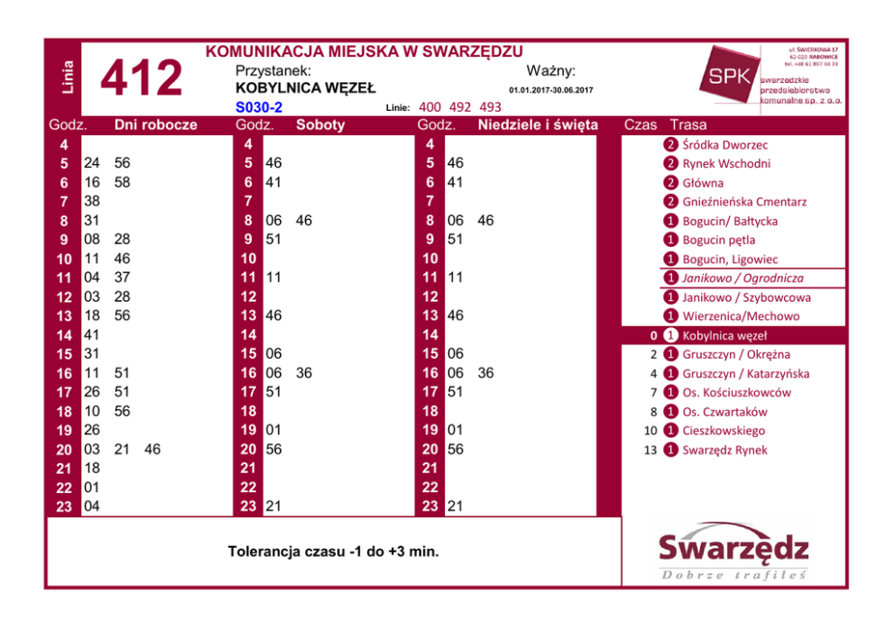 Linia Godz. 4 5 24 6 16 7 38 8 31 9 08 10 11 11 04 12 03 13 18 14 41 15 31 16 11 17 26 18 10 19 26 20 03 21 18 22 01 23 04 412 Dni robocze 56 58 28 46 37 28 56 51 51 56 21 46 KOMUNIKACJA MIEJSKA W SWARZĘDZU Przystanek: KOBYLNICA WĘZEŁ S030-2 Godz. Soboty 4 5 46 6 41 7 8 06 46 9 51 10 11 11 12 13 46 14 15 06 16 06 36 17 51 18 19 01 20 56 21 22 23 21 Ważny: 01.01.2017-30.06.2017 Linie: 400 492 Godz. 4 5 46 6 41 7 8 06 9 51 10 11 11 12 13 46 14 15 06 16 06 17 51 18 19 01 20 56 21 22 23 21 Tolerancja czasu -1 do +3 min. 493 Niedziele i święta Czas Trasa 46 36 0 2 4 7 8 10 13 ❷ Śródka Dworzec ❷ Rynek Wschodni ❷ Główna ❷ Gnieźnieńska Cmentarz ❶ Bogucin/ Bałtycka ❶ Bogucin pętla ❶ Bogucin, Ligowiec ❶ Janikowo / Ogrodnicza ❶ Janikowo / Szybowcowa ❶ Wierzenica/Mechowo ❶ Kobylnica węzeł ❶ Gruszczyn / Okrężna ❶ Gruszczyn / Katarzyńska ❶ Os. Kościuszkowców ❶ Os. Czwartaków ❶ Cieszkowskiego ❶ Swarzędz Rynek