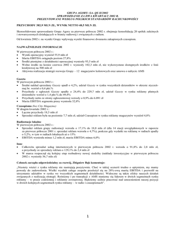 GRUPA AGORY: SA- QS II/2002 SPRAWOZDANIE ZA DWA KWARTAŁY 2002 R. PREZENTOWANE WEDŁUG POLSKICH STANDARDÓW RACHUNKOWOŚCI PRZYCHODY 382,9 MLN ZŁ, WYNIK NETTO 48,5 MLN ZŁ Skonsolidowane sprawozdanie Grupy Agory za pierwsze półrocze 2002 r. obejmuje konsolidację 20 spółek zależnych i stowarzyszonych działających w branży radiowej i związanych z radiem. Od kwietnia 2002 r. na wyniki Grupy wpływają wyniki finansowe dwunastu zakupionych czasopism. NAJWAŻNIEJSZE INFORMACJE W pierwszym półroczu 2002 r.: · Wynik operacyjny wyniósł 55,9 mln zł · Marża EBITDA osiągnęła poziom 27,8% · Środki pieniężne z działalności operacyjnej wyniosły 93,5 mln zł · Wolne środki na koniec czerwca 2002 r. wyniosły 102,3 mln zł, nie wykorzystano dostępnych środków z linii kredytowej na 500 mln zł · Aktywna realizacja strategii rozwoju Grupy – 12 magazynów kolorowych oraz umowa o nabycie AMS Gazeta W pierwszym półroczu 2002 r.: · Średni nakład sprzedany Gazety spadł o 4,2%, udział Gazety w rynku wszystkich dzienników w okresie styczeńmaj br. wzrósł o 0,4 pkt.% · Przychody z ogłoszeń Gazety spadły o 24,4% do 229,7 mln zł, udział Gazety w rynku reklamy płatnych dzienników wzrósł o 1,4 pkt.% do 49,4% · Przychody netto ze strony ogłoszeniowej wzrosły o 0,9% do 6.091 zł · Marża EBITDA segmentu prasy wyniosła 32,8% Czasopisma (bez City Magazine) W drugim kwartale 2002 r.: · Łączne przychody 18,5 mln zł · Sprzedaż reklam była na poziomie 7,7 mln zł, udział Czasopism w rynku reklamy magazynów wyniósł 4,8% Radiostacje lokalne W pierwszym półroczu 2002 r.: · Sprzedaż reklam grupy radiostacji wzrosła o 17,1% do 18,8 mln zł (dla 14 stacji uwzględnionych w raporcie za pierwsze półrocze 2001 r. sprzedaż reklam wzrosła o 4,7%), podczas gdy wydatki na reklamę w radiach spadły o 5,2%, w tym w radiach lokalnych aż o 15% · EBITDA wyniosła minus 1,2 mln zł, marża EBITDA minus 6,0% Inne · Całkowita sprzedaż usług internetowych w pierwszym półroczu 2002 r. wzrosła o 91,8% do 2,8 mln zł, a przychody ze sprzedaży reklam o 129,1% do 2,4 mln zł · W marcu rozpoczął się kolejny etap rozbudowy nowej siedziby (nakłady inwestycyjne w pierwszym półroczu 2002 r. wyniosły 56,7 mln zł) Członek zarządu odpowiedzialny za rozwój, Zbigniew Bąk komentuje: „Niestety wieści z rynku reklamy nie nastrajają pozytywnie. Choć w takiej scenerii trudno o optymizm, my mamy powody do zadowolenia. Wielki wysiłek całego zespołu przełożył się na 28%-ową marżę EBITDA i pozwolił na utrzymanie udziałów w rynku we wszystkich segmentach działalności. Widoczne są także efekty naszych działań związanych z realizacją strategii. Rośniemy i po transakcji z AMS staniemy się liderem w dwóch segmentach rynku reklamy – w prasie codziennej i reklamie zewnętrznej. Będziemy usilnie pracować nad umocnieniem naszej pozycji w dwóch kolejnych segmentach rynku reklamy – w radio i czasopismach”. 1 Dane dotyczące wydatków na reklamę podawane w treści niniejszego sprawozdania są szacowane przez Agorę – uwzględniają poziom średniego rabatu i podawane są w cenach bieżących. Jako podstawę do szacunków użyto wydatków cennikowych z następujących źródeł: monitoringi AGB Polska, CR Media, Agora Monitoring. Dane dotyczące wydatków na reklamę w magazynach – na podstawie magazynów monitorowanych przez Agorę. CZYNNIKI ZEWNĘTRZNE I WEWNĘTRZNE ISTOTNE DLA ROZWOJU GRUPY Wyniki finansowe i rynkowe osiągnięte przez Grupę w bardzo trudnych warunkach świadczą o tym, że nasza strategia działania w czasie recesji na rynku reklamy i jej konsekwentne wdrażanie przyniosły wymierne efekty. Co prawda przychody Grupy (bez radiostacji i czasopism) w pierwszym półroczu 2002 r. spadły o 13,9%, jednak dzięki efektywnej polityce ograniczania kosztów wskaźnik rentowności operacyjnej (marża EBITDA Grupy bez radiostacji i czasopism) utrzymał się na wysokim poziomie 28,7%. Grupa wygenerowała 93,5 mln gotówki z działalności operacyjnej. Grupa odnotowała pierwsze znaczące sukcesy w realizacji strategii dywersyfikacji: poszerzyła działalność wydawniczą poprzez przejęcie 12-tu magazynów kolorowych, oraz zawarła umowę o nabycie lidera na rynku reklamy zewnętrznej w Polsce. Sytuacja gospodarcza w Polsce i rynek reklamowy Według szacunków wzrost PKB w drugim kwartale br. wyniósł 0,7-1,0%, a stopa bezrobocia utrzymywała się na bardzo wysokim poziomie 17,3%. Recesja na rynku reklamy trwa. Wbrew naszym przewidywaniom rynek nie osiągnął dna w pierwszym kwartale br. Drugi kwartał br., choć sezonowo nieco lepszy od poprzedniego, przyniósł dalsze spadki we wszystkich mediach. Według szacunków Agory łączne wydatki na reklamę w drugim kwartale 2002 r. spadły o 14,2% w stosunku do drugiego kwartału 2001 r., przychody z reklam w telewizji obniżyły się o 8,5%, w prasie o 22,3%, w radiu o 6,0%, a w reklamie zewnętrznej o 13,1%. Analizując rynek reklamy w drugim kwartale br. nie sposób nie zauważyć wyższych niż w pierwszym kwartale br. spadków w sektorach telewizyjnym i reklamy zewnętrznej. Spadki te częściowo tłumaczone są wprowadzeniem we wrześniu 2001 r. ograniczeń reklamy piwa. Tego typu kampanie reklamowe są szczególnie intensywne w drugim i trzecim kwartale roku. W pierwszym półroczu 2002 r. wartość rynku reklamy w Polsce zmniejszyła się o 14,4% w stosunku do zeszłego roku. Wpływy z reklamy w telewizji spadły o 7,5%, w prasie o 24,1%, w radiu i reklamie zewnętrznej odpowiednio o 5,2% i 8,9%. Nie zelżała również presja rabatowa stosowana przez media w celu przyciągnięcia klientów. Wprost przeciwnie, w drugim kwartale br. wojna cenowa znacznie się nasiliła. Nadal najtańszy koszt dotarcia oferuje telewizja, która przoduje w wielkości udzielanych rabatów. Średnie upusty w tym medium sięgają już ponad 60%. Recesja reklamowa spowodowała również konsol
