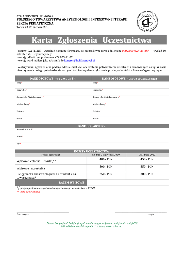 XVII SYMPOZJUM NAUKOWE POLSKIEGO TOWARZYSTWA ANESTEZJOLOGII I INTENSYWNEJ TERAPII SEKCJA PEDIATRYCZNA Toruń, 24-26 czerwca 2010 Karta Zgłoszenia Uczestnictwa Prosimy CZYTELNIE wypełnić poniższy formularz, ze szczególnym uwzględnieniem OBOWIĄZKOWYCH PÓL* i wysłać Do Sekretariatu Organizacyjnego: - wersję pdf – faxem pod numer +22 825-91-52 - wersję word mailem jako załącznik do [email protected] Po otrzymaniu zgłoszenia na podany adres e-mail wysłane zostanie potwierdzenie rejestracji i zamówionych usług. W razie nieotrzymania takiego potwierdzenia w ciągu 14 dni od wysłania zgłoszenia, prosimy o kontakt z Biurem Organizacyjnym. DANE OSOBOWE - u c z e s t n i k DANE OSOBOWE - osoba towarzysząca Imię* Imię* Nazwisko* Nazwisko* Stanowisko / tytuł naukowy* Stanowisko / tytuł naukowy* Miejsce Pracy* Miejsce Pracy* Telefon* Telefon* e-mail* e-mail* DANE DO FAKTURY Nazwa instytucji* Adres* NIP* KOSZTY UCZESTNICTWA Rodzaj uczestnika do dnia 30 kwietnia 2010 Od 1 maja 2010 400.- PLN 450.- PLN 500.- PLN 550.- PLN 250.- PLN 300.- PLN Wpisowe członka PTAiIT / * Wpisowe uczestnika Pielęgniarka anestezjologiczna / student / os. towarzysząca/ RAZEM WPISOWE */ podpisując formularz potwierdzam fakt ważnego członkostwa w PTAiIT */ pola obowiązkowe ___________________________________________________ __________________________________________________ Data, miejsce podpis „Zielone Sympozjum”. Podejmujemy działania mające wpływ na zmniejszenie emisji CO2. Mile widziane wszelkie sugestie i postulaty w tym zakresie. Zaznacz wybrany hotel i pokój * REZERWACJA HOTELU HOTEL POK. 1-OSOBOWY ZAZNACZ POK. 2-OSOBOWY FILMAR**** 280 PLN 320 PLN POD ORŁEM*** 180 PLN BRAK REFLEKS** 150 PLN 230 PLN ETAP* 160 PLN 200 PLN ZAZNACZ DATY NOCLEGÓW OD – DO SUMA PLN RAZEM NOCLEGI PLN FORMA PŁATNOŚCI Wszelkie płatności z tytułu wpisowego, hotelu itp. winny być dokonane wraz z rejestracją uczestnictwa. Akceptujemy następujące formy płatności: PŁATNOŚĆ PRZELEWEM Wpłaty należy dokonać na konto Holiday Travel Sp. z o.o. w Banku Handlowym w Warszawie S.A. Ul. Chałubińskiego 8, 00-613 Warszawa, Konto Nr. IBAN 18 1030 1582 0000 0008 0013 0018; SWIFT BIC: CITIPLPX z dopiskiem “Impreza Nr 07/10/IS. Prosimy o przesłanie kopii (skanu) przelewu faxem lub e-mailem do: 22-825-9152 [email protected] PŁATNOŚĆ KARTĄ KREDYTOWĄ po wypełnieniu formularza prosimy o przesłanie faxem na numer: +22 825-91-52. Dolicza się 2% prowizji Polcardu PŁATNOŚĆ KARTĄ KREDYTOWĄ – MAIL ORDER NAZWA KARTY ZAZNACZ WŁAŚCIWĄ MASTERCARD EUROCARD VISA NR IDENTYFIKACYJNY NUMER KARTY NAZWISKO WŁAŚCICIELA KARTY DATA WAŻNOŚCI PODPIS MM/ RR 1. 2. Niniejszym upoważniam Holiday Travel Sp. Z o.o. do obciążenia rachunku mojej karty kredytowej kwotą w PLN jak wyżej. Jednocześnie wyrażam zgodę na wykonanie obciążenia lub zwrotu na mój rachunek kwoty w PLN wynikającej z dokonanych zmian w zamówionych usługach. Swoim podpisem potwierdzam akceptację powyższych warunków. Wyrażam zgodę na przetwarzanie moich danych osobowych dla potrzeb realizacji niniejszego zgłoszenia. Komitet Organizacyjny jako administrator danych informuje, że będą one przetwarzane wyłącznie w celu niezbędnych zadań związanych z realizacją niniejszego Zgłoszenia. _________________________________ __________________________________ miejscowość, data podpis Sekretariat Sympozjum: Dział Kongresów i Konferencji Holiday Travel Sp. z o.o. ul. Nowowiejska 10, 00-653 Warszawa Telefon +22-21-00-654 fax +22-825-91-52 e-mail [email protected]