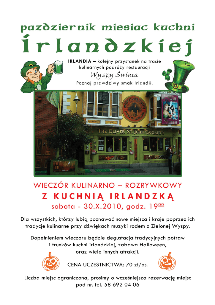 MENU PRZYSTAWKI Pickled tuna marynowany tuńczyk podany na sałacie 23 zł Shrimp from mushrooms krewetki z grzybami 3 szt. 28 zł ZUPY Soup from seafoods zupa z owocami morza (250 ml) 16 zł DANIA GŁÓWNE Dublin coddle zapiekanka ziemniaczana z dodatkiem kiełbasy i bekonu (350 g) 18 zł Iris stew gulasz z baraniny (350 g) 29 zł Iris stek stek z polędwicy wołowej owinięty boczkiem z dodatkiem sera pleśniowego podany z maślanymi ziemniakami, kapustą i porem (240 g) Shark’s stek stek z rekina podawany na grillowanych warzywach i kopytkach ze szpinaku 49 zł 49 zł DESER Słodki chleb z bakaliami 12 zł ALKOHOL Guinness (0,33 l) 8 zł Irish coffee – kawa z whisky 18 zł Bailey’s (40 ml) 12 zł Whisky (40 ml) 12 zł