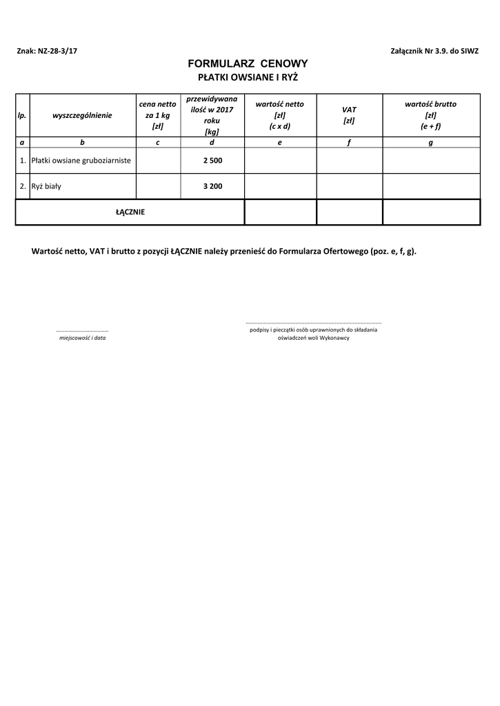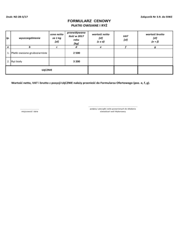 Załącznik Nr 3.9. do SIWZ Znak: NZ-28-3/17 FORMULARZ CENOWY PŁATKI OWSIANE I RYŻ lp. wyszczególnienie cena netto za 1 kg [zł] a b c przewidywana ilość w 2017 roku [kg] d 1. Płatki owsiane gruboziarniste 2 500 2. Ryż biały 3 200 wartość netto [zł] (c x d) VAT [zł] wartość brutto [zł] (e + f) e f g ŁĄCZNIE Wartość netto, VAT i brutto z pozycji ŁĄCZNIE należy przenieść do Formularza Ofertowego (poz. e, f, g). …………………………..…… miejscowość i data .......................................................................................... podpisy i pieczątki osób uprawnionych do składania oświadczeń woli Wykonawcy