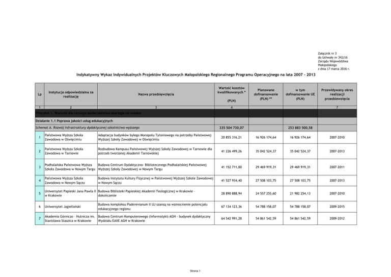 Załącznik nr 3 do Uchwały nr 342/16 Zarządu Województwa Małopolskiego z dnia 17 marca 2016 r. Indykatywny Wykaz Indywidualnych Projektów Kluczowych Małopolskiego Regionalnego Programu Operacyjnego na lata 2007 - 2013 Lp Instytucja odpowiedzialna za realizację Wartość kosztów kwalifikowanych * Nazwa przedsięwzięcia (PLN) 1 3 2 Planowane dofinansowanie (PLN) ** w tym dofinansowanie UE (PLN) 4 Przewidywany okres realizacji przedsiewzięcia 7 Priorytet 1. Warunki dla rozwoju społeczeństwa opartego na wiedzy Działanie 1.1 Poprawa jakości usług edukacyjnych Schemat A. Rozwój infrastruktury dydaktycznej szkolnictwa wyższego 335 504 730,07 253 883 500,58 1 Państwowa Wyższa Szkoła Zawodowa w Oświęcimiu Adaptacja budynków byłego Monopolu Tytoniowego na potrzeby Państwowej Wyższej Szkoły Zawodowej w Oświęcimiu 20 855 316,21 16 926 174,64 16 926 174,64 2007-2010 2 Państwowa Wyższa Szkoła Zawodowa w Tarnowie Rozbudowa Kampusu Państwowej Wyższej Szkoły Zawodowej w Tarnowie dla potrzeb tworzonej Akademii Tarnowskiej 41 226 499,26 35 042 524,37 35 042 524,37 2007-2013 3 Podhalańska Państwowa Wyższa Budowa Centrum Dydaktyczno- Bibliotecznego Podhalańskiej Państwowej Szkoła Zawodowa w Nowym Targu Wyższej Szkoły Zawodowej w Nowym Targu 41 152 711,00 29 469 919,31 29 469 919,31 2007-2011 4 Państwowa Wyższa Szkoła Zawodowa w Nowym Sączu 41 527 934,40 27 508 103,75 27 508 103,75 2007-2013 5 Uniwersytet Papieski Jana Pawła II Budowa Biblioteki Papieskiej Akademii Teologicznej w Krakowie – w Krakowie dokończenie 28 890 888,94 24 557 255,60 21 982 254,13 2007-2010 6 Uniwersytet Jagielloński 67 134 123,36 54 788 158,07 54 788 158,07 2009-2015 7 Akademia Górniczo – Hutnicza im. Budowa Centrum Komputerowego (Informatyki) AGH - budynek dydaktyczny Stanisława Staszica w Krakowie Wydziału EAIiE AGH w Krakowie 64 542 991,28 54 861 542,59 54 861 542,59 2009-2012 Budowa Instytutu Kultury Fizycznej w Państwowej Wyższej Szkole Zawodowej w Nowym Sączu Budowa kompleksu Paderevianum II UJ szansą na wzmocnienie potencjału edukacyjnego regionu Strona 1 Lp Instytucja odpowiedzialna za realizację Nazwa przedsięwzięcia 1 2 3 Wartość kosztów kwalifikowanych * (PLN) Planowane dofinansowanie (PLN) ** w tym dofinansowanie UE (PLN) 4 Przewidywany okres realizacji przedsiewzięcia 7 8 Uniwersytet Papieski Jana Pawła II Modernizacja, z uwzględnieniem potrzeb studentów z niepełnosprawnością, w Krakowie Budynku Franciszkańska 1 1 255 999,58 1 061 947,64 1 061 947,64 2012-2014 9 Uniwersytet Pedagogiczny w Krakowie Przebudowa, modernizacja i remont auli wraz z wykonaniem sieci strukturalnej (LAN) w budynku dydaktycznym Uniwersytetu Pedagogicznego przy ul. Ingardena 4 w Krakowie 3 008 728,15 2 557 418,93 2 557 418,93 2010-2014 10 Uniwersytet Jagielloński Rozbudowa, przebudowa i wyposażenie budynku UJ dla potrzeb Instytutu Psychologii 24 197 533 8 230 253 8 230 253 2009-2015 11 Modernizacja infrastruktury medialno-technicznej dla potrzeb innowacyjnego Uniwersytet Papieski Jana Pawła II kształcenia i aktywizacji zawodowej w zakresie nowych mediów w w Krakowie społeczeństwie informacyjnym 1 712 004,89 1 455 204,15 1 455 204,15 2015 Schemat B. Rozwój infrastruktury kształcenia ustawicznego oraz kształcenia zawodowego 19 484 516 16 561 836 12 Województwo Małopolskie Modernizacja budynków Zespołu Szkół Ponadgimnazjalnych – Małopolska Szkoła Gościnności w Myślenicach 11 514 267,55 9 787 127,42 9 787 127,42 2011-2015 13 Gmina Miasta Tarnowa Centrum Kształcenia Budowlanego w Zespole Szkół Budowlanych w Tarnowie 3 602 615,25 3 062 222,96 3 062 222,96 2008-2014 14 Komenda Główna PSP Remont obiektów Szkoły dla potrzeb kształcenia w zawodzie strażaka oraz technika pożarnictwa - Etap I 4 367 633 3 712 486 3 712 486 2013-2015 Działanie 1.2. Rozwój społeczeństwa informacyjnego 15 Akademia Górniczo – Hutnicza im. Modernizacja ACK CYFRONET AGH - etap I Stanisława Staszica w Krakowie 16 Małopolska Sieć Szerokopasmowa Sp. z o. o. 286 236 602,16 Małopolska Sieć Szerokopasmowa Strona 2 180 422 248,94 8 392 360,25 7 129 310,03 7 129 310,03 2010-2011 127 950 214,00 63 975 107,00 54 378 840,95 2011-2015 Lp Instytucja odpowiedzialna za realizację Wartość kosztów kwalifikowanych * Nazwa przedsięwzięcia Planowane dofinansowanie (PLN) ** w tym dofinansowanie UE (PLN) Przewidywany okres realizacji przedsiewzięcia 20 554 141,08 17 471 019,92 17 471 019,92 2008-2014 (PLN) 1 2 3 Budowa zintegrowanych systemów informatycznych do zarządzania i monitoringu satelitarnego w Małopolsce 4 7 17 Województwo Małopolskie 18 Gmina Miejska Kraków Budowa systemu informatycznego do wspomagania administracji wraz z integracją zasobów bazodanowych w województwie i w powiecie 11 007 035,32 9 355 980,02 9 355 980,02 2008-2012 19 Województwo Małopolskie Wirtualne Muzea Małopolski 8 379 332,14 7 122 432,32 7 122 432,32 2010-2013 20 Komenda Wojewódzka Policji Małopolska Platforma Elektronicznej Komunikacji Policji 41 147 023,90 33 166 682,50 33 166 682,50 2010-2013 21 Województwo Małopolskie Zintegrowany system informatyczny wspomagający zarządzanie Województwem Małopolskim 8 654 561,05 7 356 376,89 7 356 376,89 2013-2015 22 Województwo Małopolskie Zintegrowany System Sterowania Ruchem w Małopolsce 8 507 627,44 7 103 026,72 7 103 026,72 2012-2015 23 Wojewoda Małopolski Rozbudowa systemu udostępniania e-usług publicznych w administracji publicznej w Małopolsce – etap I 10 075 000,00 5 037 483,00 5 037 483,00 2014-2015 24 Województwo Małopolskie Małopolski System Informacji Medycznej - projekt pilotażowy 8 238 594 7 000 000 7 000 000 2014-2015 25 Województwo Małopolskie Małopolska Karta Aglomeracyjna – system zarządzania transportem zbiorowym w Województwie Małopolskim 16 313 010 13 866 059 13 866 059 2013-2015 26 Akademia Górniczo - Hutnicza im. Małopolska Chmura Edukacyjna - projekt pilotażowy Stanisława Staszica w Krakowie