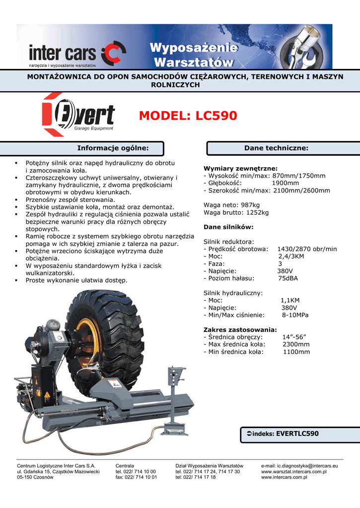 MONTAŻOWNICA DO OPON SAMOCHODÓW CIĘŻAROWYCH, TERENOWYCH I MASZYN ROLNICZYCH MODEL: LC590 Informacje ogólne: Dane techniczne: Potężny silnik oraz napęd hydrauliczny do obrotu i zamocowania koła. Czteroszczękowy uchwyt uniwersalny, otwierany i zamykany hydraulicznie, z dwoma prędkościami obrotowymi w obydwu kierunkach. Przenośny zespół sterowania. Szybkie ustawianie koła, montaż oraz demontaż. Zespół hydrauliki z regulacją ciśnienia pozwala ustalić bezpieczne warunki pracy dla różnych obręczy stopowych. Ramię robocze z systemem szybkiego obrotu narzędzia pomaga w ich szybkiej zmianie z talerza na pazur. Potężne wrzeciono ściskające wytrzyma duże obciążenia. W wyposażeniu standardowym łyżka i zacisk wulkanizatorski. Proste wykonanie ułatwia dostęp. Wymiary zewnętrzne: - Wysokość min/max: 870mm/1750mm - Głębokość: 1900mm - Szerokość min/max: 2100mm/2600mm Waga neto: 987kg Waga brutto: 1252kg Dane silników: Silnik reduktora: - Prędkość obrotowa: - Moc: - Faza: - Napięcie: - Poziom hałasu: Silnik hydrauliczny: - Moc: - Napięcie: - Min/Max ciśnienie: 1430/2870 obr/min 2,4/3KM 3 380V 75dBA 1,1KM 380V 8-10MPa Zakres zastosowania: - Średnica obręczy: 14”-56” - Max średnica koła: 2300mm - Min średnica koła: 1100mm indeks: EVERTLC590 Centrum Logistyczne Inter Cars S.A. ul. Gdańska 15, Cząstków Mazowiecki 05-150 Czosnów Centrala tel. 022/ 714 10 00 fax: 022/ 714 10 01 Dział Wyposażenia Warsztatów tel. 022/ 714 17 24, 714 17 30 tel: 022/ 714 17 18 e-mail: [email protected] www.warsztat.intercars.com.pl www.intercars.com.pl