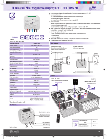 RF odbiornik: Aktor z wyjściem analogowym 0(1) - 10 V RFDAC-71B ! ! 60mm 21mm ! ! ! STEROWNIKI ! EAN kod RFDAC-71B: 8595188142809 Opis aparatu RFDAC-71B 110 - 230 V AC / 50 - 60 Hz 3 VA 1.2 W +10 /-15 % Przykład podłączenia: ściemnianie ośw. świetlówkowych z statecznikiem elektronicznym L N Przykład podłączenia: ściemniacz dużej mocy 110-230V AC 0(1)-10 V / 10 mA N L V L N 0-10V 1-10V V L N T -15 do + 50 °C dowolna * na przewodach IP 30 III. 2 CY przekrój 3 x 0.75 mm2, 2 x 2.5 mm2 90 mm 49 x 49 x 21 mm 52 g EN 60669, EN 300 220, EN 301 489 RTTE, NV nr426/2000Sb (1999/ES) siłownik T 868 MHz PROG (ON/OFF) do 200 m 20 mm 1x AgSnO2 , zwiera przewód fazowy 16A / AC1 4000VA / AC1 250V AC1 3x107 0.7x105 czerwono / zielona LED 0(1)-10V / przyciskiem PROG L N T Dane techniczne Napięcie zasilania: Pobór mocy znamionowy: Pobór mocy stratowy: Tolerancja napięcia zasilania: Analogowe napięcie / max. prąd: Sterowanie RF - przyciskiem nadajnika: Sterowanie ręczne: Zasięg na wolnej przestrzeni: Min. odległość nadaj./odbiornik: Wyjście: Prąd znamionowy: Moc łączeniowa: Łączone napięcie: Trwałość mechaniczna: Trwałość elektryczna: Sygnalizacja: Wybór trybu wyjścia: Inne dane Temperatura pracy: Pozycja pracy: Mocowanie: Ochrona IP: Napięcie izolacji: Stopień nieczystości: Podłączenie ( CY, przekrój): Długość podłączenia: Wymiary: Waga: Normy: ! przeznaczony jest do płynnej regulacji urządzeń, które sterowane są sygnałem 0 (1) - 10 V zalecane zastosowanie: - ze statecznikiem elektronicznym do ściemniania ośw. świetlówkowych - do sterowania ściemniaczy dużych mocy - do regulacji (siłowniki, zawory ogrzewania, wentylacja itd.) proste sterowanie: - krótkie naciśnięcie przycisku na nadajniku włączy/wyłączy urządzenie i ustawi napięcie wyjścia analogowego na poprzednio ustawioną wartość - długie naciśnięcie reguluje napięcie analogowego wyjścia w zakresie 0 (1) - 10 V jeden aktor może być sterowany z 32 kanałów (1 kanał oznacza 1 przycisk na bezprzew. włączniku, na pilocie breloku lub na jednostce RF Touch-W/RF Touch-B) za pomocą przycisku wykonuje się: - wybór wyjściowego napięcia 0-10 V (zielona LED) lub 1-10 V (czerwona LED) - programowanie - sterowanie ręczne RFDAC-71B: wielofunkcyjny - 7 funkcji: 6 różnych „scen świetlnych“, funkcje ON/OFF w wykonaniu do puszki instalacyjnej (np. KU 68) 24V AC L1 L2 Funkcje RFDAC-71B + DIML Załącza i ściemnia żarówki świetlówkowe. Next function Start of light Finish of light RFDAC-71B + Siłownik ALPHA AA 0-10 V Regulacja ogrzewania Settings 0-10V * Szczegółowe informacje na str. 36 Podłączenie Sygnalizacja stanu aparatu Przycisk programowania (sterowanie ręczne ON/OFF) Styk wyjściowy (L) Przewód fazowy Wyjście analogowe 0-10V Zalecany statecznik: DIML str.32 Zalecany siłownik: Siłownik ALPHA 0-10 V str.32 Przewód zerowy 31 RF_katalog_2011_zdroj.indd 31 5.9.2011 11:40:22