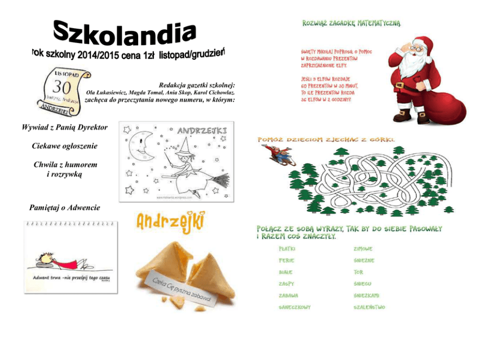 Redakcja gazetki szkolnej: Ola Łukasiewicz, Magda Tomal, Ania Skop, Karol Cichowlaz. zachęca do przeczytania nowego numeru, w którym: Wywiad z Panią Dyrektor Ciekawe ogłoszenie Chwila z humorem i rozrywką Pamiętaj o Adwencie Wywiad z Panią Dyrektor W tym wydaniu postanowiliśmy przeprowadzić wywiad z Panią Dyrektor na temat jej pracy i naszej szkoły. Redaktor: Dzień dobry! Czy moŜemy przeprowadzić z Panią wywiad do gazetki szkolnej? Pani dyrektor: Dzień dobry! Bardzo chętnie, proszę. Redaktor: Więc jak długo pracuje Pani jako pedagog? Chwila z humorem Pani pyta dzieci, kim chciałyby zostać, gdy dorosną. Prawie wszystkie chcą być biznesmenami, aktorami, kosmonautami, tylko Jasio oświadcza, Ŝe będzie Świętym Mikołajem. - A to czemu? – pyta zdziwiona pani. - Bo będę pracował tylko jeden dzień w roku. Pani dyrektor: Pracuję od 11 lutego 1991.r. w tym roku minęły 23 lata. Redaktor: Dlaczego zdecydowała się Pani na tę pracę? Pani dyrektor: Ten zawód to tradycja, w naszej rodzinie jest wielu nauczycieli. W dzieciństwie bardzo często bawiłam się w nauczycielkę. Mogę powiedzieć, Ŝe - Jasiu dlaczego wczoraj na wywiadówce była twoja babcia? – pyta pani. - Szczerze? – upewnia się Jasio. - Szczerze! - Bo jest głucha. czułam ten zawód od dzieciństwa. Redaktor: Czy kiedy była Pani w naszym wieku, myślała juŜ o pracy w szkole? Pani dyrektor: Niekoniecznie, ale po ukończeniu ósmej klasy zdecydowałam się na liceum, a potem na studium polonistyczne. Na pierwszym roku musiałam zdać szkic i zajęcia muzyczne, jeśli komuś ,,nadepnął słoń na ucho” to miał problem ze zdaniem. Redaktor: Czy cięŜka jest praca dyrektora? Pani Dyrektor: Są plusy i minusy, jest to duŜa odpowiedzialność, duŜo pracy przed egzaminami, muszę dbać o bezpieczeństwo i dobrze reprezentować szkołę. Redaktor: Czy i co chciałaby Pani zmienić w naszej szkole? Pani dyrektor: Jest duŜo rzeczy, właśnie zakończyliśmy remont łazienek, modernizujemy sale dla przedszkolaków. Plany są bardzo szerokie. Redaktor: Czy jest Pani zadowolona ze zdolności i wyników uczniów w nauce? Pani dyrektor: Czasami moŜe chciałoby się, Ŝeby było lepiej, ale ogólnie nie jest źle. Lubi się, kiedy absolwenci naszej szkoły odwiedzają nas i mówią, Ŝe w sumie nie było tak źle. Redaktor: Czy jest jeszcze coś, co chciałaby Pani powiedzieć uczniom naszej szkoły? Pani dyrektor: śyczyłabym sobie, Ŝeby wszyscy w naszej szkole czuli się dobrze i Ŝebyśmy tworzyli taką wielką rodzinę. Pani pyta Jasia: - Kiedy odrabiasz lekcje? - Po obiedzie. - W takim razie dlaczego nie masz odrobionych lekcji? - Bo nie było obiadu… Jasio pod koniec roku przychodzi do domu. Mama pyta się go: - Gdzie jest Twoje świadectwo? - PoŜyczyłem koledze, bo chciał nastraszyć rodziców. Zabawa i wieczór andrzejkowy Dnia 27.11.2014 r. w naszej szkole odbyła się zabawa andrzejkowa. Z tej okazji zaprosiliśmy wszystkich uczniów oraz nauczycieli naszej szkoły na mile spędzony czas zabawy. Nasi koledzy mogli wziąć udział we wróŜbach andrzejkowych: -LANIE WOSKU -ANDRZEJKOWE SERCE -ANDRZEJKOWA WRÓśBA Z JABŁKIEM -ANDRZEJKOWE KUBECZKI -ANDRZEJKOWE CIASTECZKA Z WRÓśBĄ Ten wieczór był pełen magii. M i k o ł a j POSTANOWIENIA ADWENTOWE k Adwent to czas oczekiwania na przyjście Jezusa, więc oczyśćmy i nasze serca na Jego powitanie. Wystarczy postanowienie, którego będziemy się trzymać do narodzin Zbawiciela, a nawet dłuŜej. J a Jak co roku w naszej szkole Mikołajki będziemy obchodzić Mikołajki. Mamy k wiadomość od Św. Mikołaja, Ŝe będzie nas odwiedzał przez cały tydzień, c o r o k w zaleŜności od godziny wychowawczej poszczególnych klas. Młodsze klasy osobiście odwiedzi Mikołaj. Mamy nadzieję, Ŝe spodobają Wam się prezenty, które wręczy Św. Mikołaj. KĄCIK SPORTOWCA Zasady głosowania: głosujemy na jednego, niŜej wymienionego polskiego sportowca, kolejność wpisujemy na bon, który jest doczepiony do gazetki. Następnie wrzuć kupon do pudełeka ustawionego przy Bibliotece. MIŁEGO GŁOSOWANIA 1. Robert Lewandowski 2. Mariusz Wlazły 3. Karol Kłos 4. Kamil Stoch 5.Justyna Kowalczyk Wyniki głosowania w kolejnym wydaniu gazetki. Spośród wszystkich wrzuconych kuponów, trzy wylosowane otrzymają nagrodę. Kiermasz ciasteczek Co jakiś czas w naszej szkole klasy gimnazjalne organizują kiermasze słodkości. Ciastka sprzedawane są przy stołówce po 2 zł. Serdecznie zapraszamy i Ŝyczymy smacznego! Ty teŜ moŜesz zostać Mikołajem JuŜ w niedzielę 30. listopada oraz 07. grudnia odbędzie się zbiórka darów w ramach charytatywnej akcji „I ty MoŜesz zostać Świętym Mikołajem”. Prosimy o przyniesienie produktów, aby pomóc potrzebującym dzieciom z Domu Dziecka w Łabuniach. Informację o przyniesionym produkcie prosimy przekazywać do wychowawców. Dary składamy do koszy ustawionych na dolnym korytarzu. ANDRZEJKOWE HISTORIE Święta to nie tylko dni wolne od pracy, to takŜe zwykłe, robocze dni poświęcone pamięci wydarzeń, rocznic, osób, zawodów czy sytuacji. O niektórych dziś juŜ nikt nie pamięta, inne wydają się reliktem zamierzchłej przeszłości, jeszcze inne, tworzone sztucznie dla potrzeby chwili, nie wzbudzają entuzjazmu. Te, w których zawarta jest część kultury ludzkości i pamięć historii narodów, przetrwały, wciąŜ kultywowane. Tak jest właśnie z Andrzejkami, które przypadają na noc z 29 na 30 listopada, w wigilię św. Andrzeja. Według dawnych wierzeń ta noc miała moc magiczną, uchylającą wrota do nieznanej przyszłości. Andrzejki, znane teŜ jako Jędrzejki - noc wróŜb dotyczących miłości i małŜeństwa, obecnie są obyczajem świeckim. Zmieniły jednak nieco charakter - dziś zarówno dziewczęta jak i chłopcy, dzieci i dorośli bawią się Ŝartobliwymi wróŜbami, najczęściej wspólnie, na organizowanych zabawach i imprezach lub kameralnych, domowych 